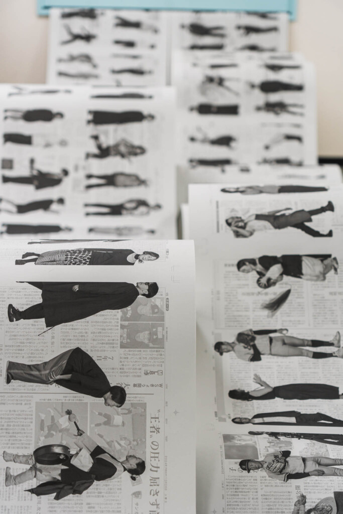 1階へ戻ると、新聞用紙に刷られた市民のポートレートが壁一面にずらりと広がっていました。背景にはその日(=撮影当日)の京都新聞が印刷されており、展示空間全体が“都市の記録媒体”のように感じられます。