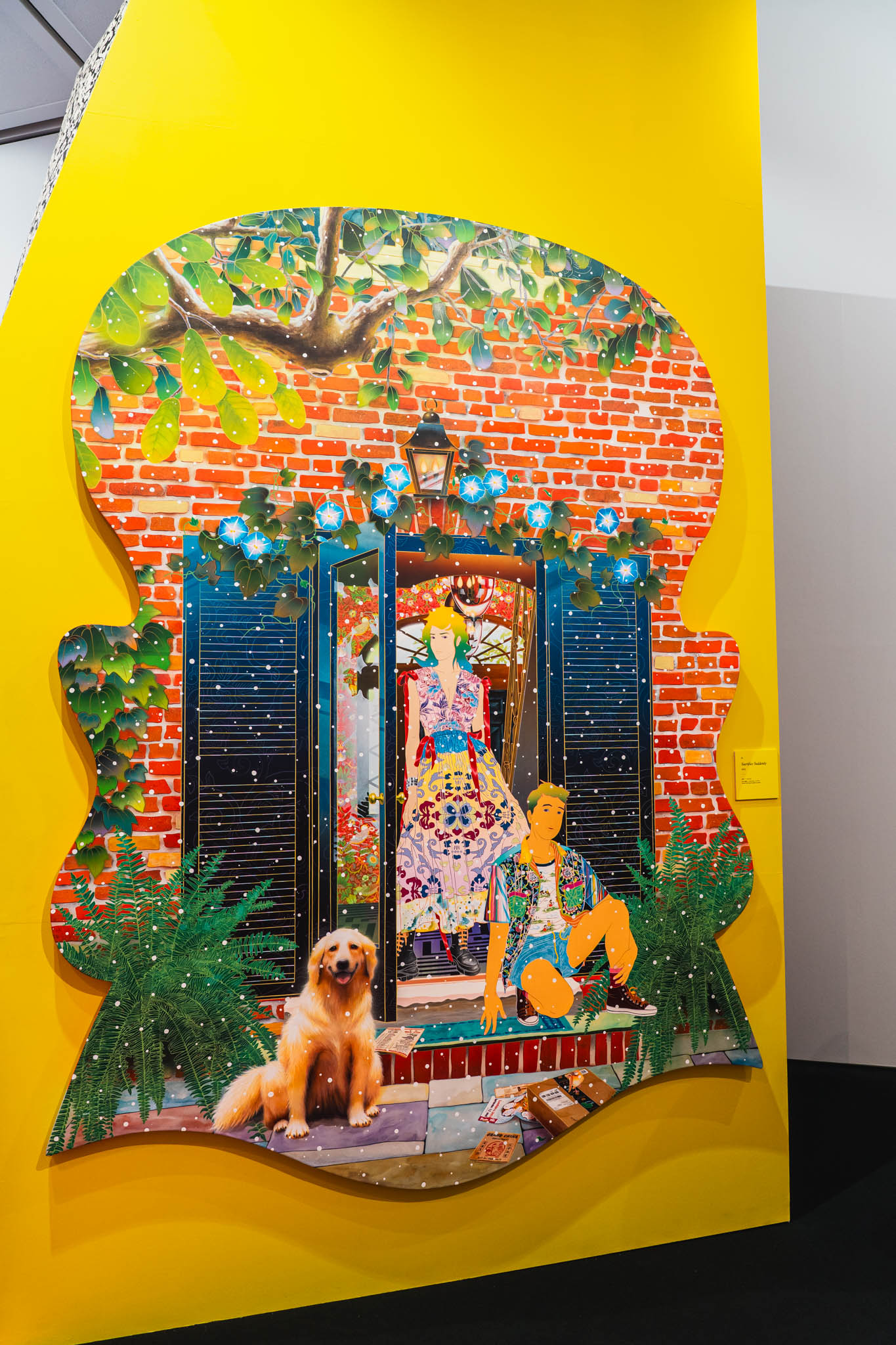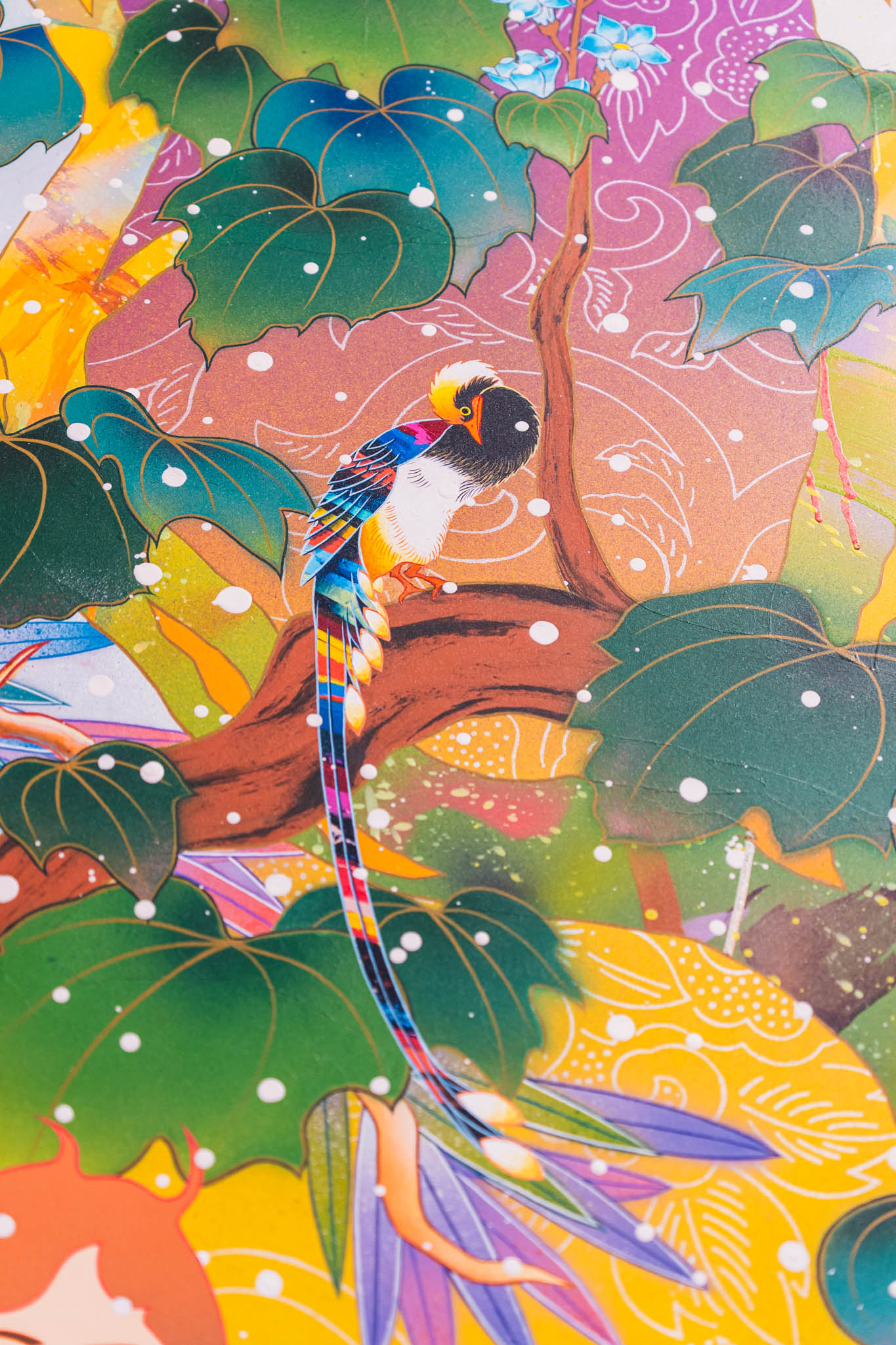 この章では、松山のキャリアにおける重要な転機となった大作《We Met Thru Match.com》(2016年)が迎えてくれます。横6メートルを超えるスケールの本作は、藤、梅、牡丹といった日本的植物、東洋風の鳥、そして幻想的なジャングル風景と人物像が混在し、絵巻のような視覚世界を展開しています。タイトルが示すように、インターネット時代の出会いとつながりをテーマにした本作は、文化的アイデンティティの交差点を象徴する作品であり、松山の作風を語る上で欠かせない一枚です。