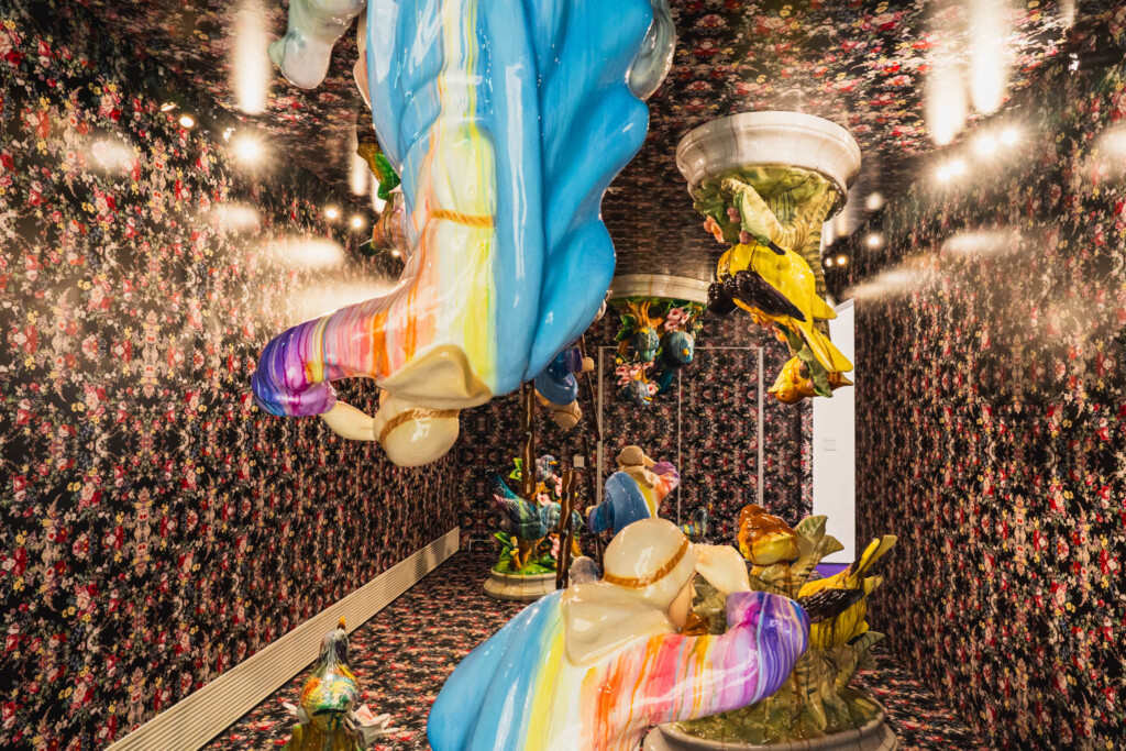 花柄の壁紙で覆われた空間に足を踏み入れると、東洋から欧米へ輸出された磁器人形が巨大彫刻として迫ってきます。松山がebayで実際に収集した19〜20世紀の磁器人形をモチーフに、天井から吊るされたり、床や壁から突き出すかたちで展示されており、その異様さと可愛らしさが同居した空間は圧巻。まるでアリスが迷い込んだ別世界のように、鑑賞者自身も作品の一部になったかのような錯覚を覚える、没入型のインスタレーションとなっています。
