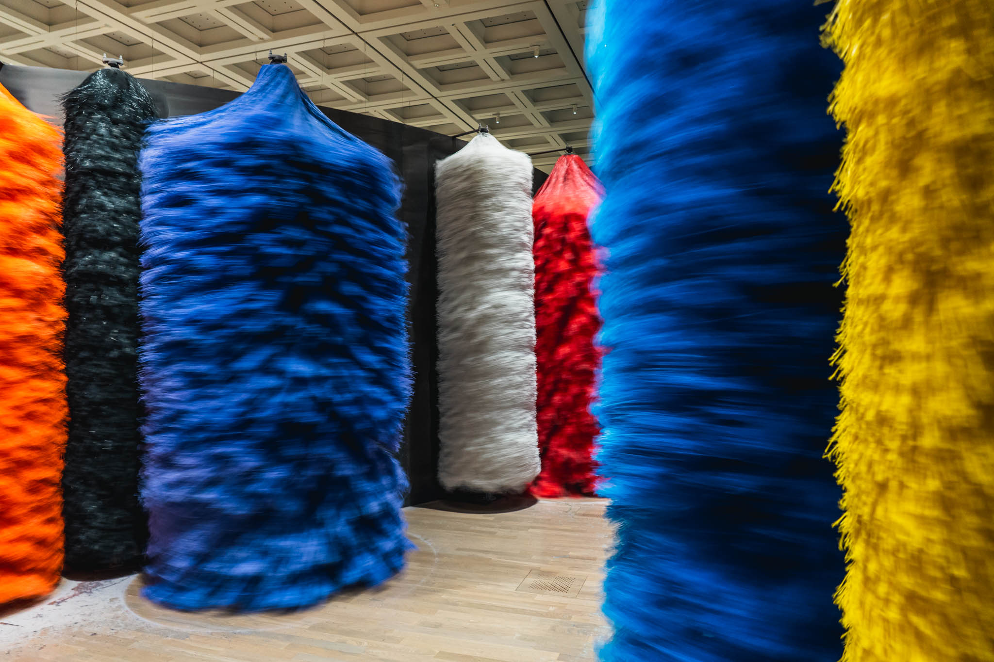 巨大な洗車機のブラシを思わせるカラフルな回転オブジェが、産業用素材とは思えないほど鮮烈な存在感を放っています。