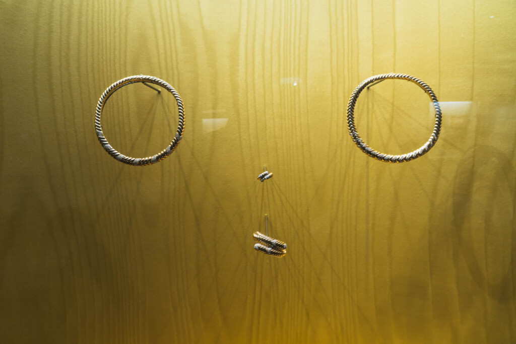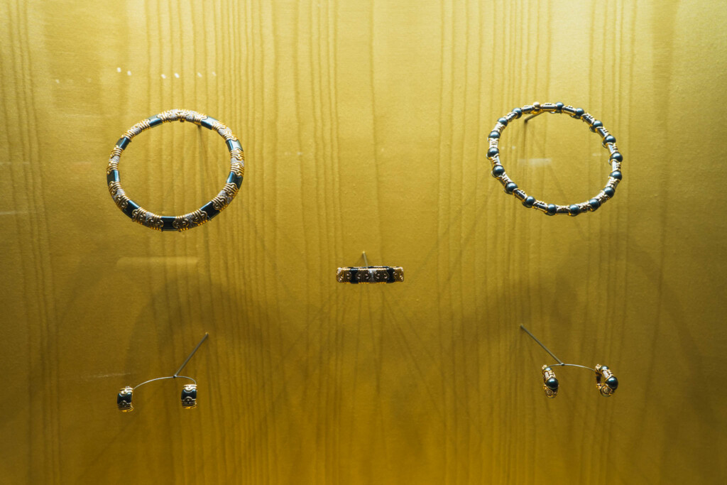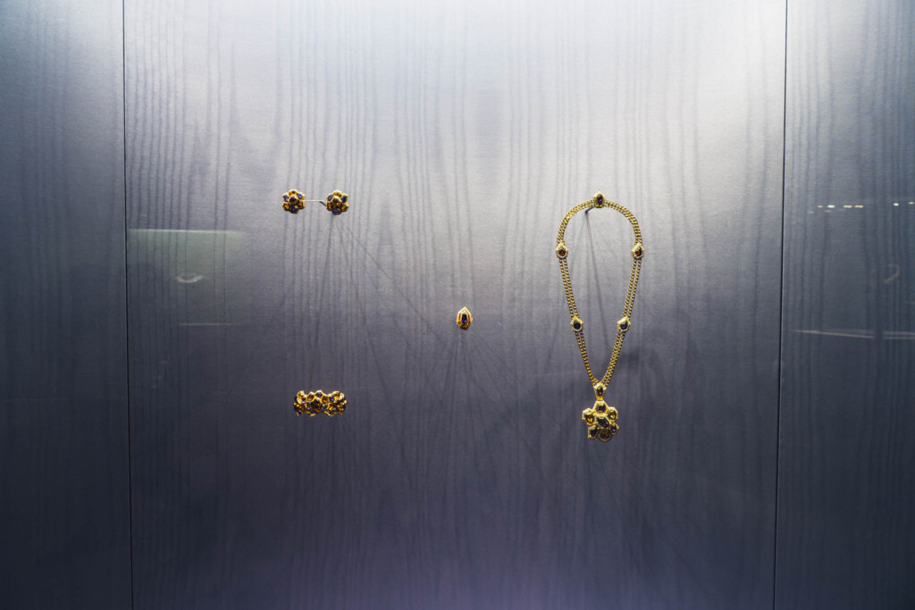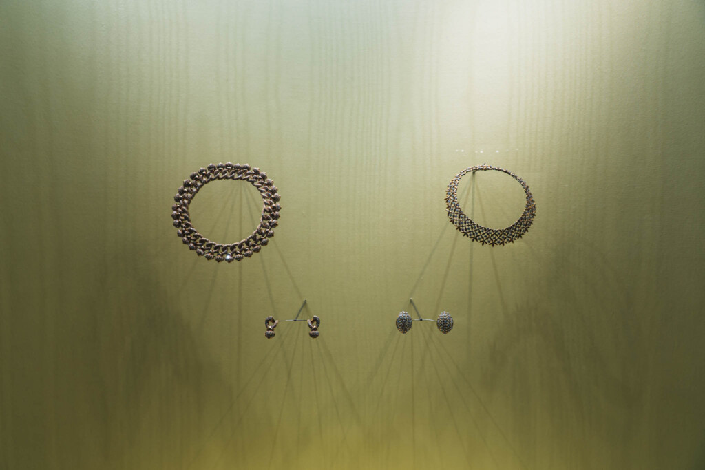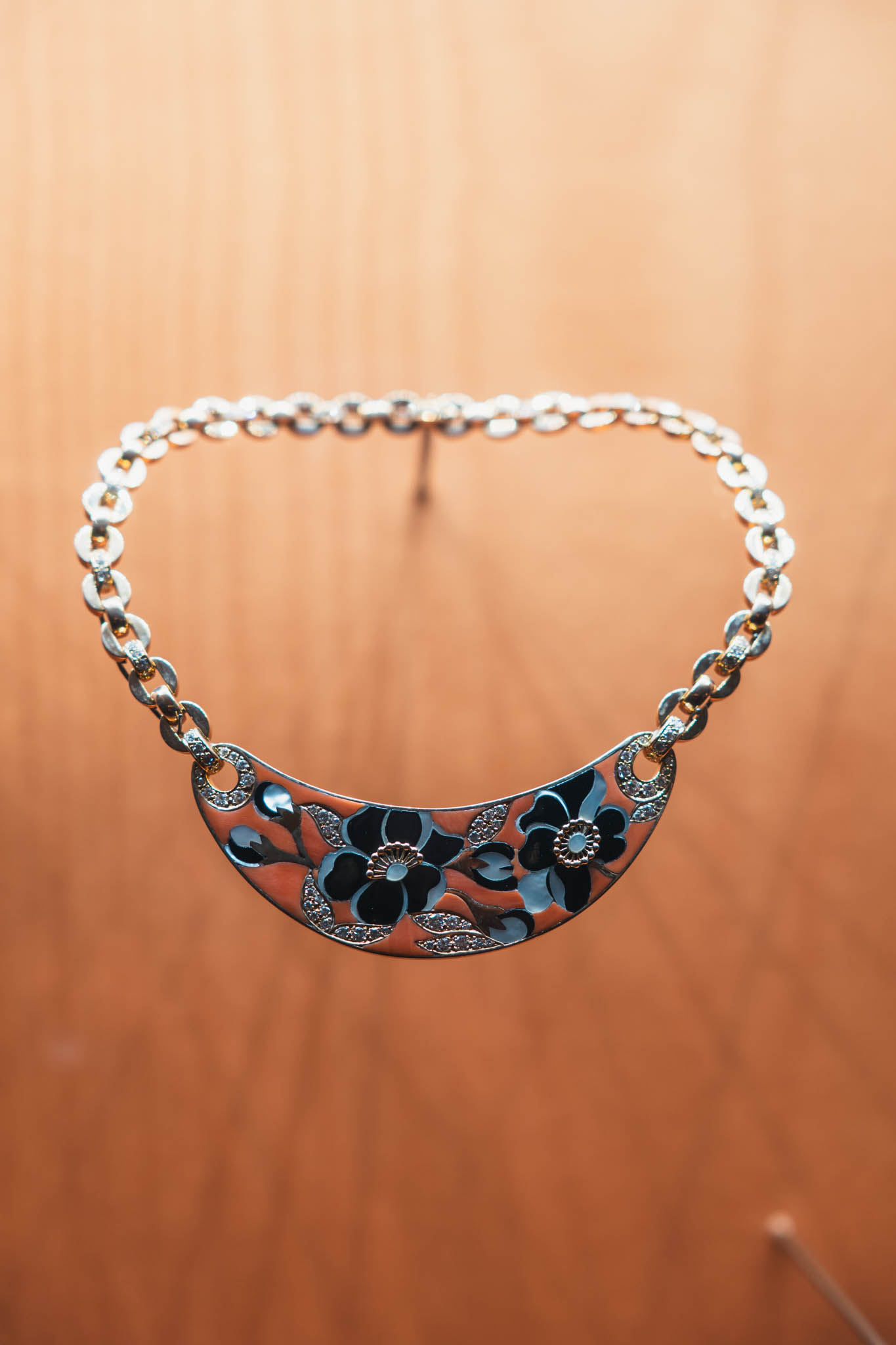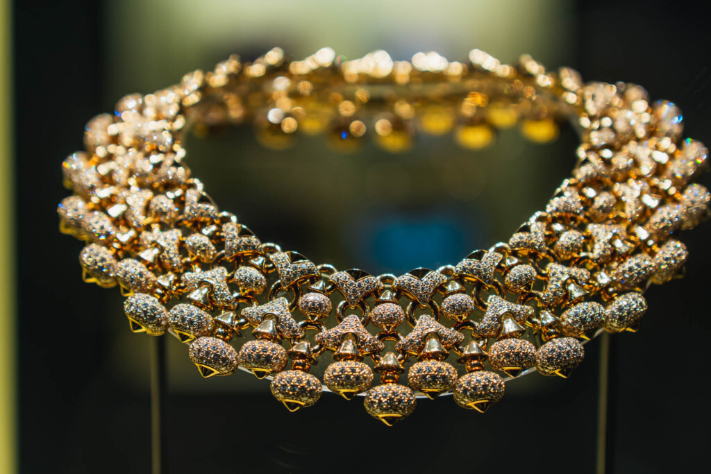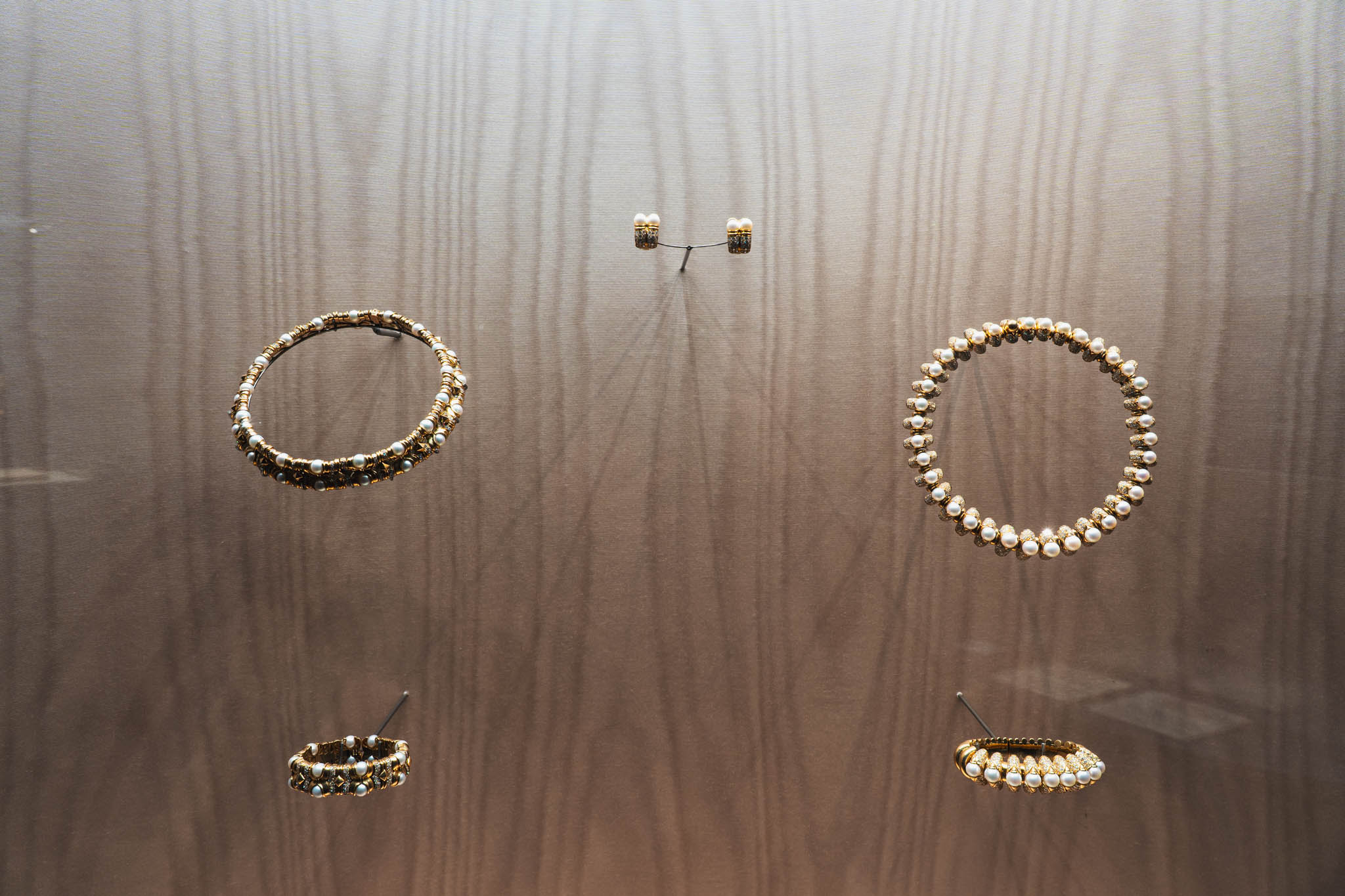 ジュエリーを横から覗くと、細かな金細工の美しさがよく見えます。