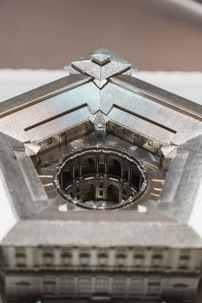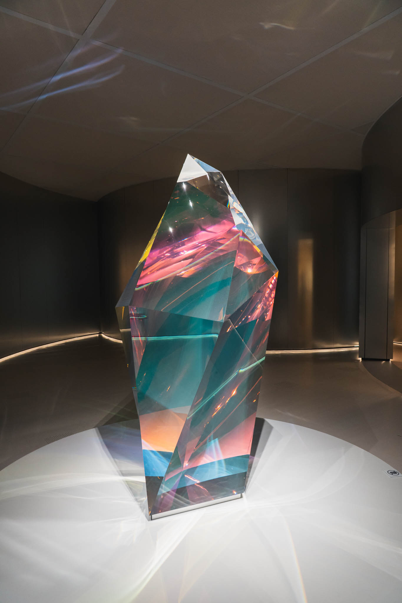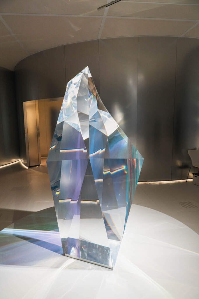 宝石の内部構造を拡大したかのようなこのオブジェも、光と影を反射し続け、