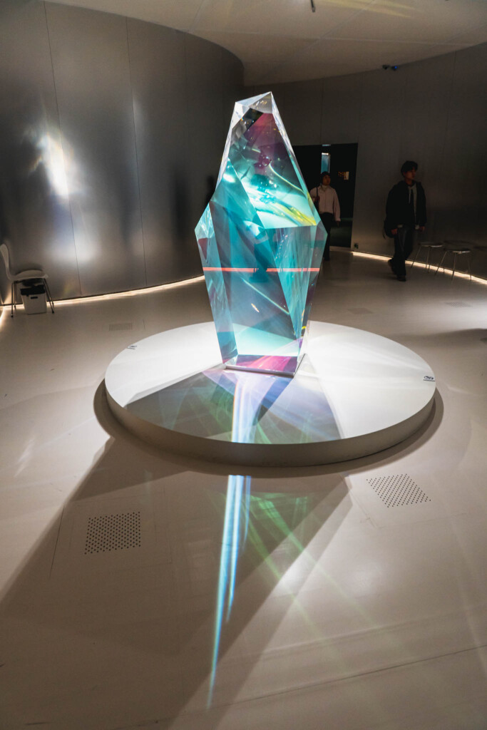 また、展示空間の中央付近には、巨大なクリスタルのような質量感を持つ彫刻的オブジェも配置され、