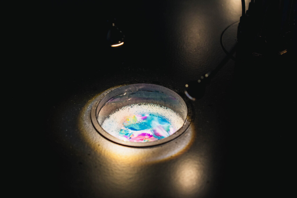 光が溶け合い、泡が浮遊し、色が脈動する様子がまるで宝石内部の光の流れを拡大したかのよう。
