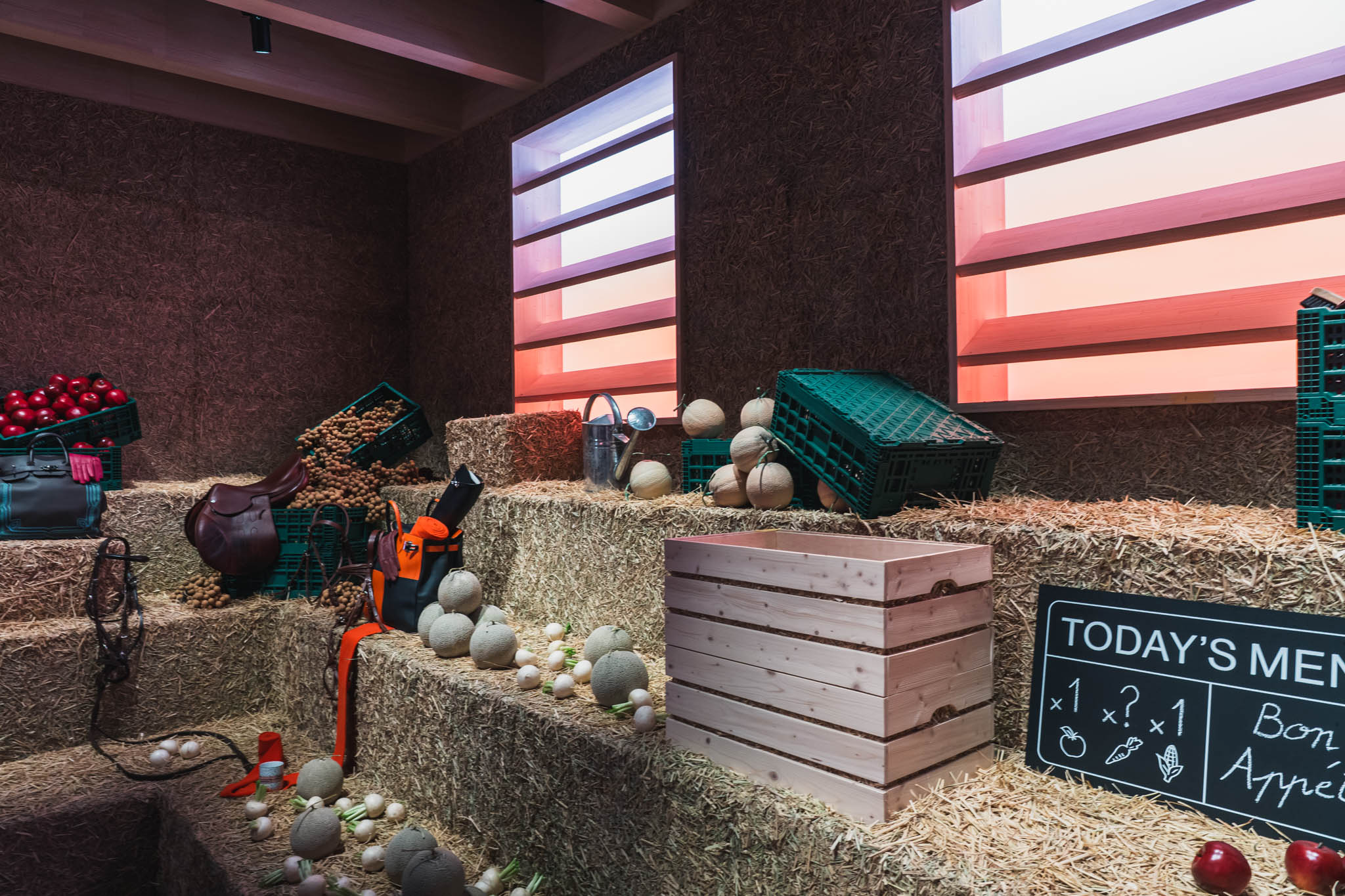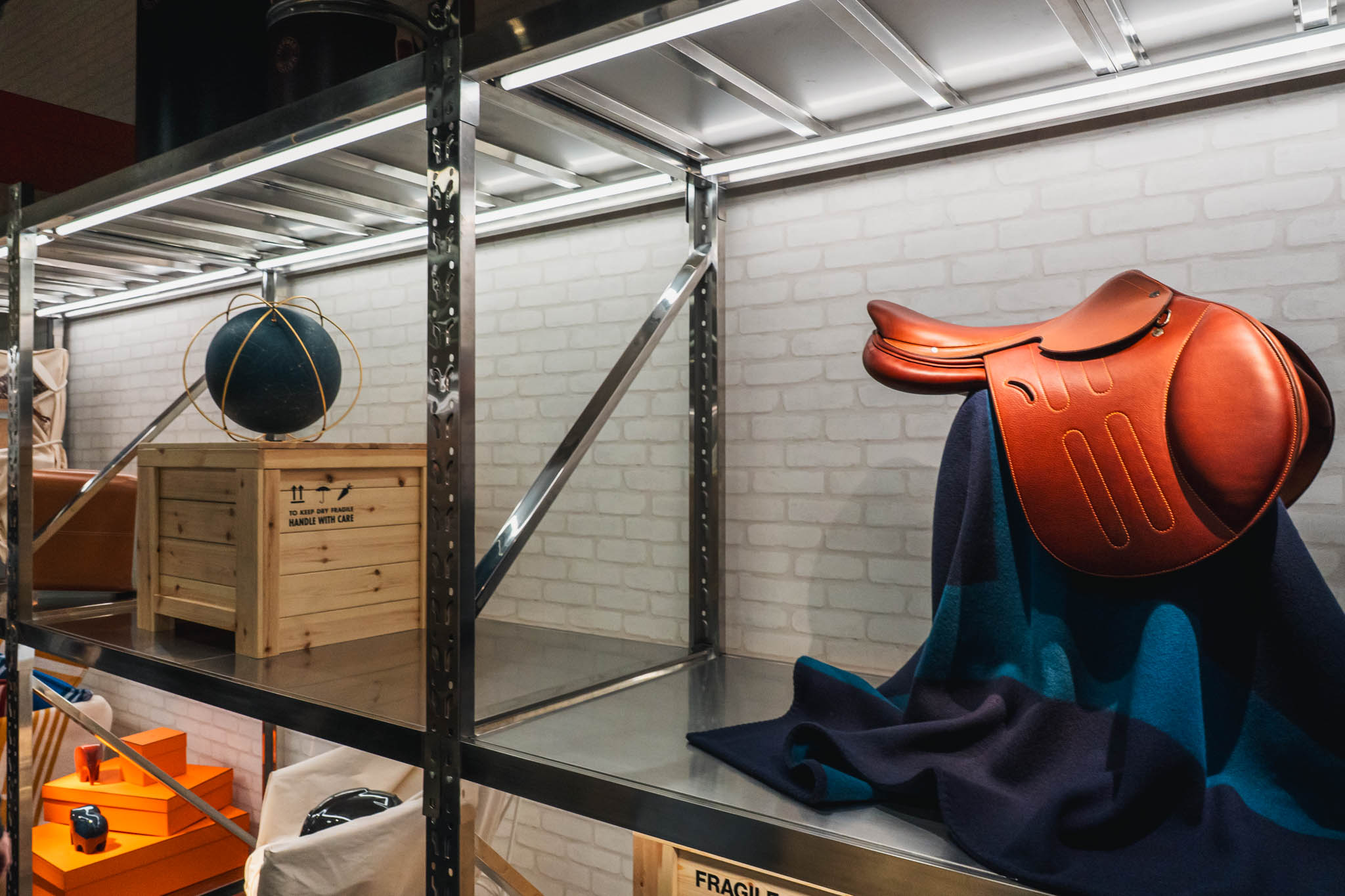 倉庫のような、でもどこかエルメスらしい端正さを感じる整頓された空間。