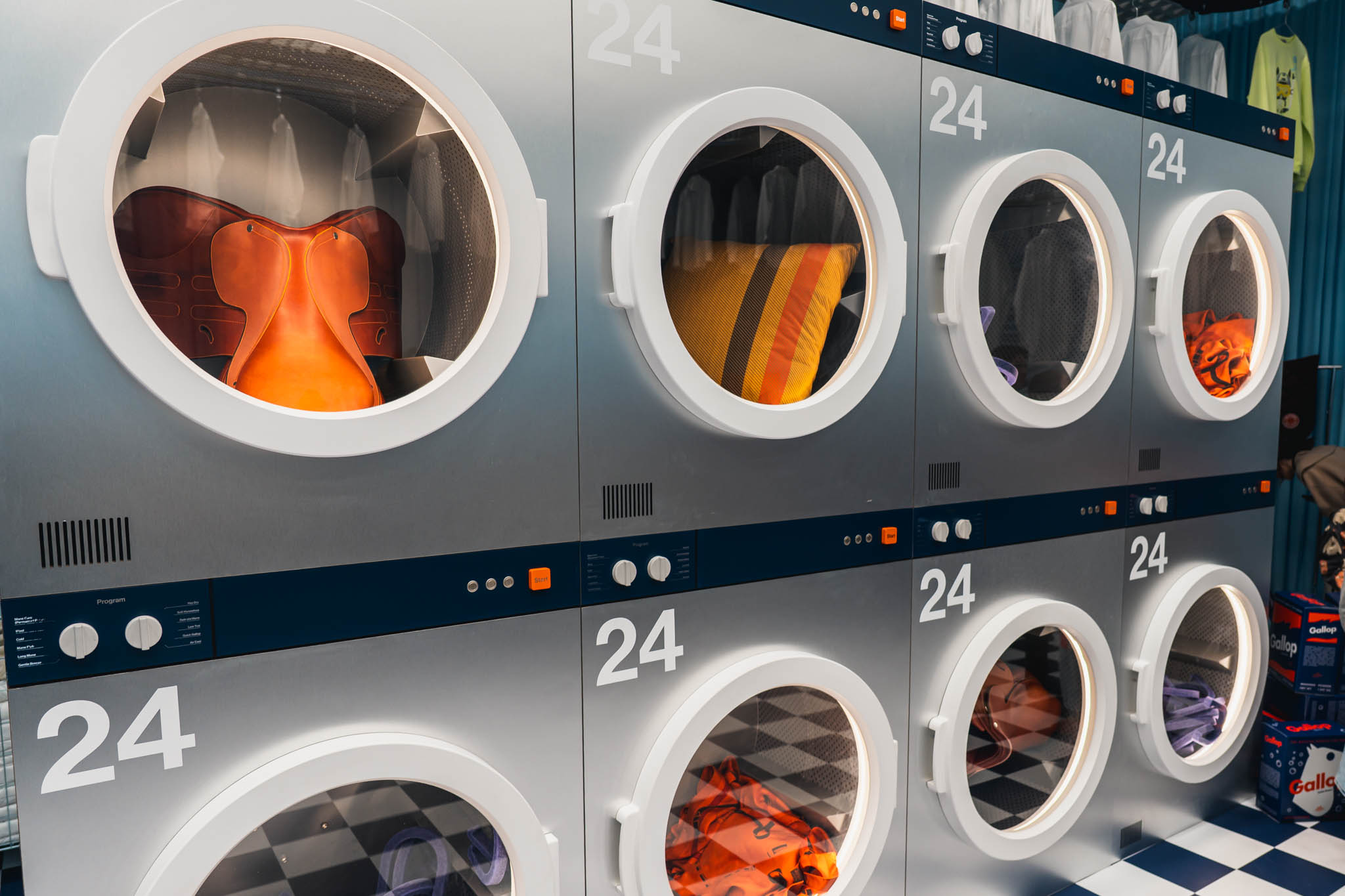 ランドリールームは、まるで本物のクリーニング店の裏側に迷い込んだような空間。