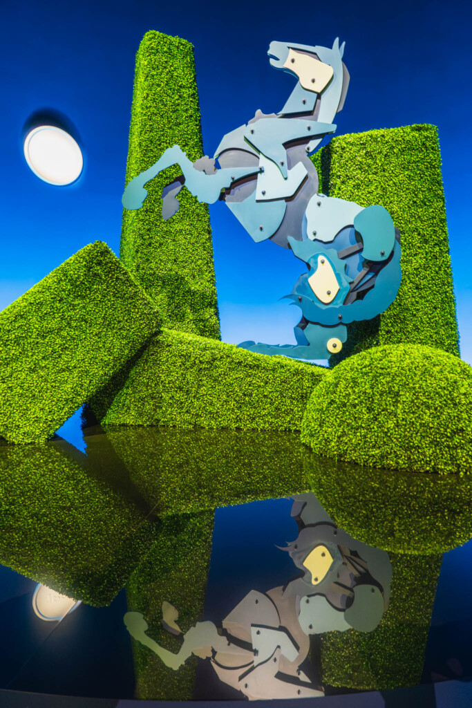 深いブルーの照明と、緑のオブジェのコントラストが美しく、