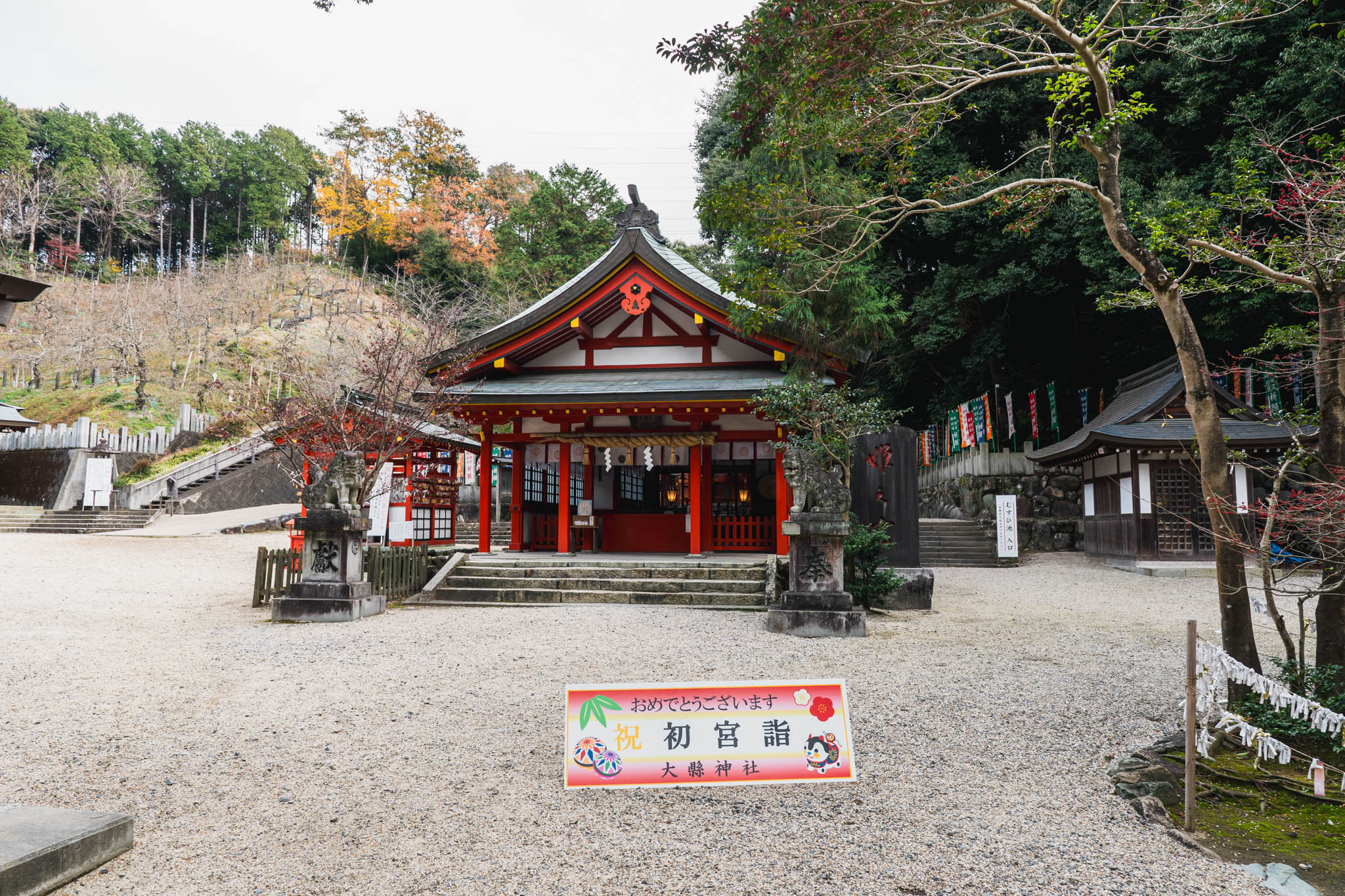 訪問日は2025年12月13日。犬山の丘陵は冬の入口にあり、空気は冷えていましたが、日差しはやわらかく、境内では落ち葉の擦れる音だけが続いていました。参道を進むにつれ、周囲の住宅地や車の音は背後に退き、社殿の前では人の気配も少なく、一定の静けさが保たれていました。