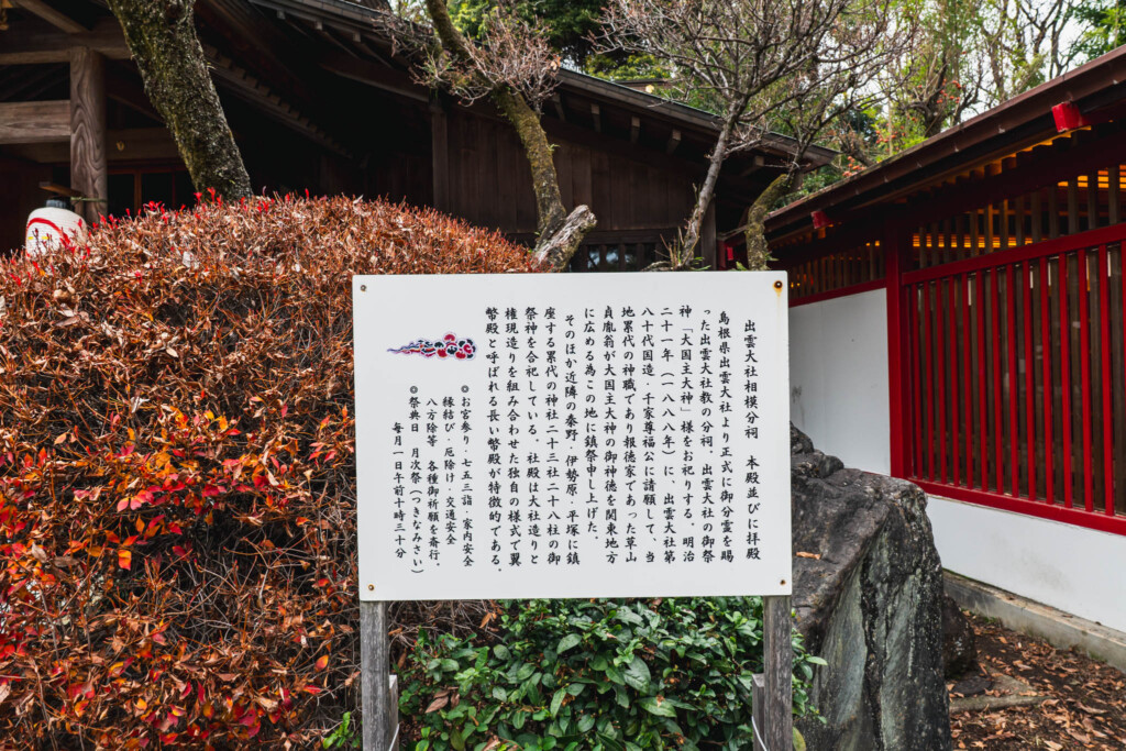 出雲大社相模分祠は、島根県出雲市に鎮座する出雲大社の御分霊を祀る神社です。創建は明治時代後期とされ、近代に入ってから相模の地に出雲信仰を伝える場として整えられました。創建の正確な年次や経緯については資料ごとに記述が異なり、特定の一説に定めることはできませんが、関東地域における出雲信仰の広がりと歩調を合わせて成立したことは共通して伝えられています。