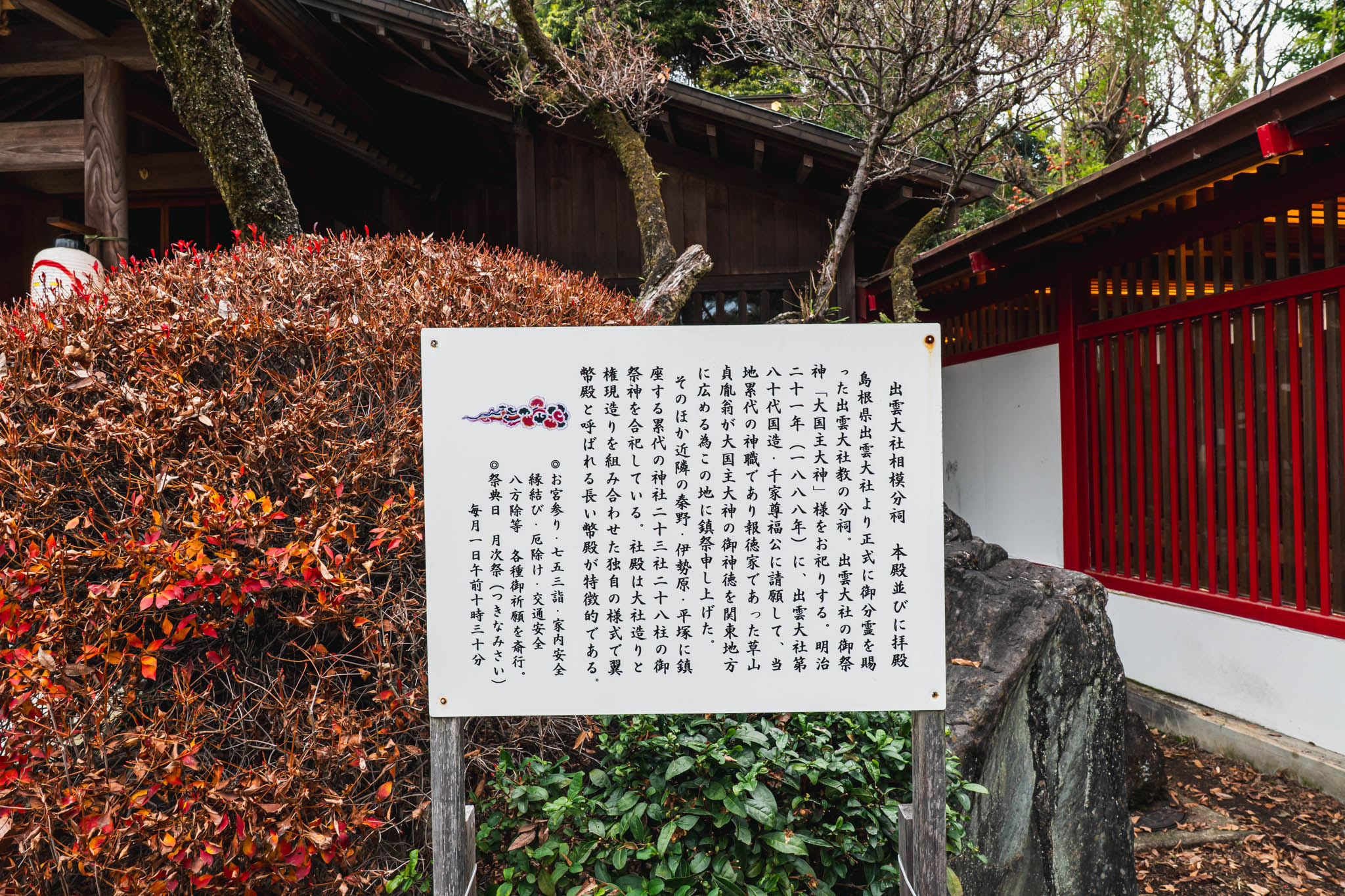 国家的な社格制度に基づく格式を持つ神社ではありませんが、出雲大社の分祠として、相模地域における出雲信仰の拠点の一つとされてきました。