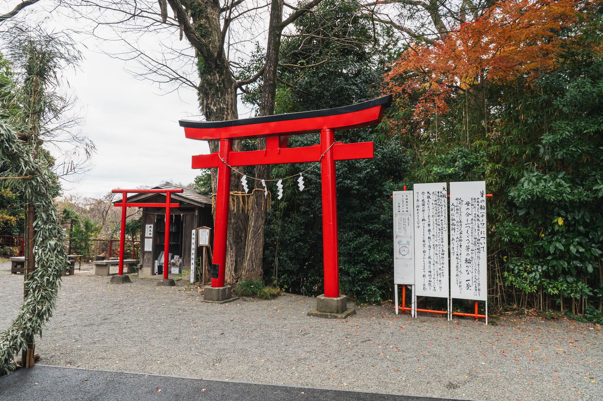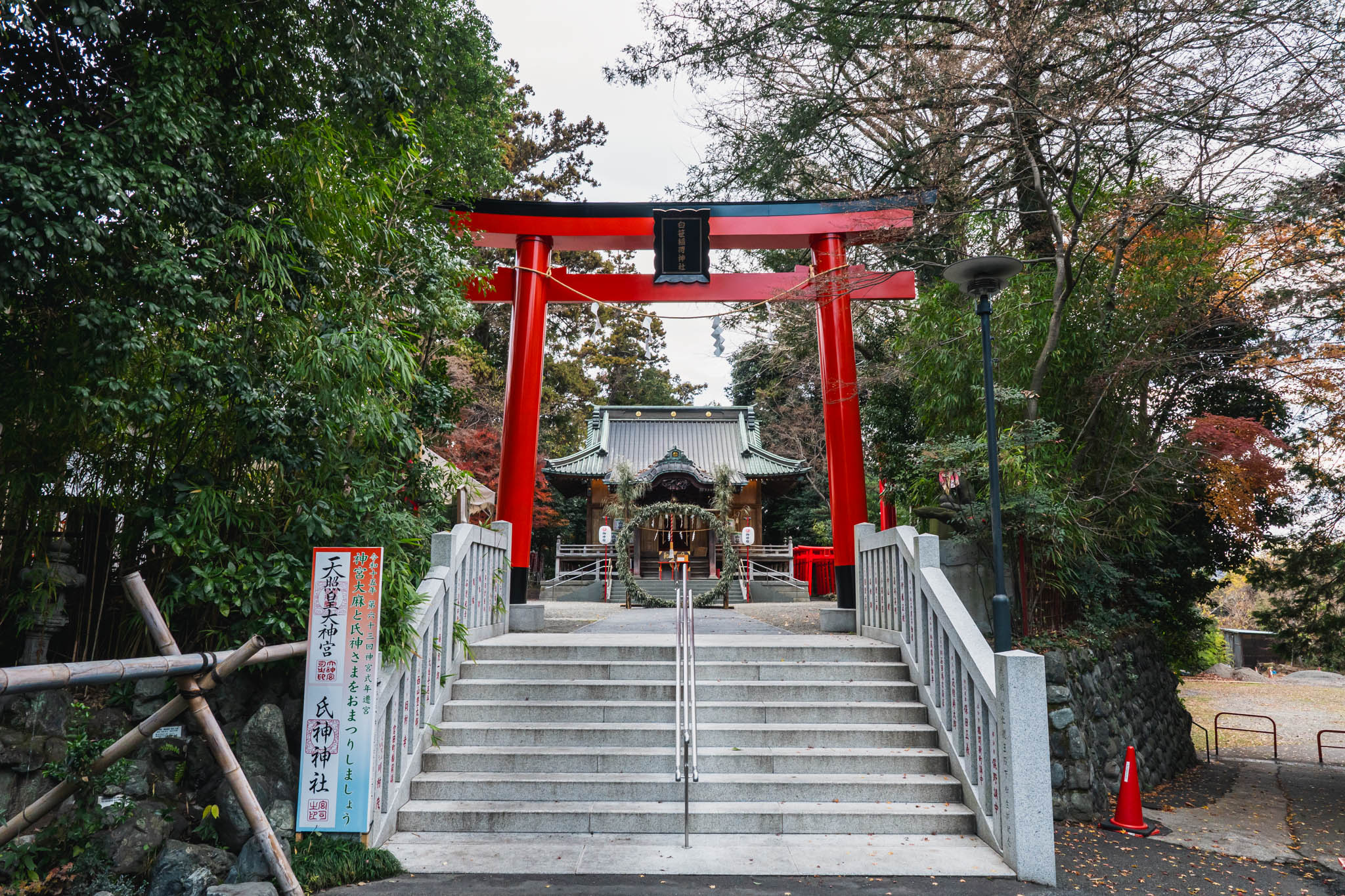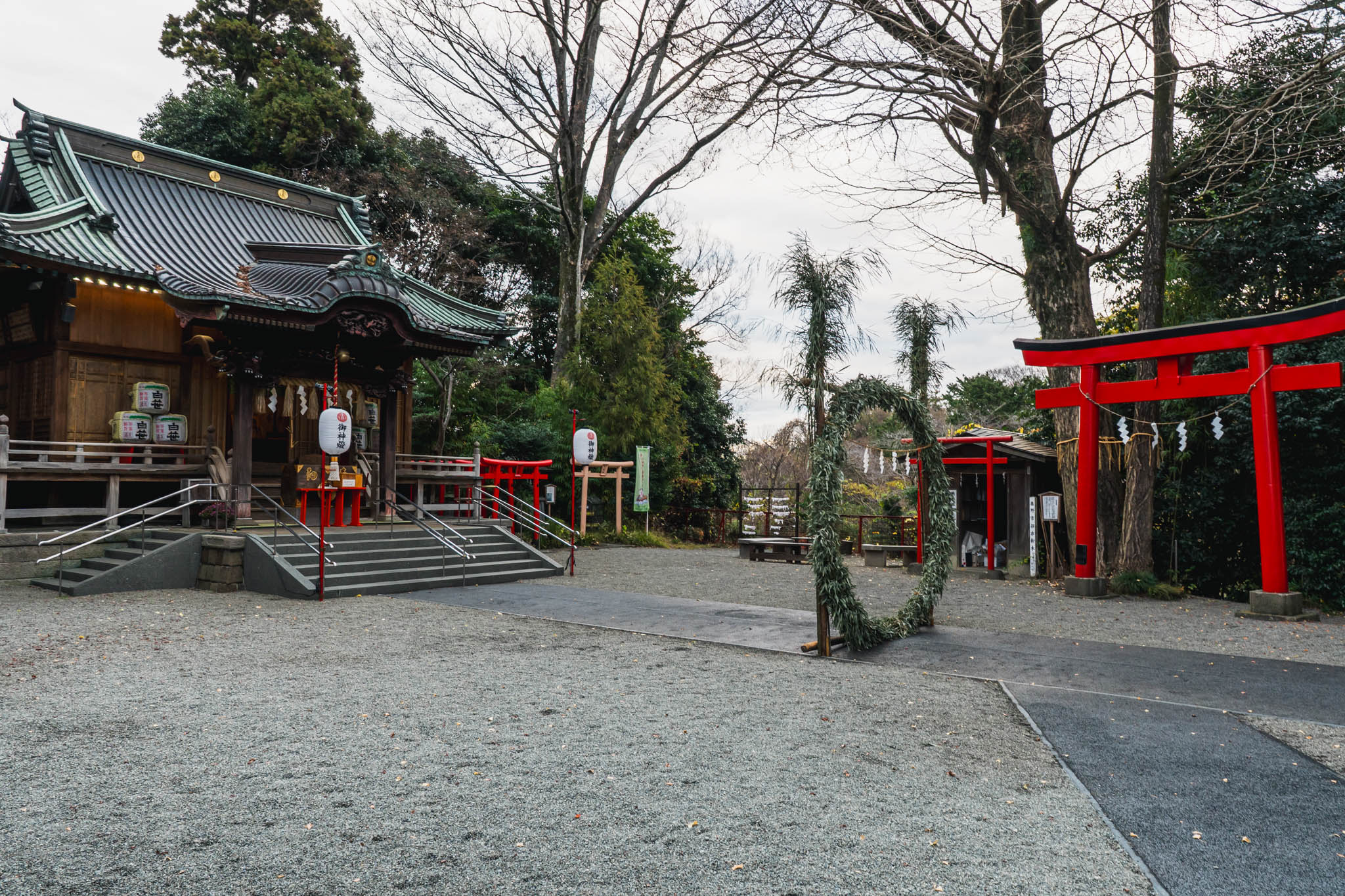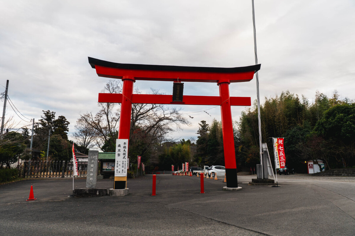 訪問日は2025年12月22日、冬至の日の午後でした。境内に入ると、低い位置から差し込む光が鳥居の朱をやわらかく照らし、影が足元に長く伸びていました。風はほとんどなく、紙垂の揺れも最小限で、社前には日常の音が自然に遠のく静けさが保たれていました。