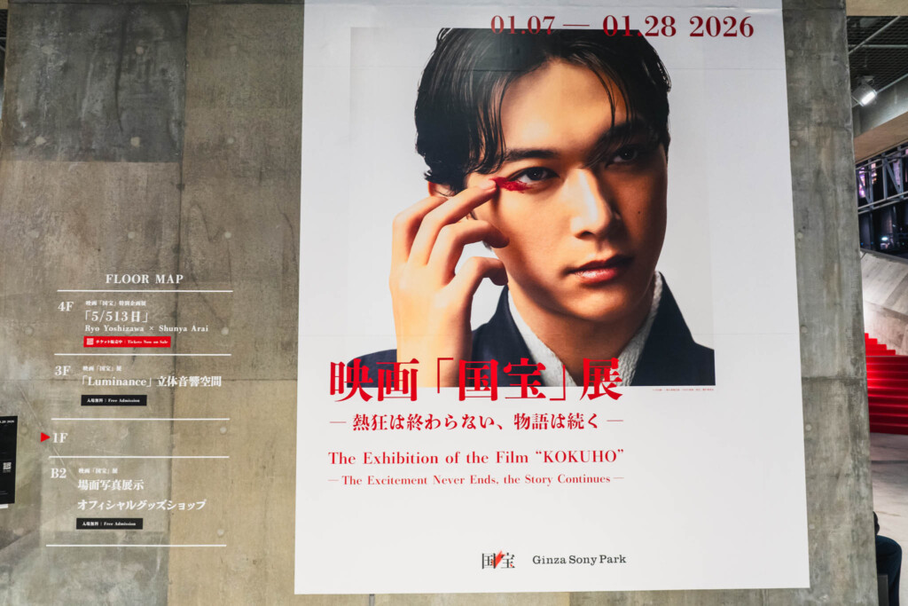 今回の目的は、Ginza Sony Park全体を使って展開されている映画『国宝』関連展示を、フロアごとに体験することだった。B2と3階は無料展示、そして4階では有料の特別企画展が行われている。そのなかでも、事前に日時指定チケットを取っていた4階の展示から鑑賞を始めた。