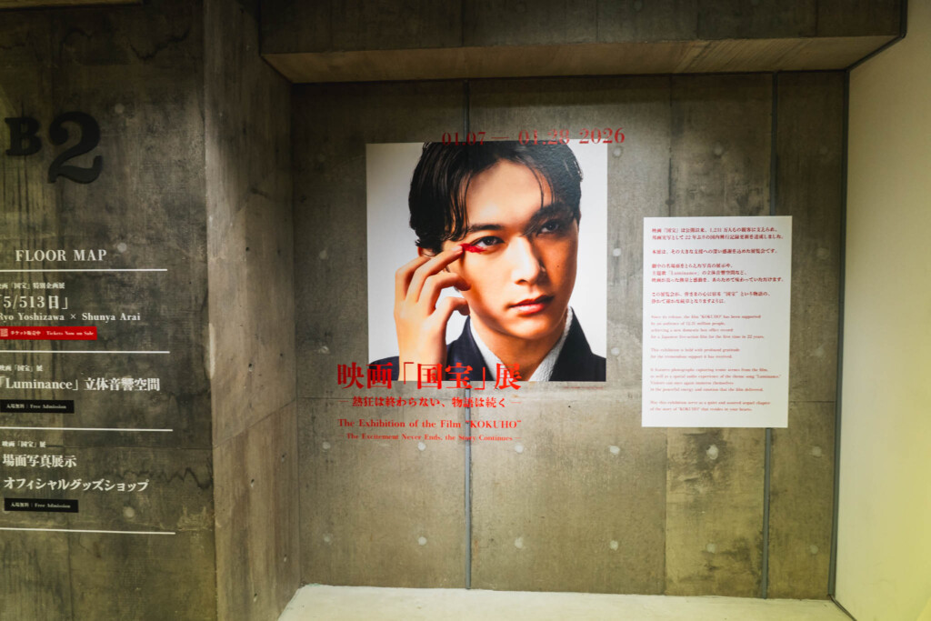 4階で写真と光に向き合い、B2で名場面の密度に圧倒され、3階で映像と音に包まれる。映画『国宝』という一つの作品が、写真、空間、音響、ディスプレイという異なるメディアに翻訳されながらも、確かな熱を失わずに伝わってくる構成だった。