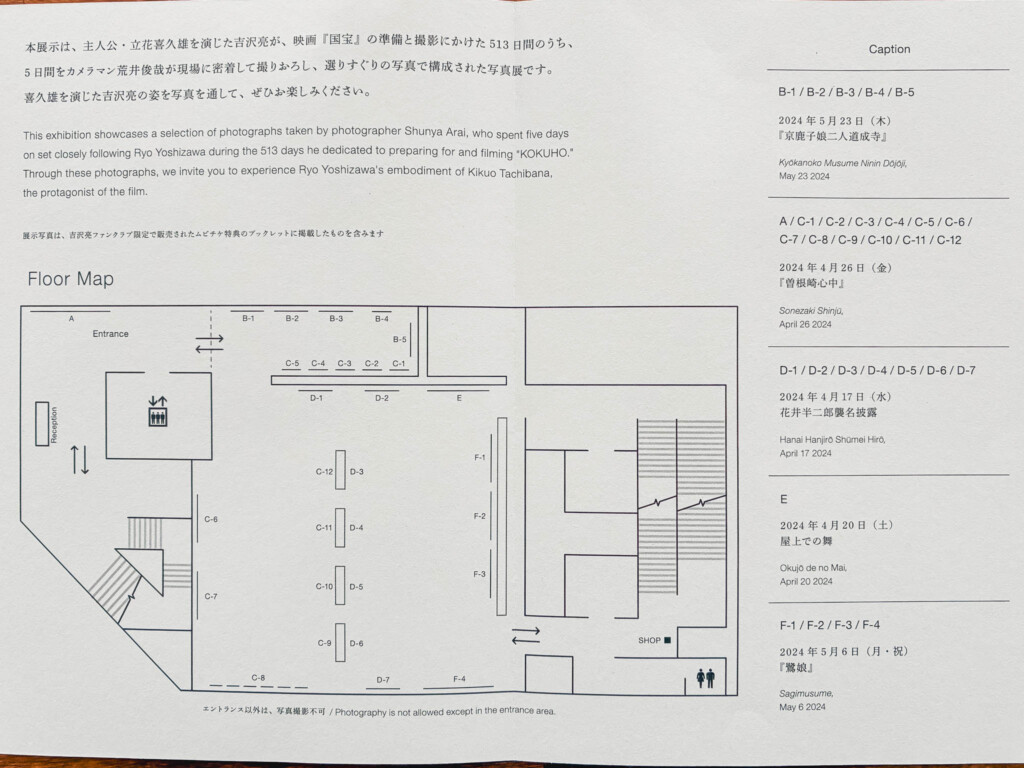 IMAXで改めて観た『国宝』は、最初の鑑賞時よりも映像の情報量が格段に増し、舞台の奥行きや衣装の質感、役者の視線の動きまでがより明確に身体に残った。その状態で展示空間に入ったことで、写真や映像が単なる関連資料ではなく、映画体験の延長として自然につながっていった。