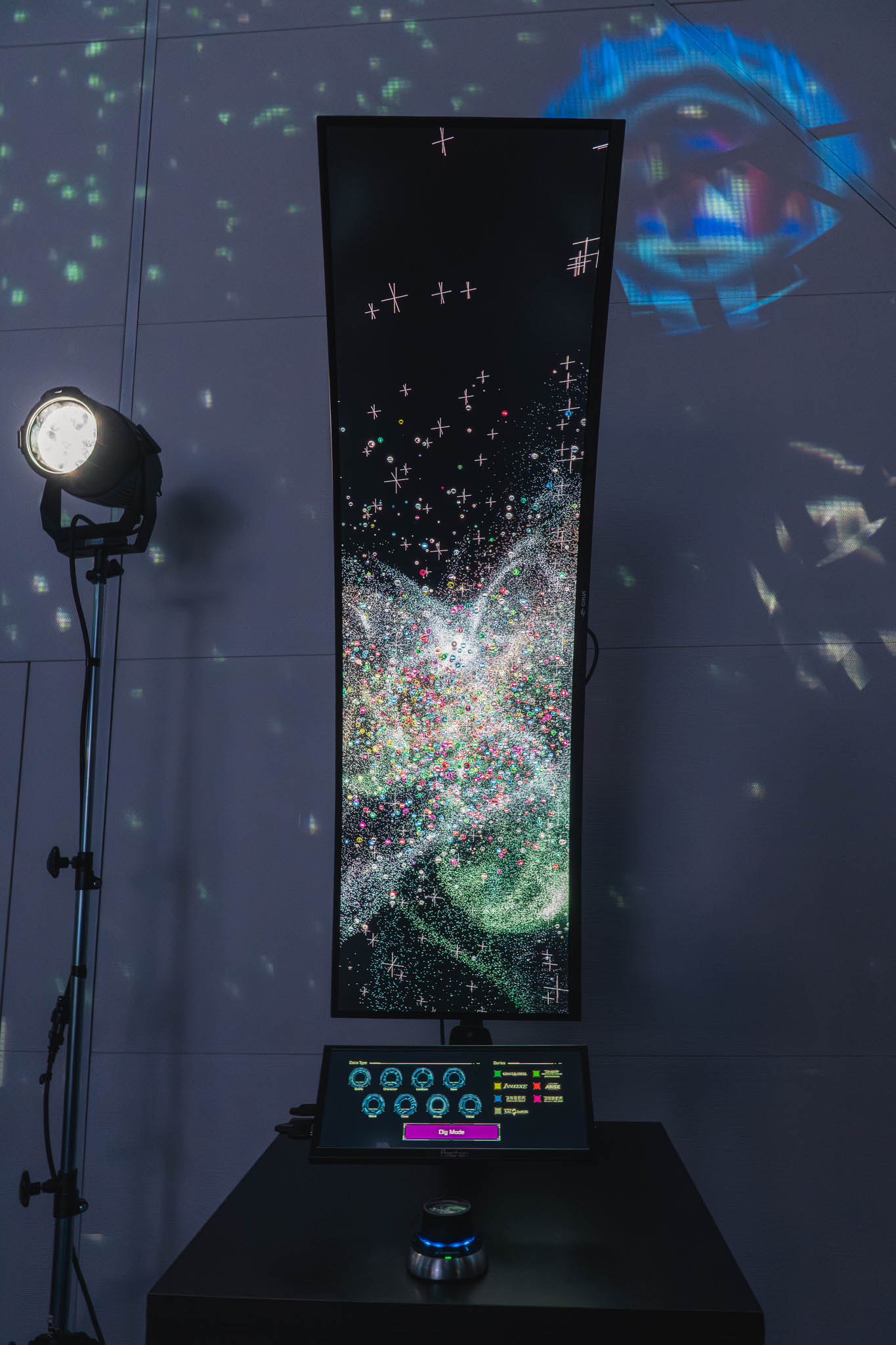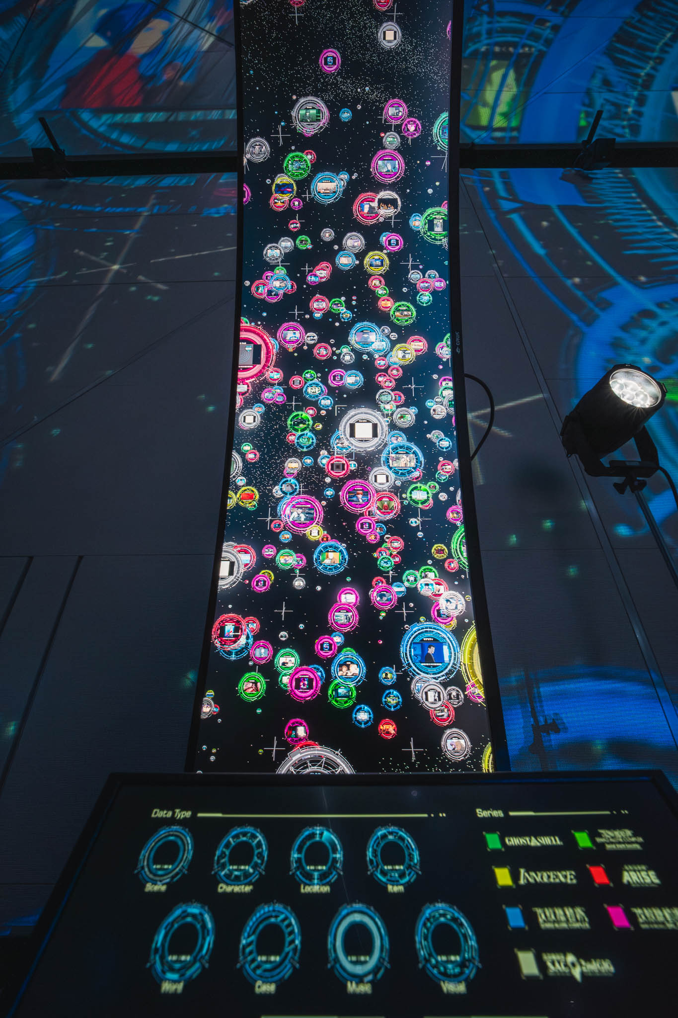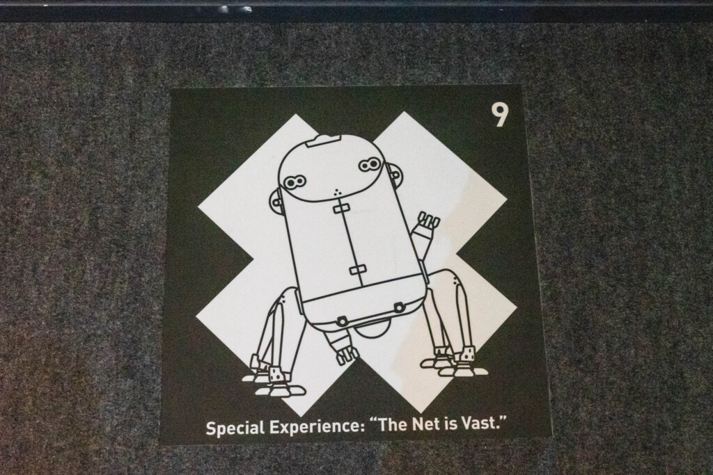 - Nerve Net(巨大電脳ネットワークビジュアライザー): 会場の壁一面を覆う巨大なマッピング空間では、来場者の検索行動が情報の海を泳ぎ、数々の名シーンを呼び覚まします。自分の思考が展示と同期し、空間そのものが呼吸するように変化していく様は、まさに電脳空間そのものです。