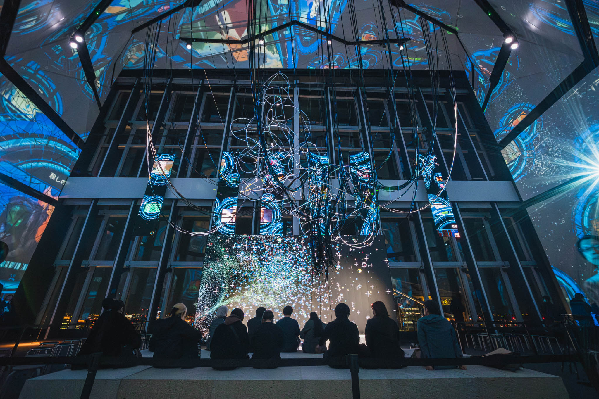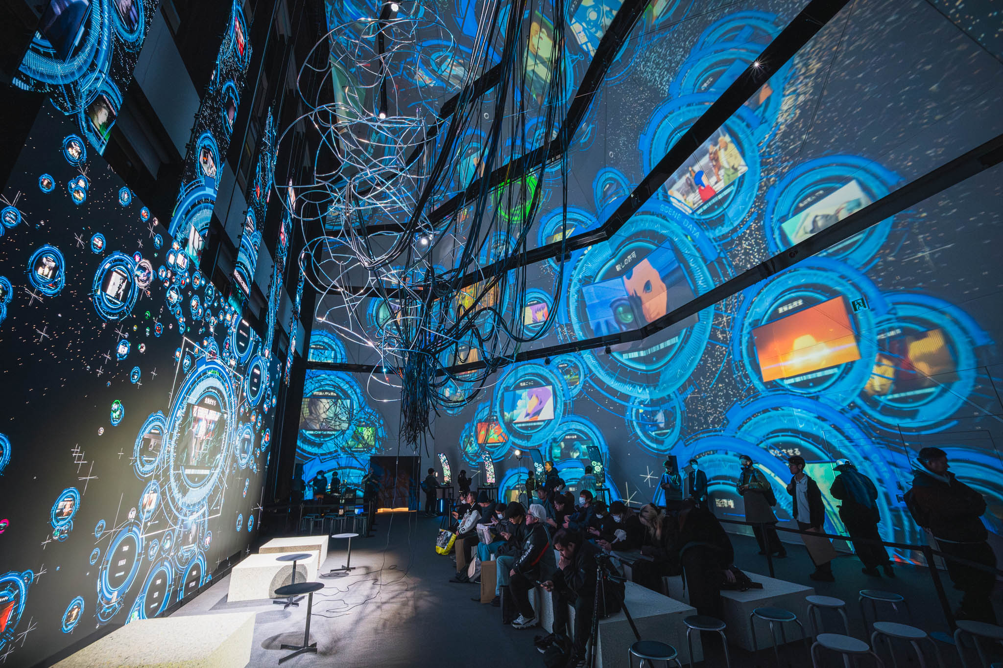 - World Tree(知の遺跡): 天井高15メートルの闇から降り注ぐ無数のケーブル。「有線接続」を象徴するこの巨大なオブジェは、情報の脈動を可視化し、私たちが膨大なアーカイブの一部であることを再認識させます。