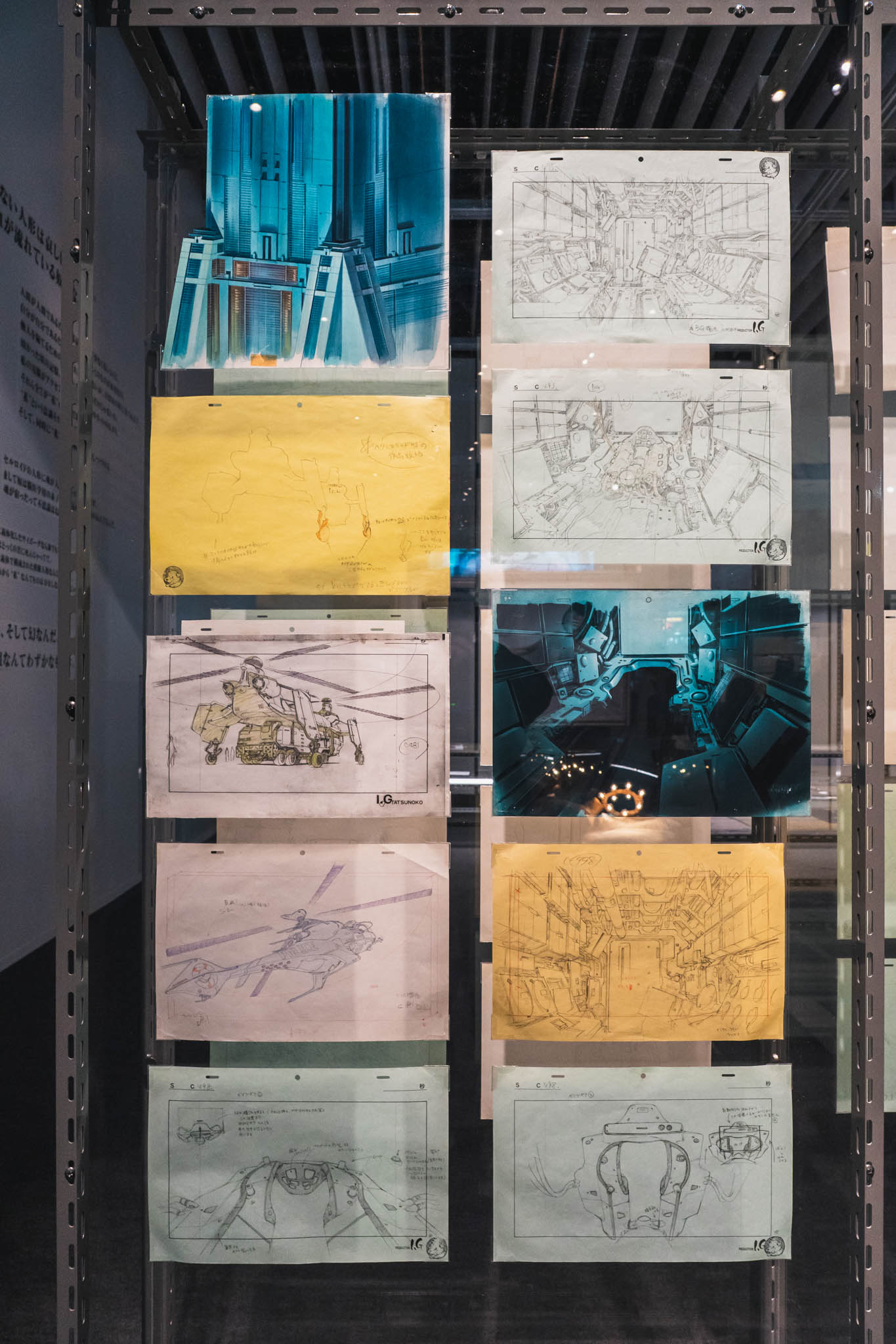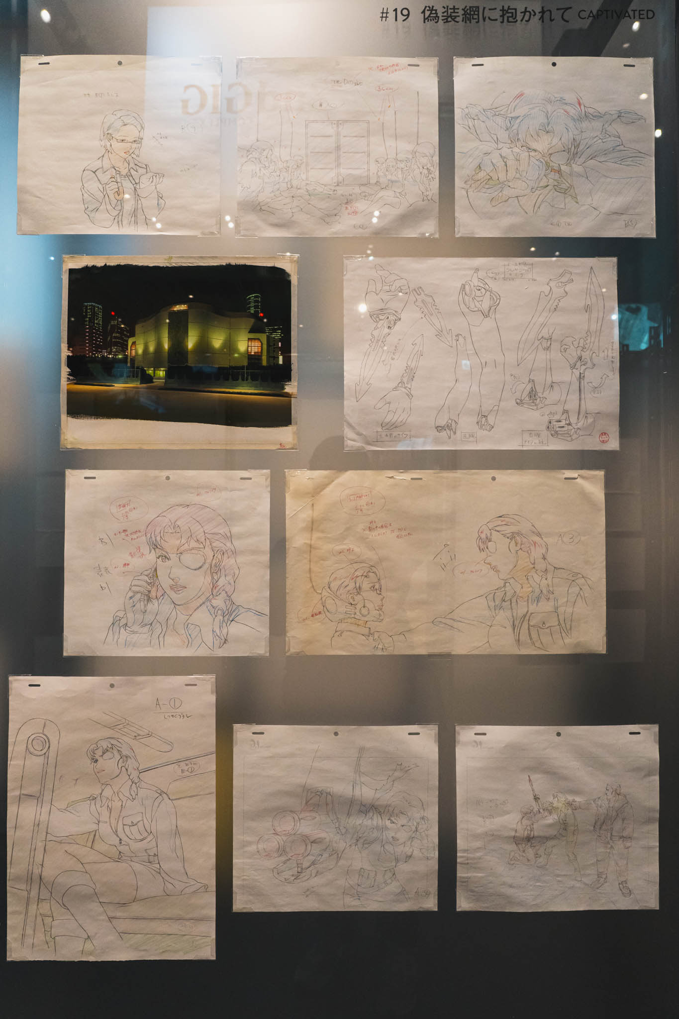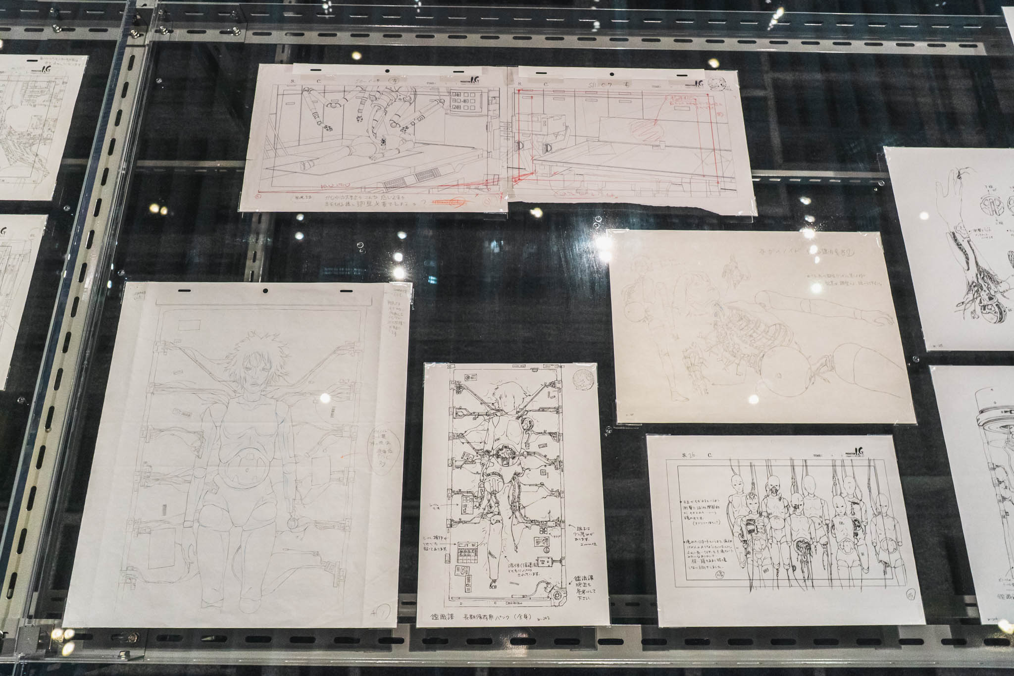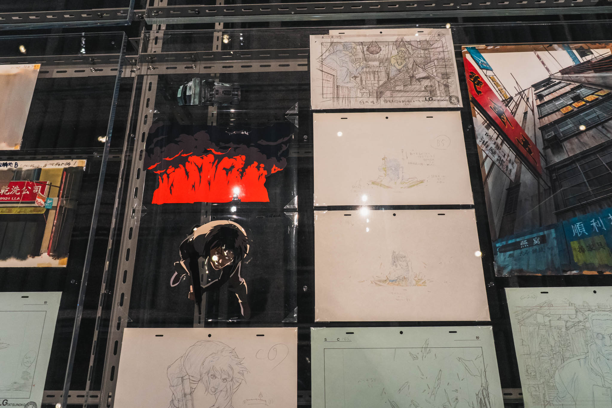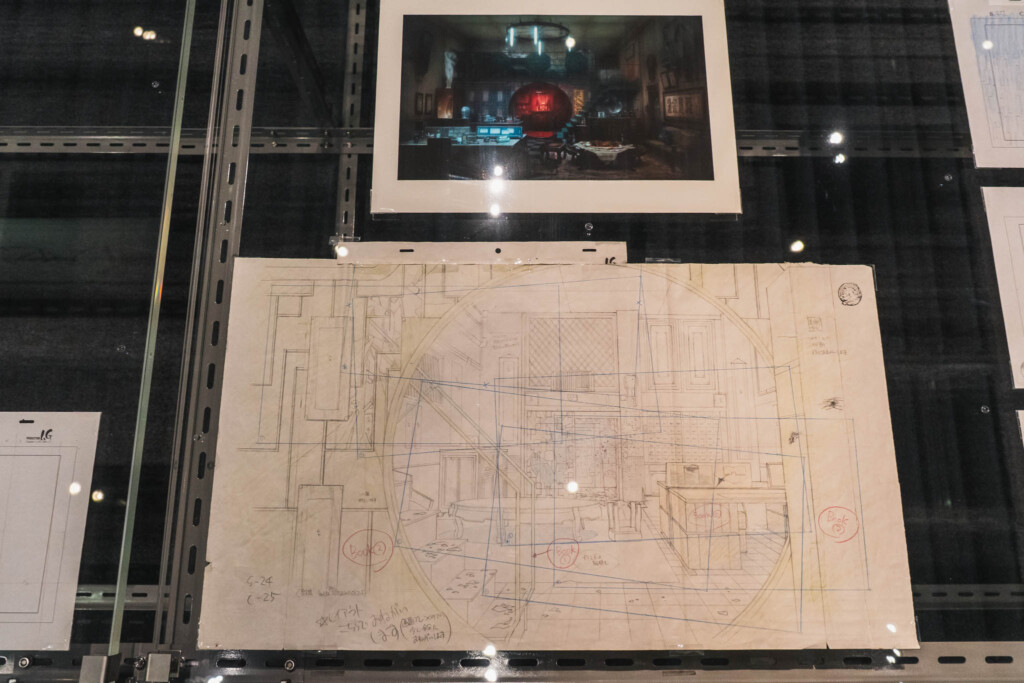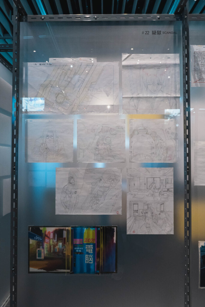 展示の心臓部「GALLERY B “DIG”」は、めまいに似た感覚を覚える空間です 。壁一面を埋め尽くす1,600点超のアーカイブは、35年にわたり構築されてきた『攻殻機動隊』という巨大な電脳ネットワークを物理的に視覚化したかのようです 。