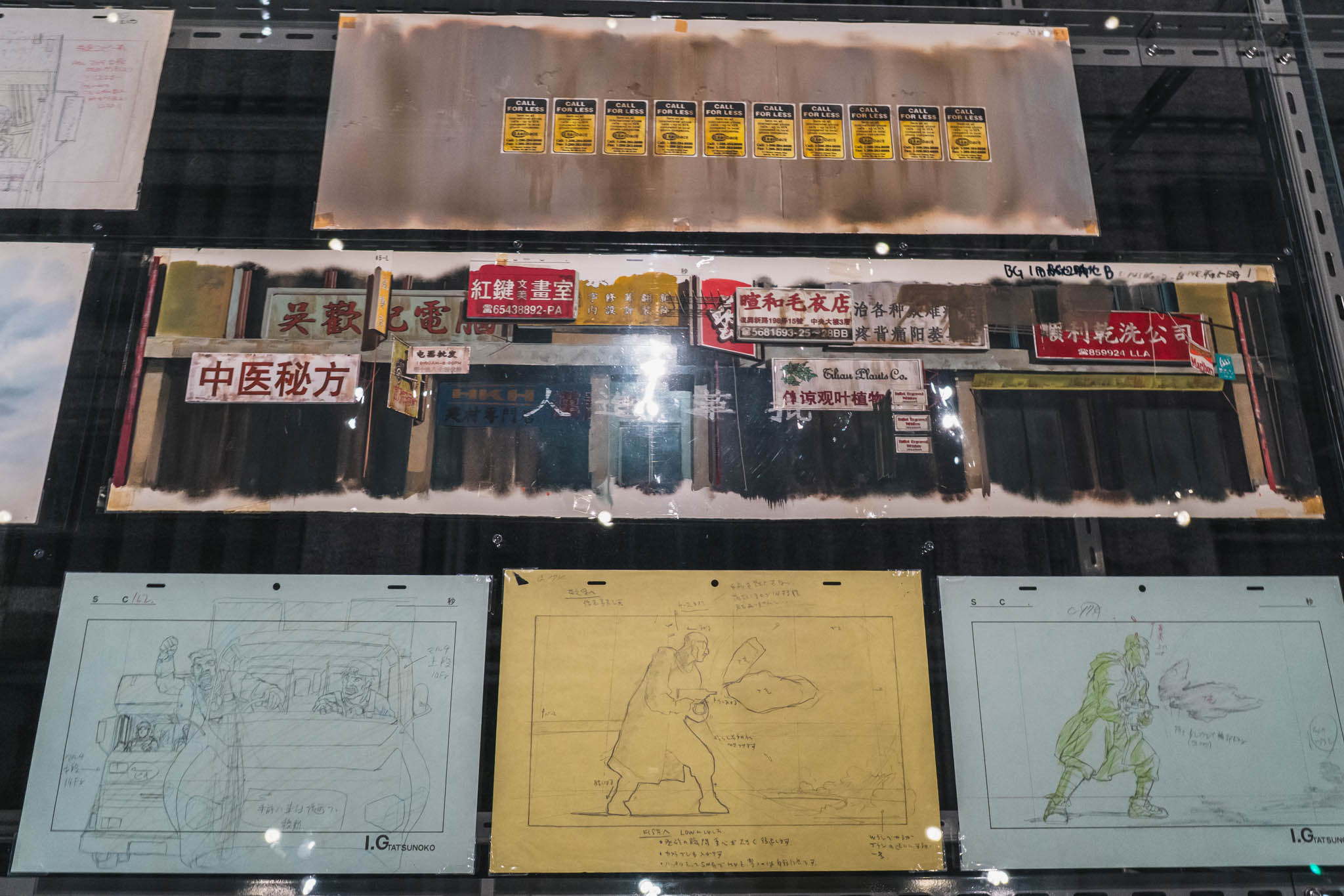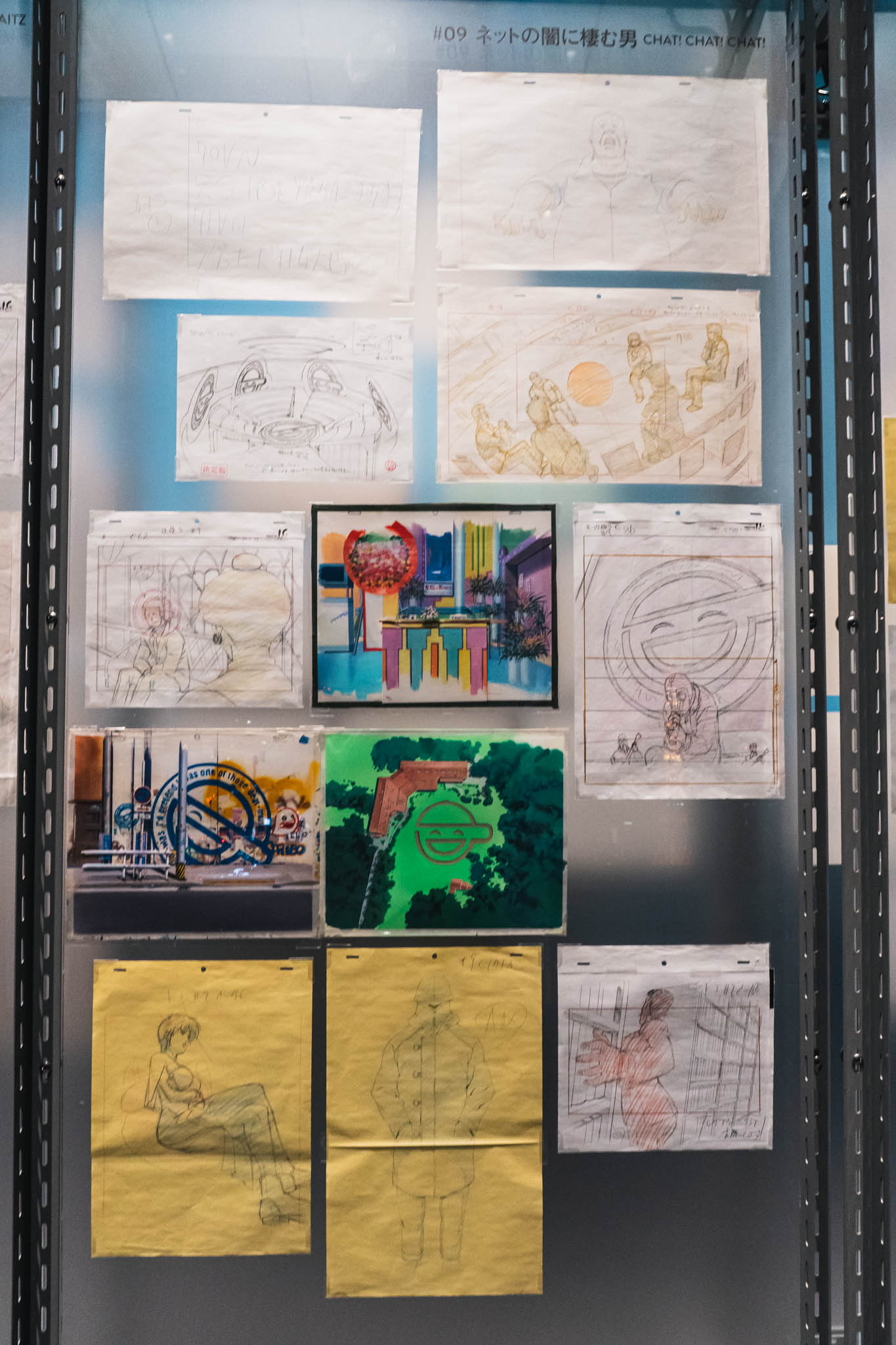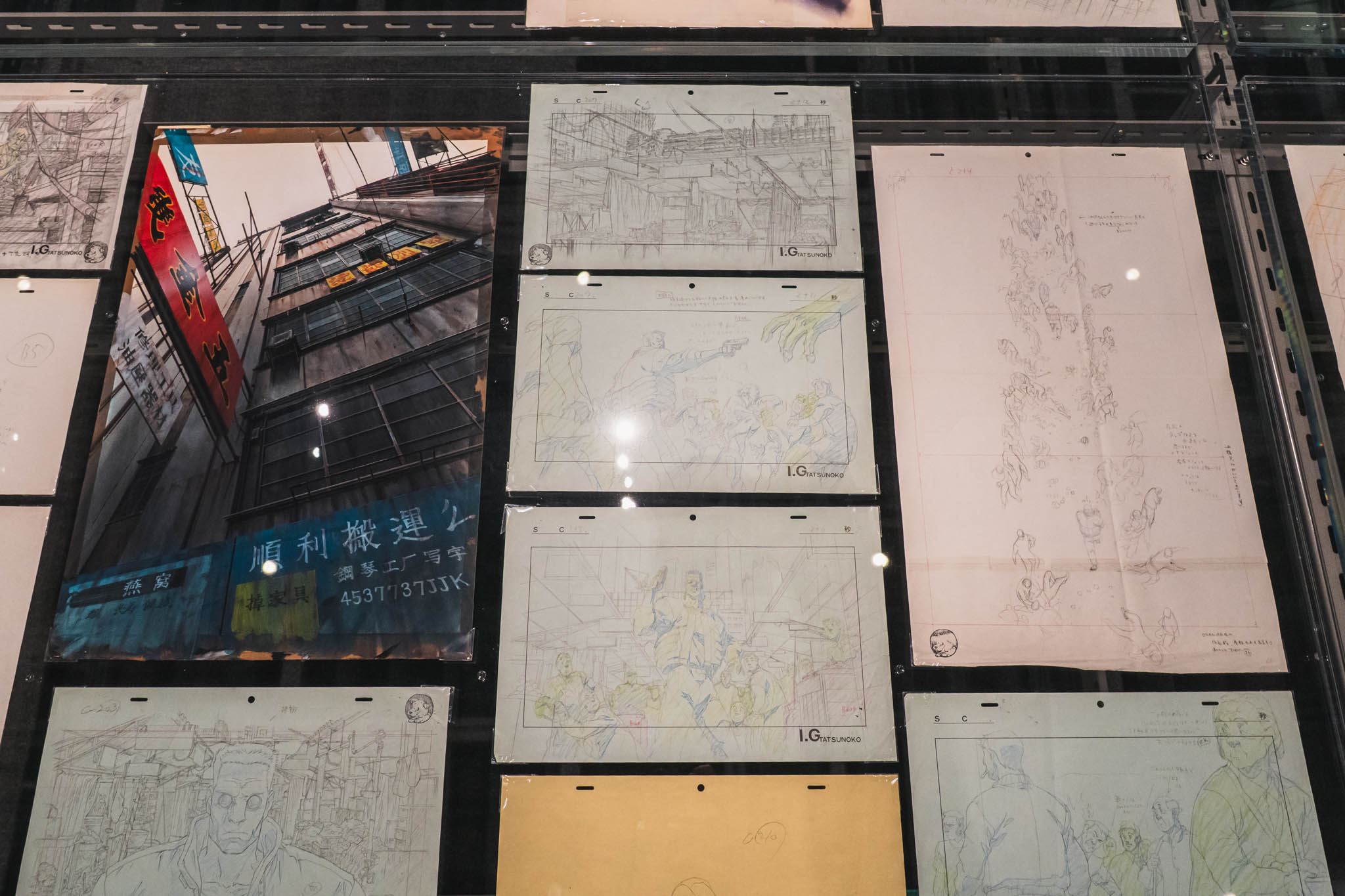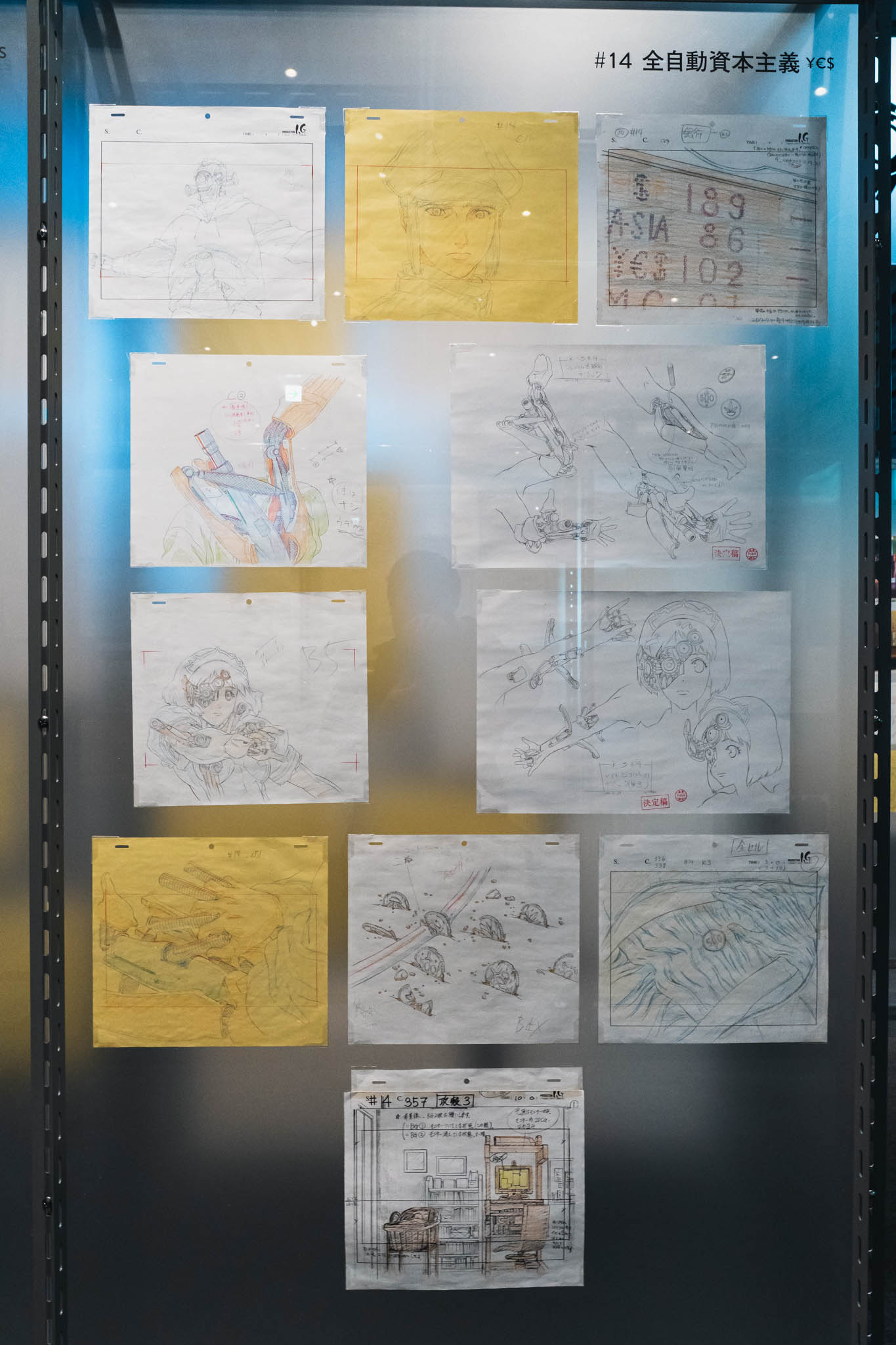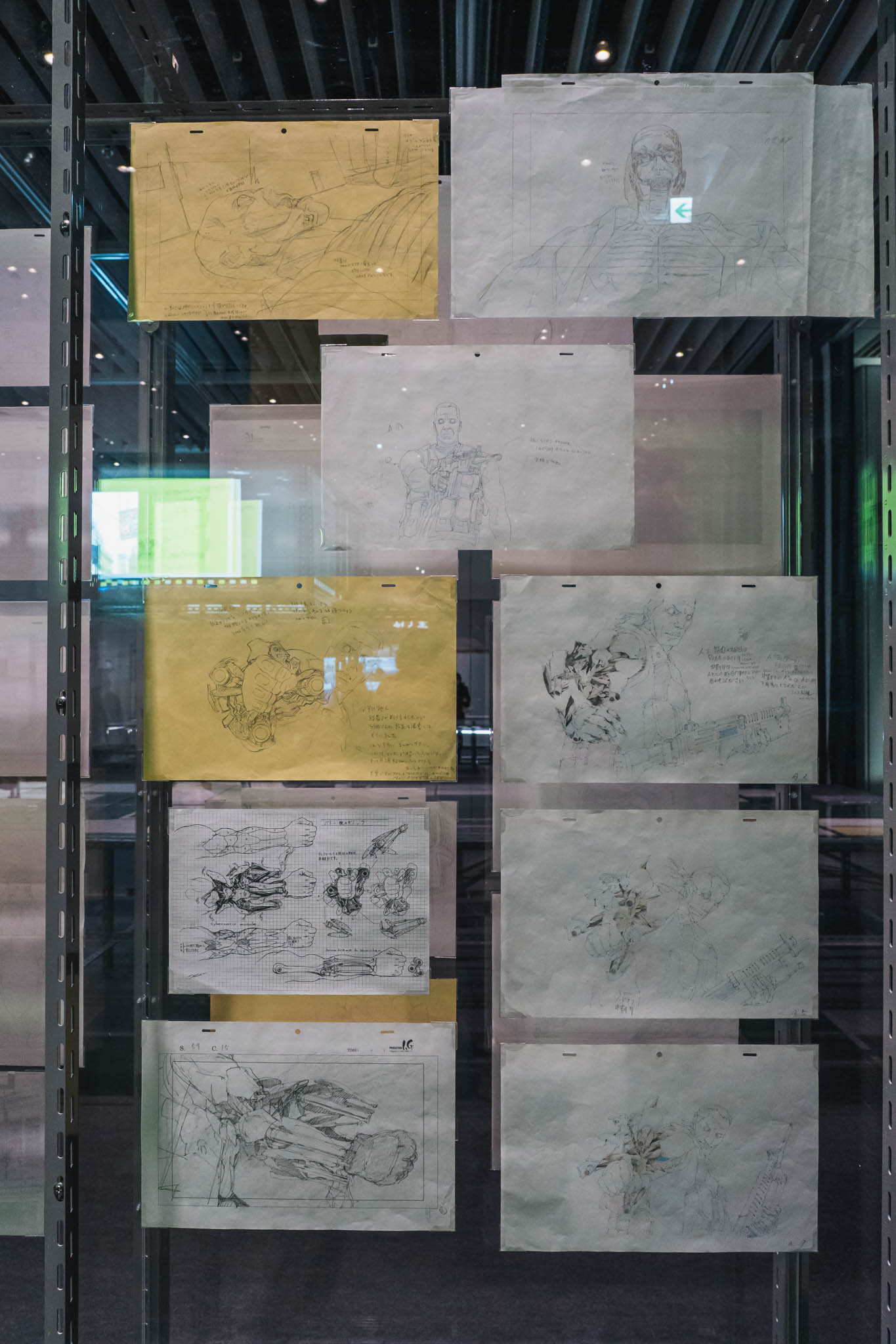 展示の心臓部「GALLERY B “DIG”」は、めまいに似た感覚を覚える空間です 。壁一面を埋め尽くす1,600点超のアーカイブは、35年にわたり構築されてきた『攻殻機動隊』という巨大な電脳ネットワークを物理的に視覚化したかのようです 。