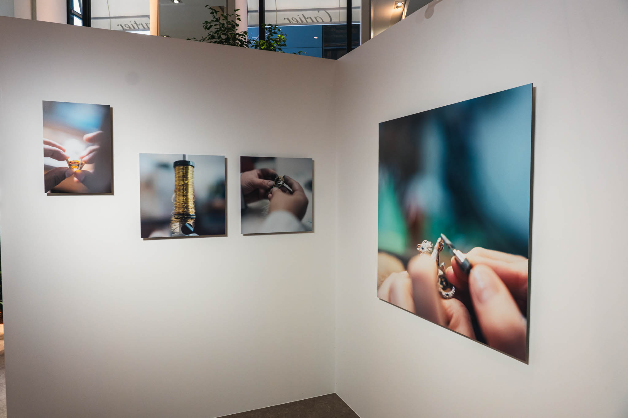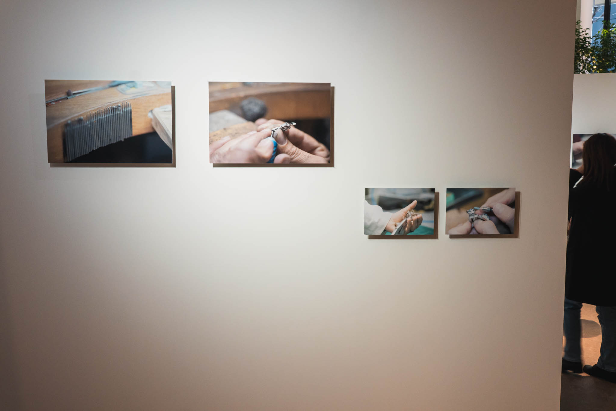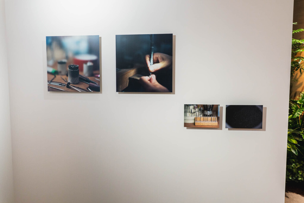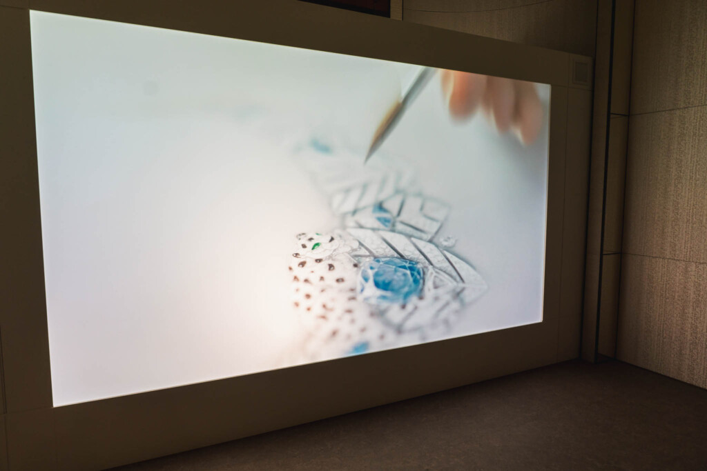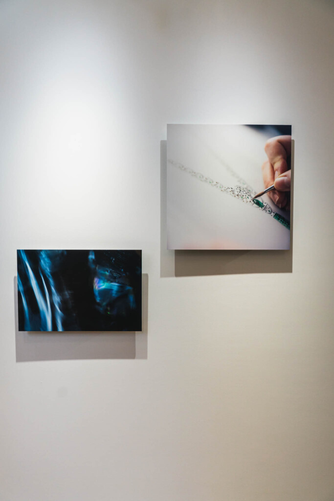 展示空間に足を踏み入れると、まず川内倫子による写真と映像が静かに迎え入れる。そこに写し出されているのは、パリのカルティエ ハイジュエリーアトリエで働く職人たちの姿だ。