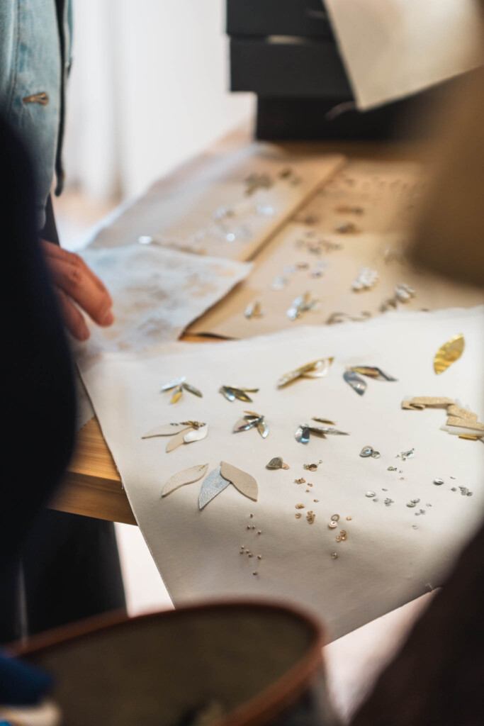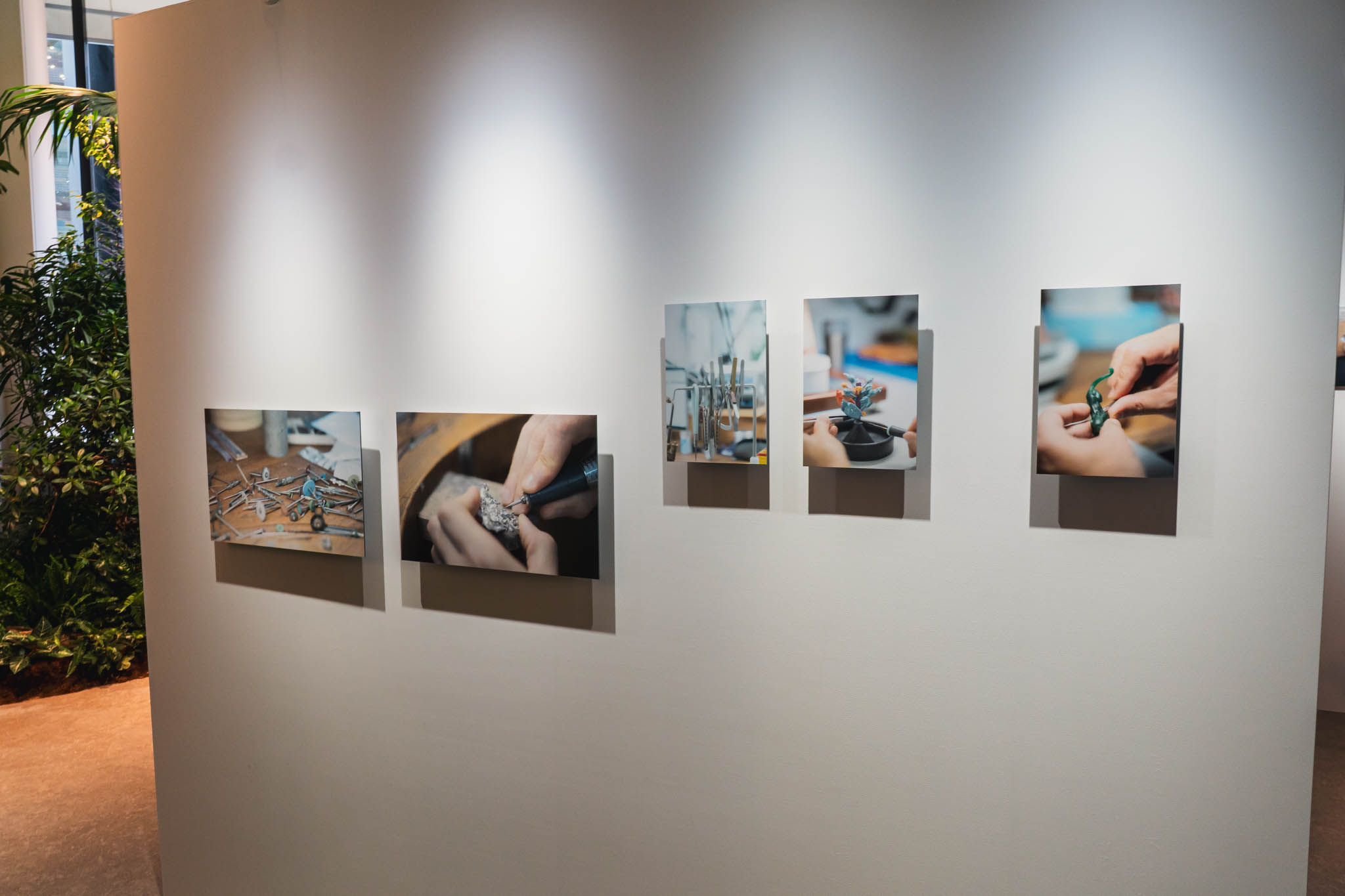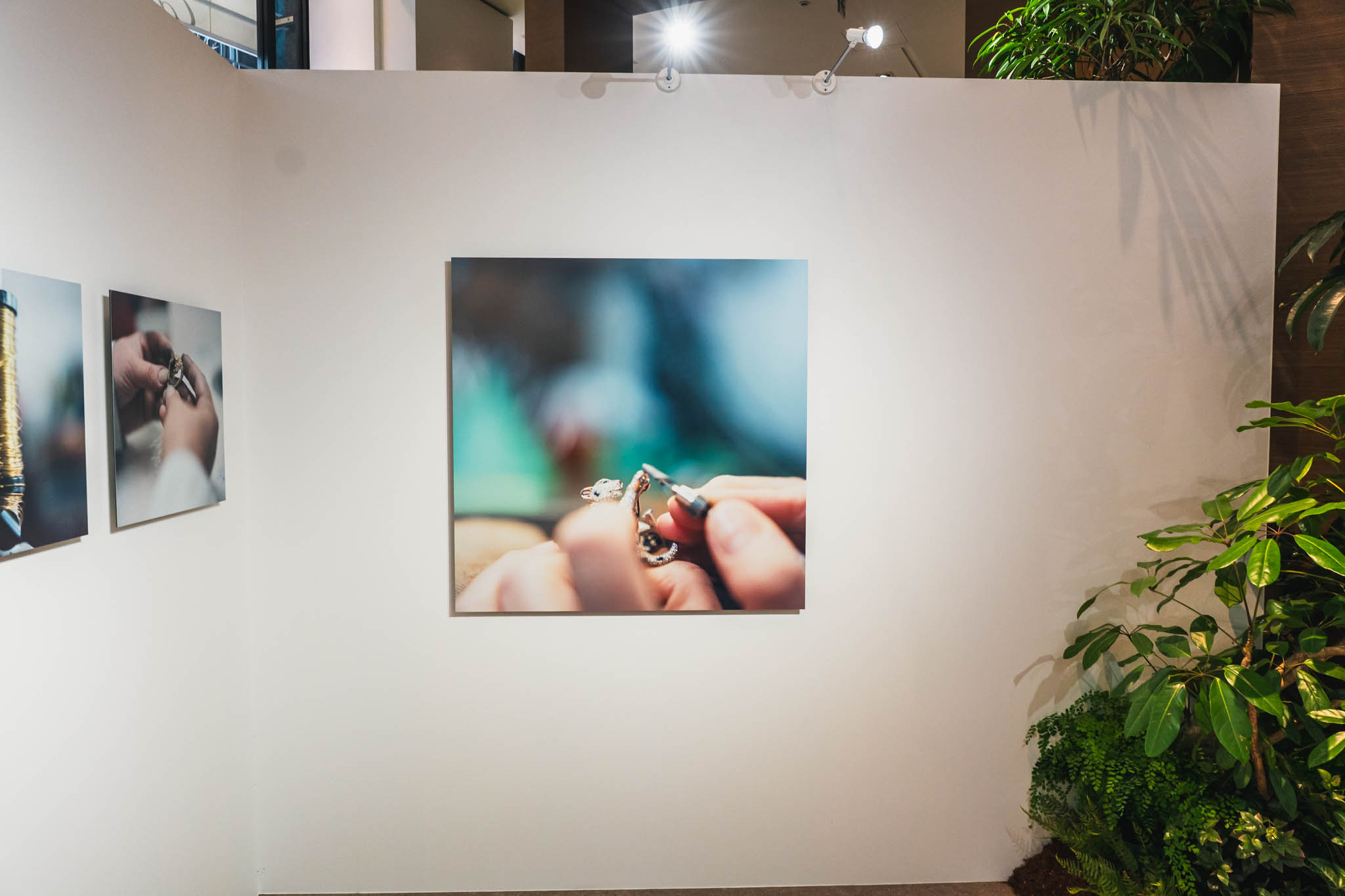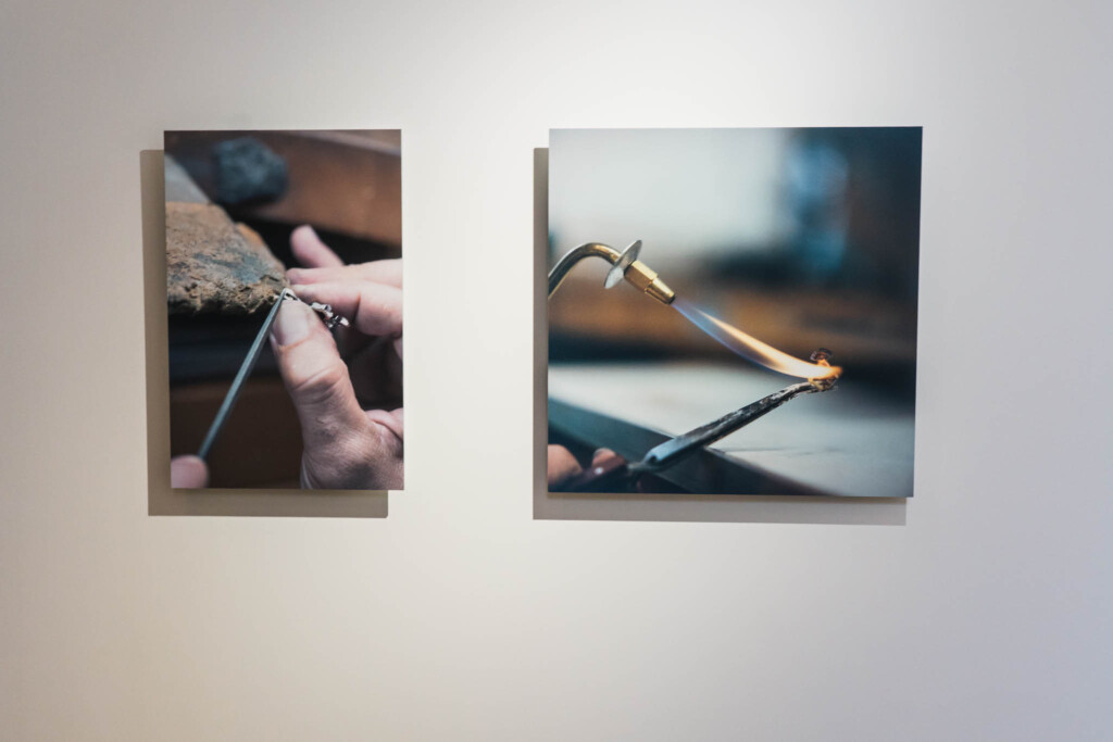 展示空間に足を踏み入れると、まず川内倫子による写真と映像が静かに迎え入れる。そこに写し出されているのは、パリのカルティエ ハイジュエリーアトリエで働く職人たちの姿だ。