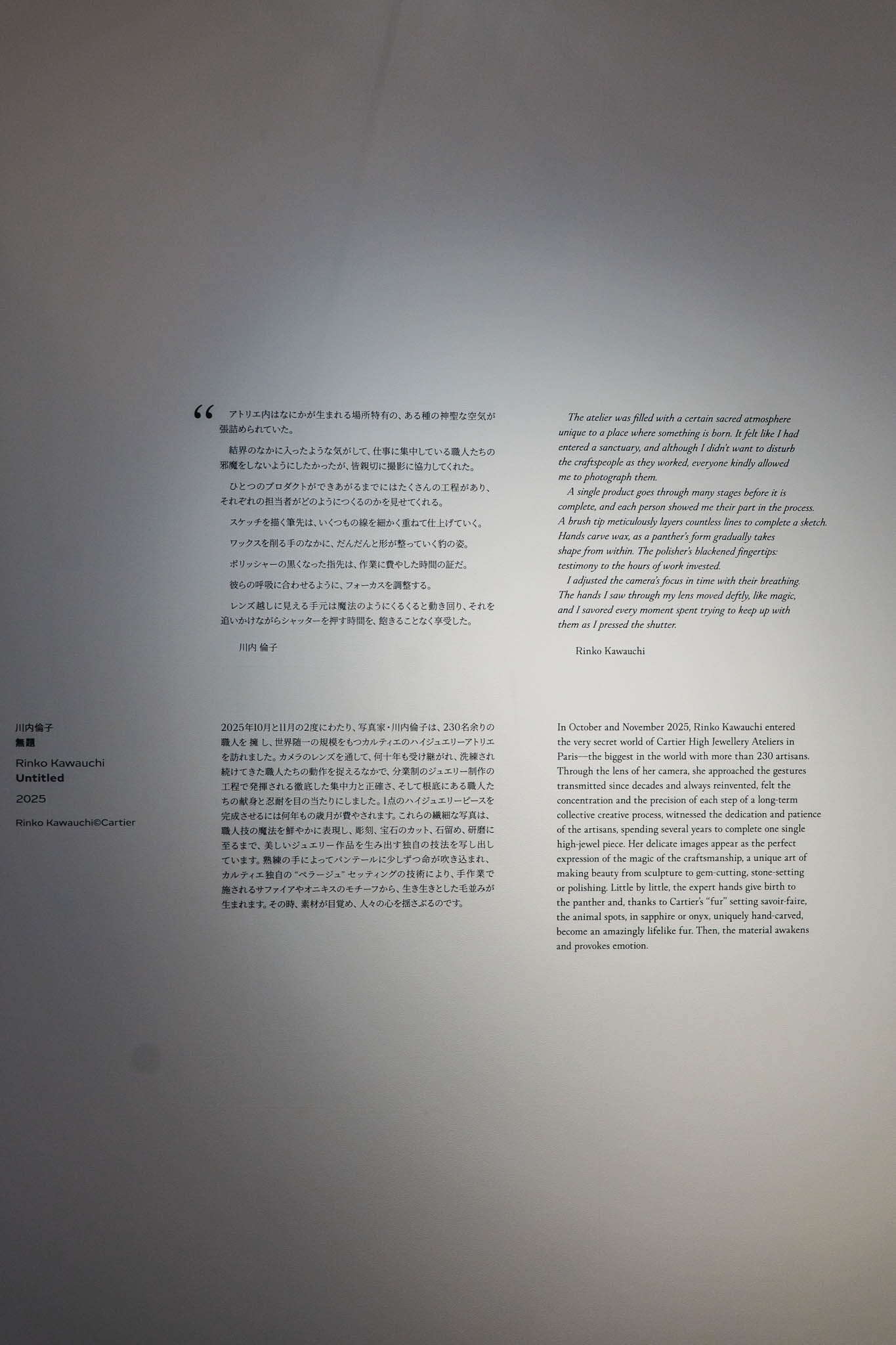 私がこの展覧会を訪れたきっかけは、写真家・川内倫子の存在である。彼女の作品はこれまでも幾度となく見てきた。淡く柔らかな光に包まれた世界は、日常の断片でありながら、確かにそこにある生命の震えを静かに伝えてくる。今回、カルティエの職人たちを彼女がどのように捉えたのか。それを自分の目で確かめたいと思ったのが、この場所を訪れた理由だった。