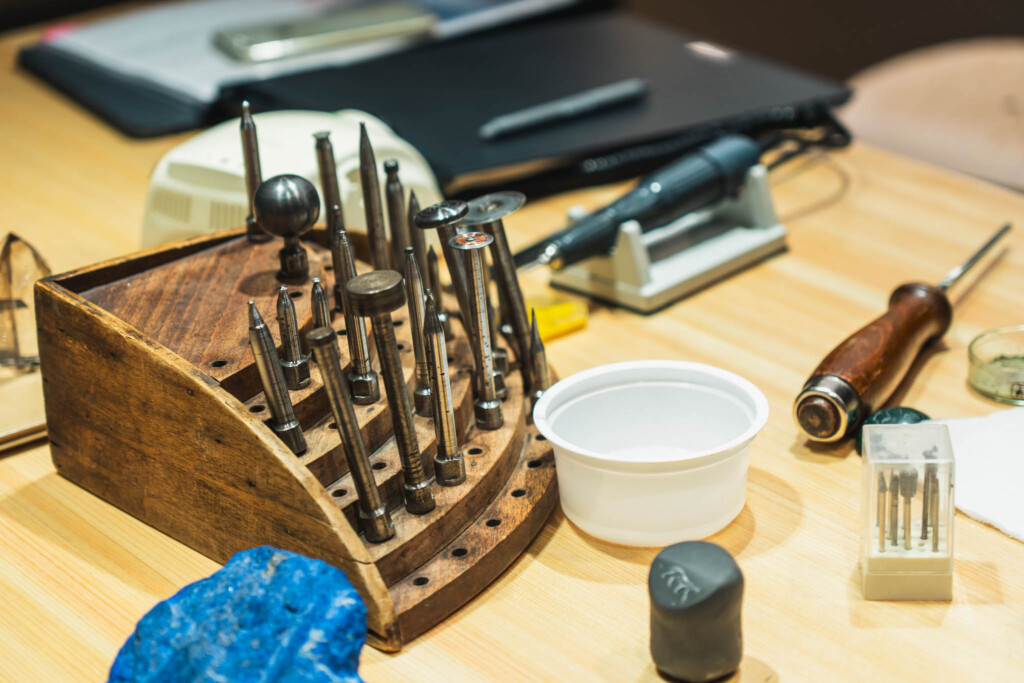工具の金属がわずかに光を反射する瞬間。