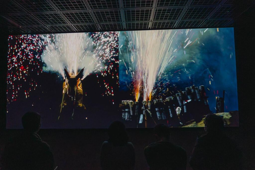 地下展示室へと続く階段を下りるにつれて、外界の光は徐々に失われ、代わりに映像の光と音が支配する空間へと移行していく。この移動そのものが、日常から作品世界への移行を身体的に感じさせる導入となっていた。