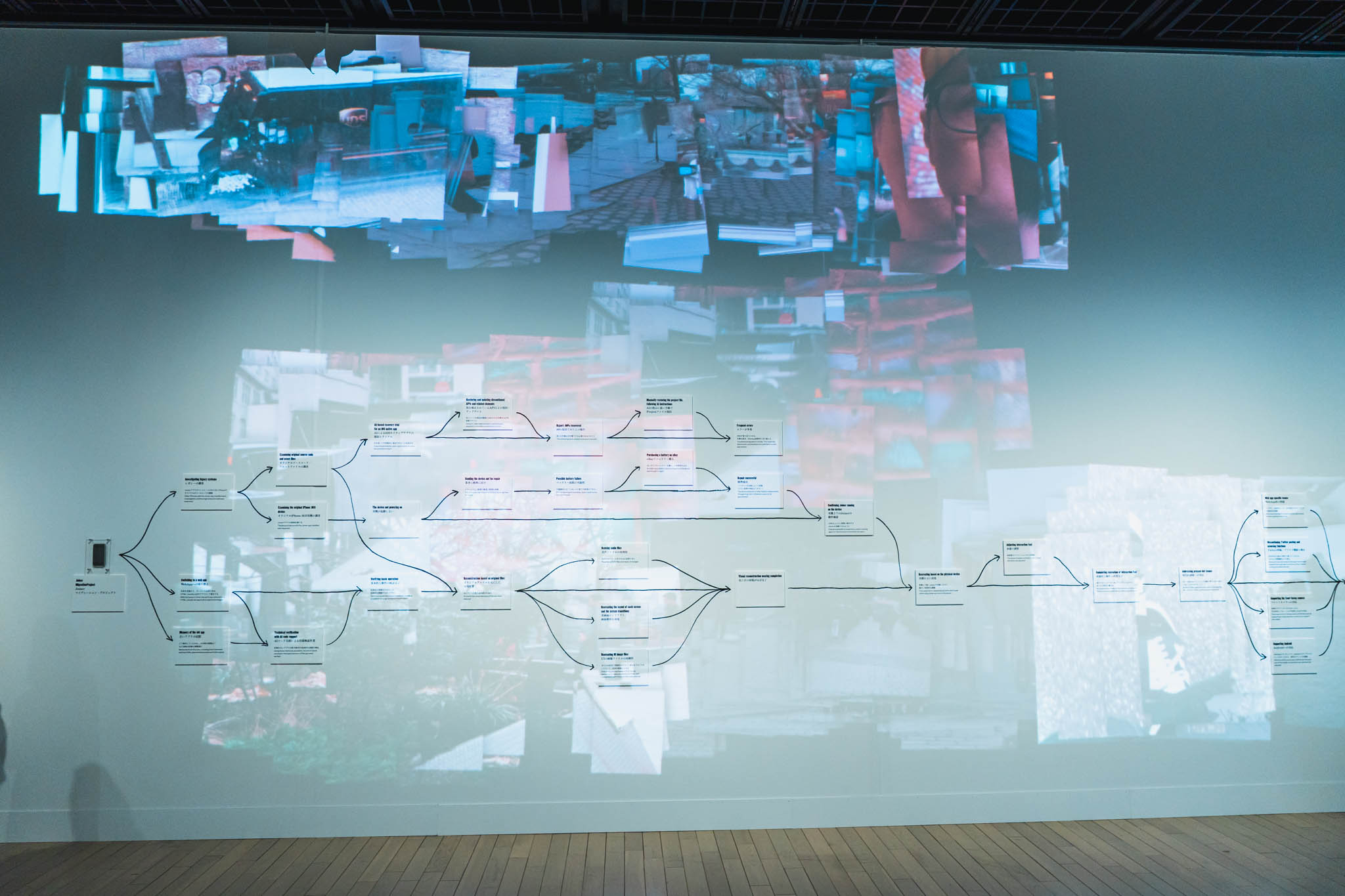 3階展示室では、エキソニモによる《Joiner》が特に印象的だった。この作品は、画面を指でなぞることで風景を切り取り、まるで絵を描くような感覚でリアルタイムにコラージュ写真を生成できるカメラアプリとして制作されたものである。