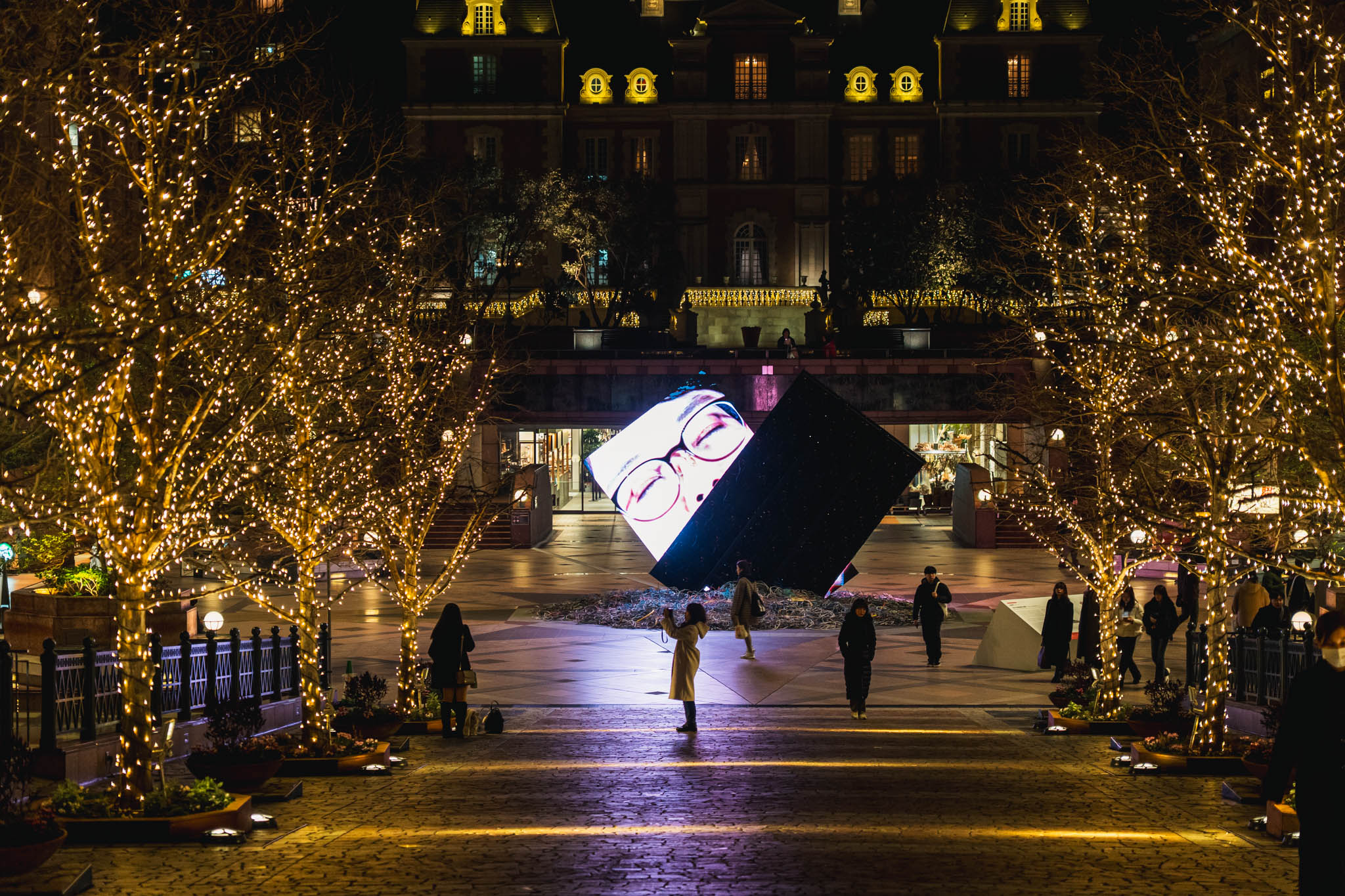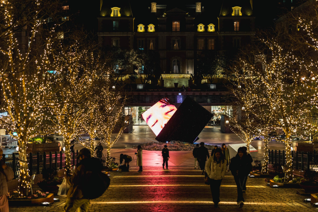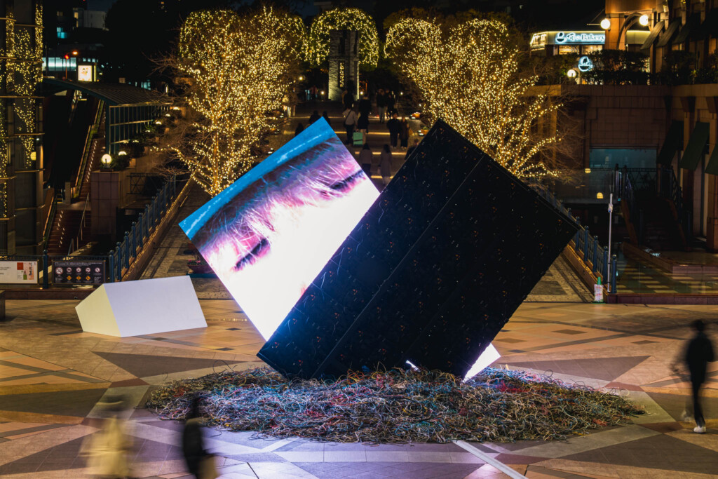 夜のガーデンプレイス。整然と並ぶイルミネーションの光の中に、巨大な立方体のモニターが傾いた状態で設置されている。その存在は明らかに周囲の空間と異なる論理で成立しており、まるで都市の中に侵入した異物のようだった。