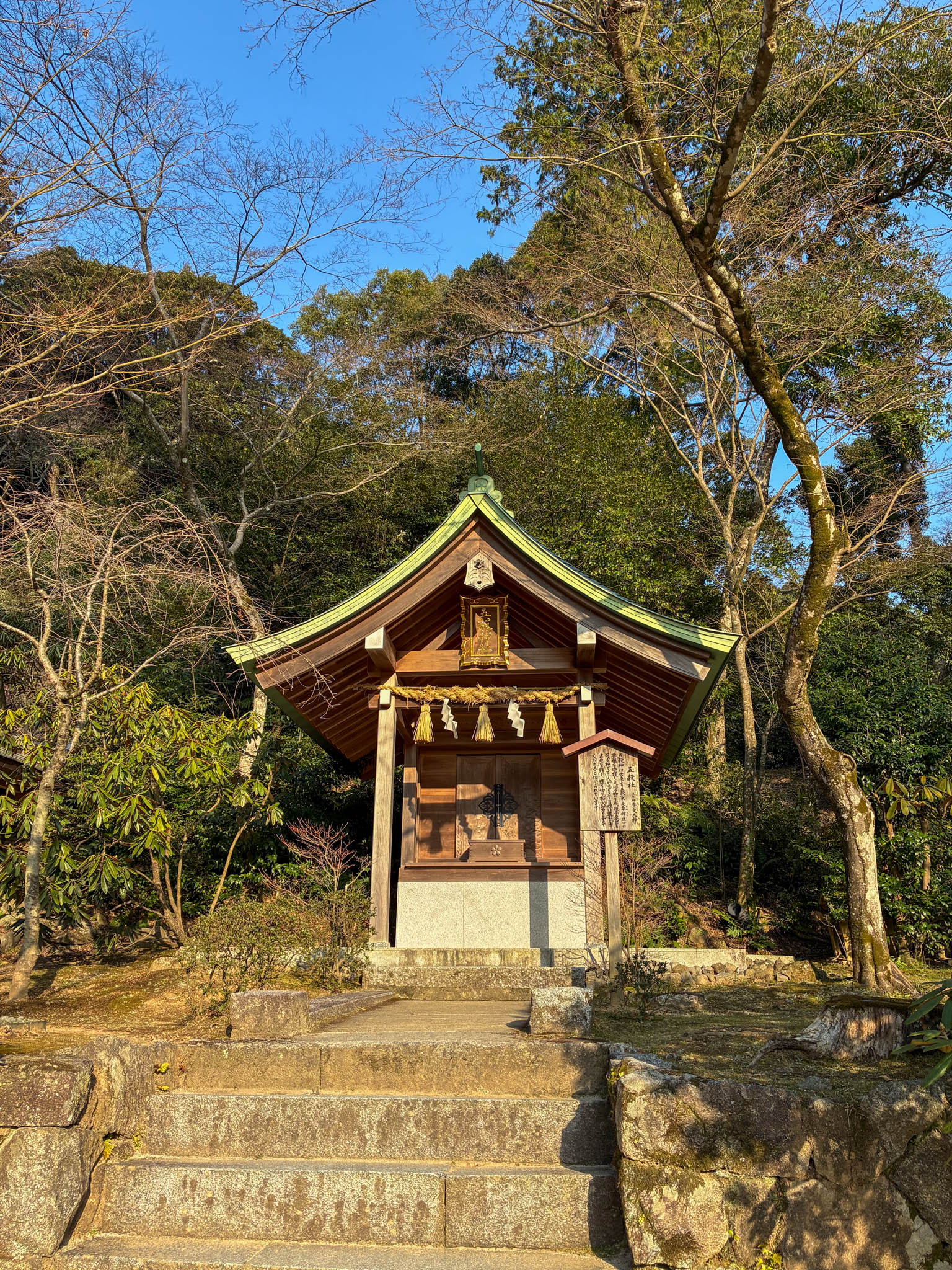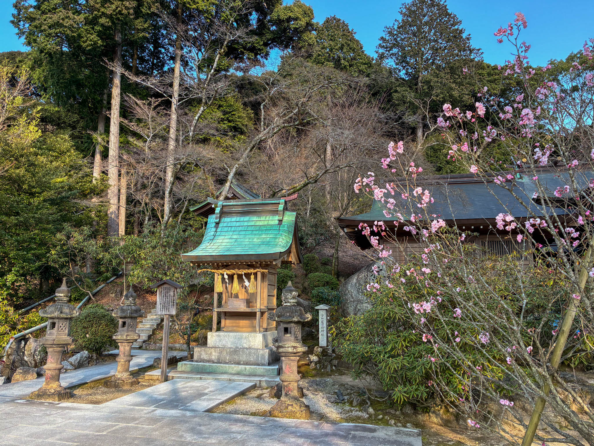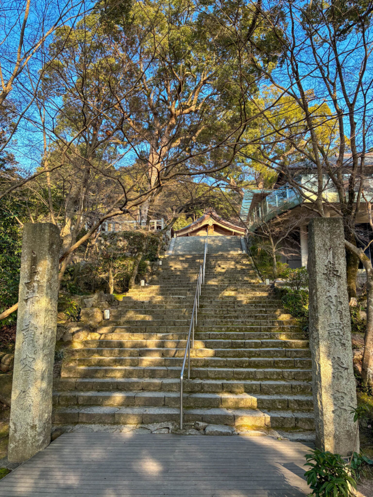 太宰府天満宮には何度も訪れているけれど、竈門神社は初めて。レンタカーで宝満山の麓へ向かうと、住宅街を抜けたあたりから空気がすっと変わるのがわかります。駐車場に車を停めたのは17時少し前。3月とはいえまだ冬の名残がある時期で、西日が長い影を落としはじめていました。空気はひんやりと冷たいけれど、どこか懐かしいような、気持ちのいい午後の終わりの時間帯です。