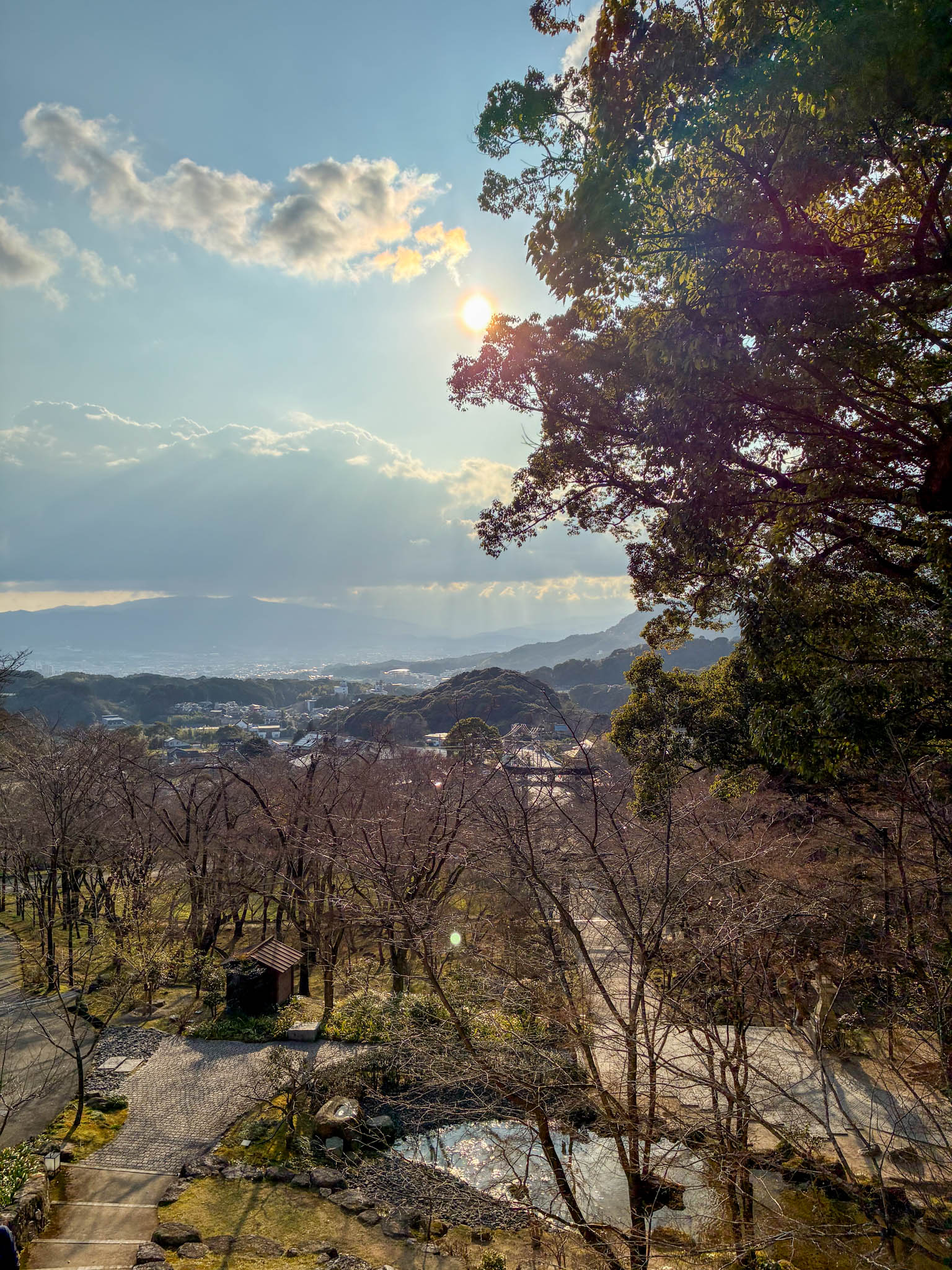 太宰府の街並みと、その向こうに広がる山並みが一望できるこのスポット。訪れたのが午後遅い時間だったので、西日が街全体を淡く照らし、遠くの山々には薄く雲がかかっていました。手前には冬枯れの木々と小さな池があり、季節の移ろいを感じる静かな景色です。