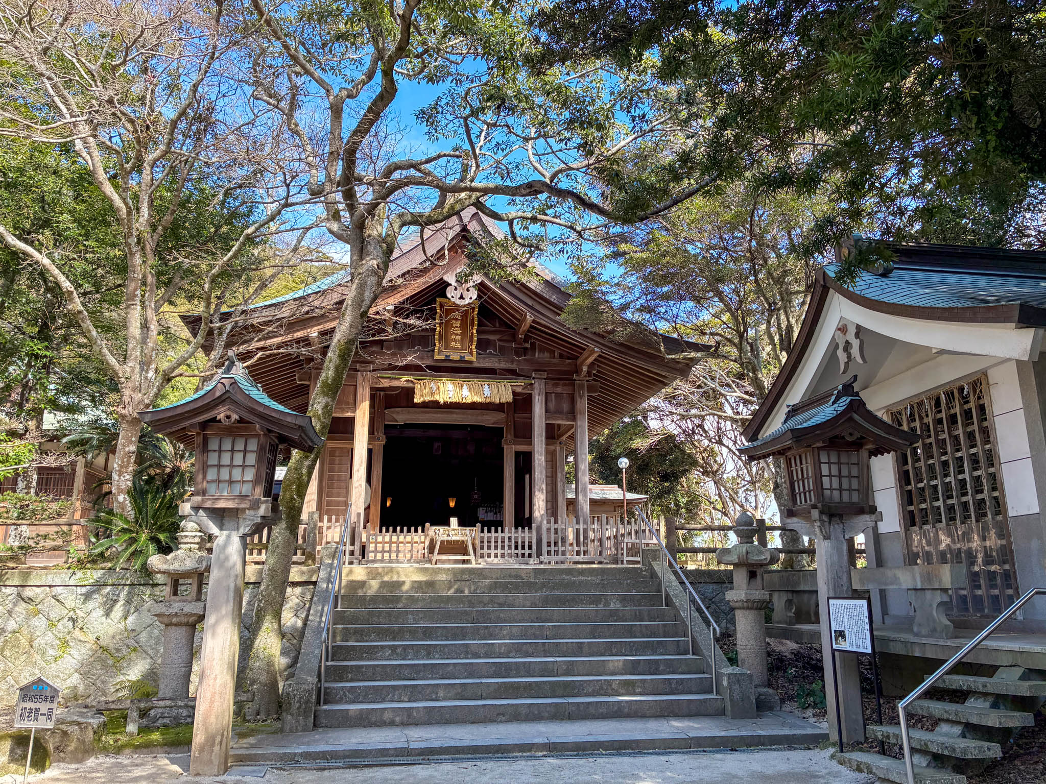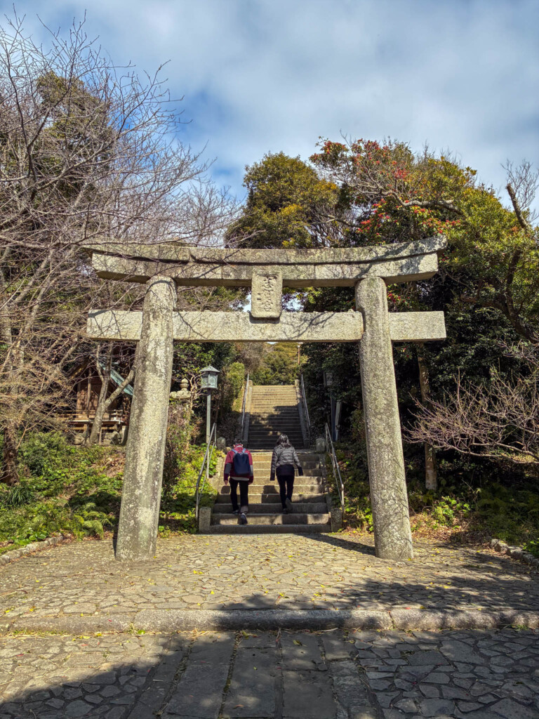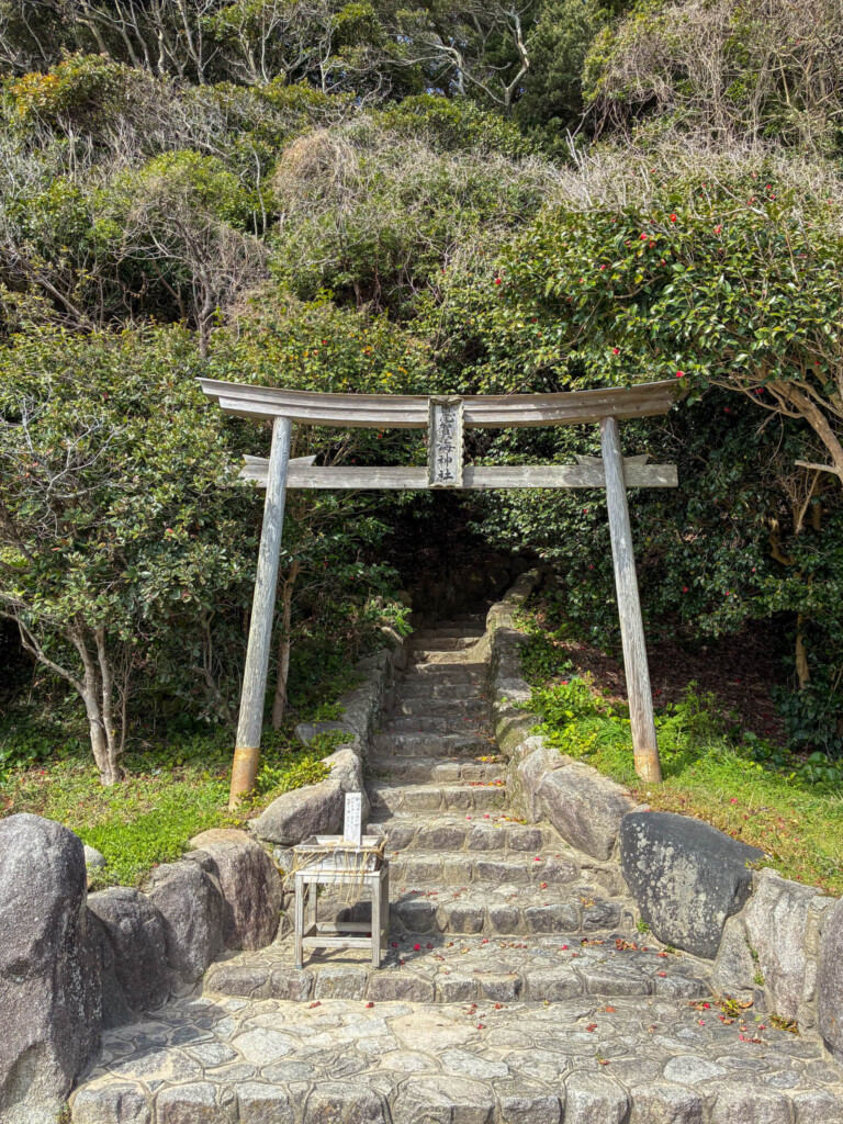 石段を上っていくと、木々のトンネルのような参道が続いています。耳を澄ませると、遠くから寄せては返す波の音が聞こえてくる。その合間に、どこかで鳥が鳴いている声も。途中で振り返ると、木々の隙間から海がちらりと見える。この「登っていく感じ」が、日常から聖域へと切り替わっていくようで、とても心地よかったです。