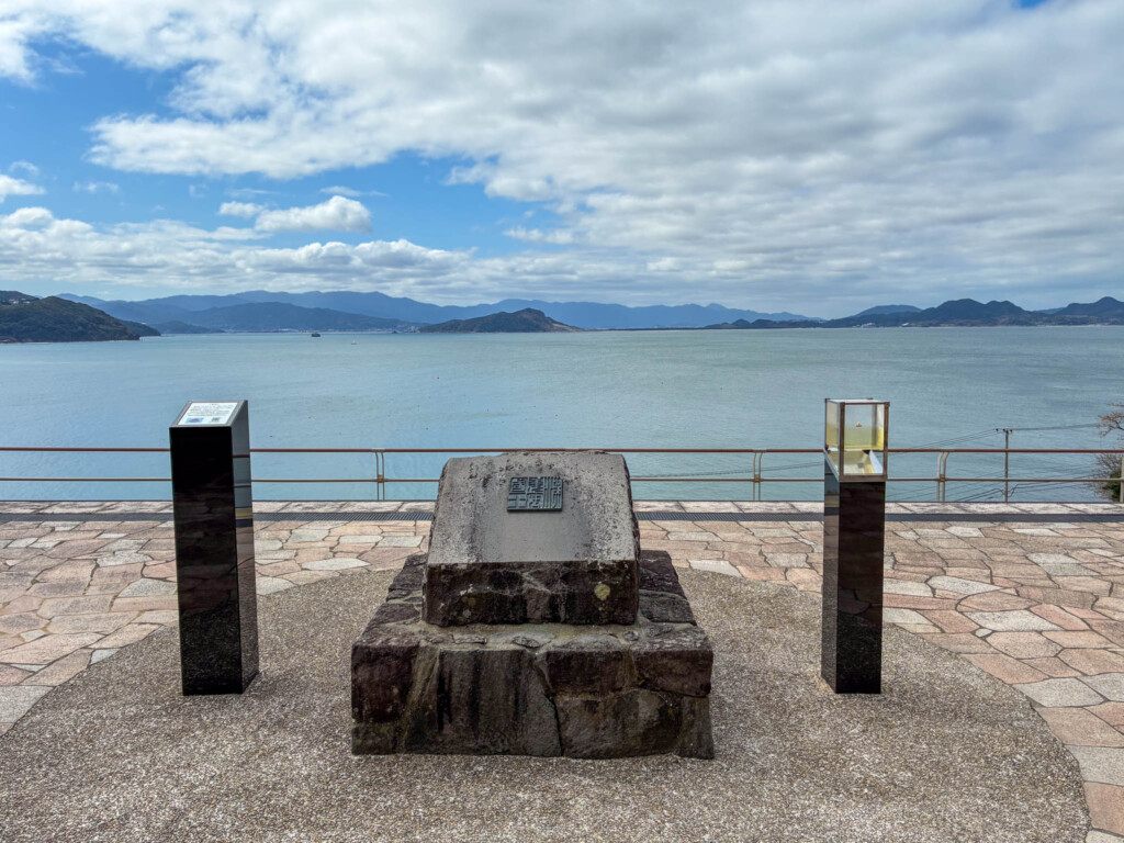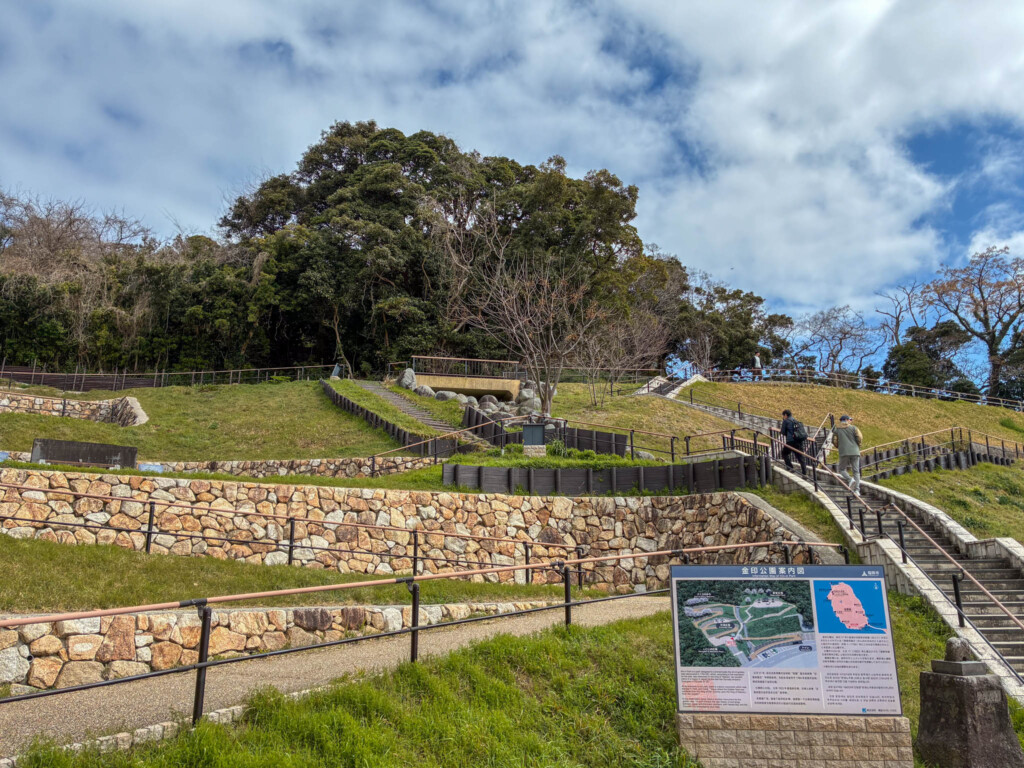 ここは1784年に「漢委奴国王」と刻まれた金印が発見されたとされる場所。公園内には金印のレプリカモニュメントがあり、博多湾を見渡せる展望スポットにもなっています。