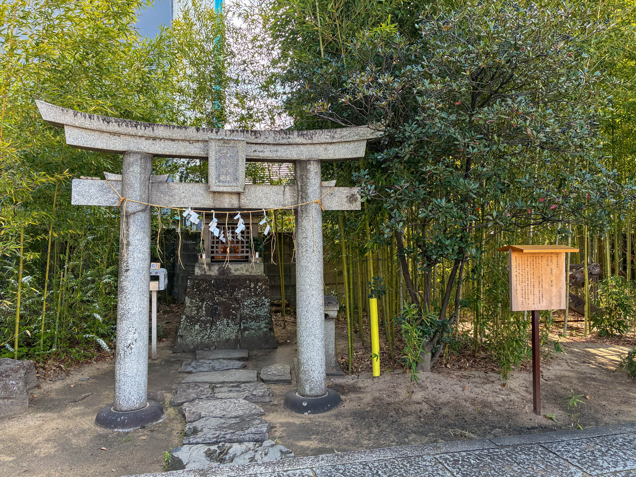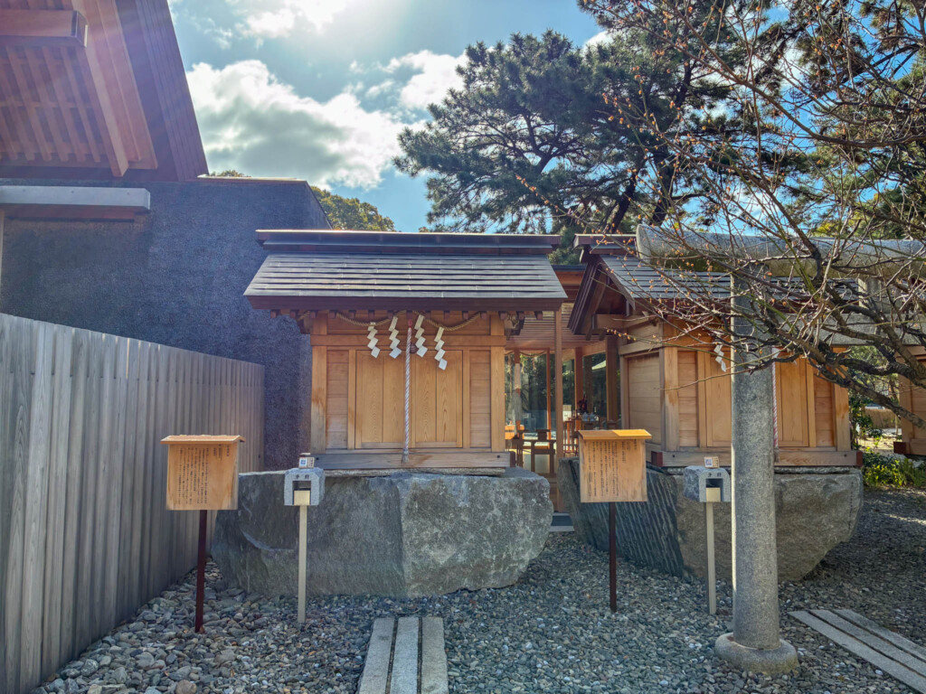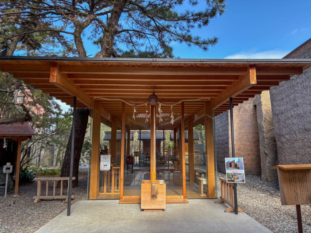 本殿建て替え時に仮宮として使われたガラス張りの社殿「光の宮」も見どころのひとつ。現在は境内社の拝殿として使用されていますが、伝統的な神社建築とは一線を画すモダンなデザインが目を引きます。茅葺壁の拝殿と並ぶことで、鳥飼八幡宮の「伝統と革新」というテーマがより鮮明に感じられます。