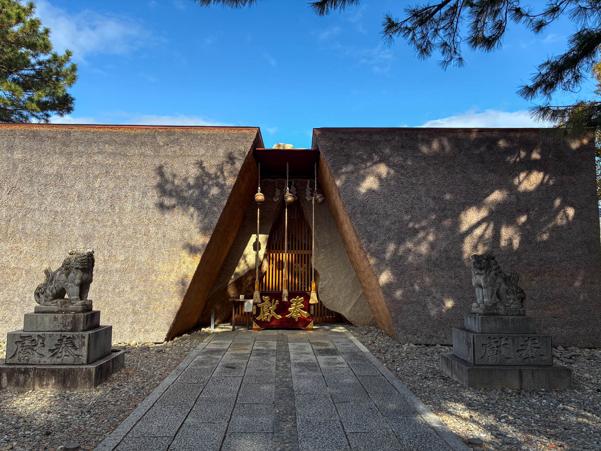 伝統的な神明造をベースにしながらも、茅葺壁や巨石柱と調和するようオリジナルのアレンジが加えられており、「古いのに新しい」という不思議な印象を受けました。