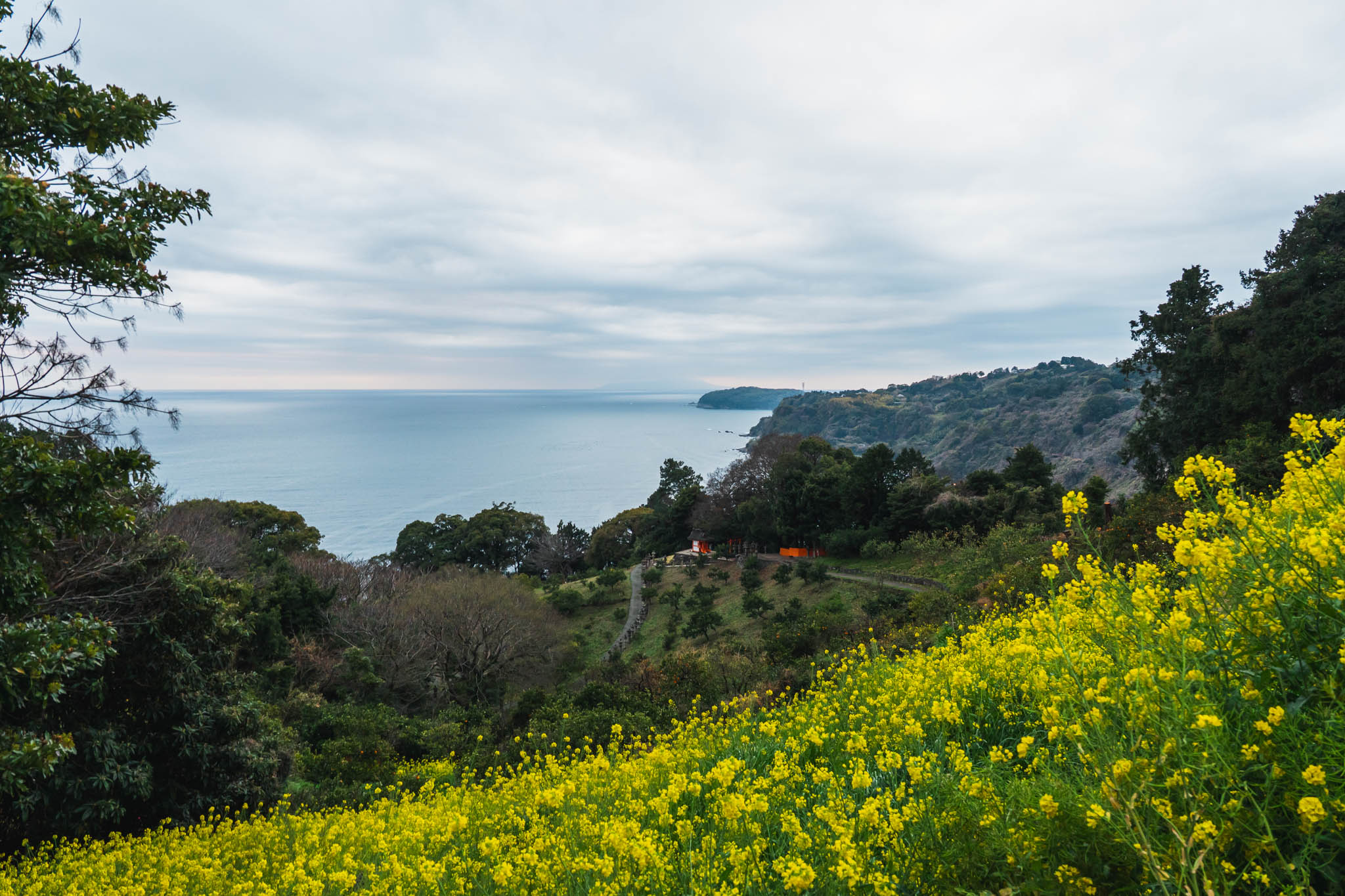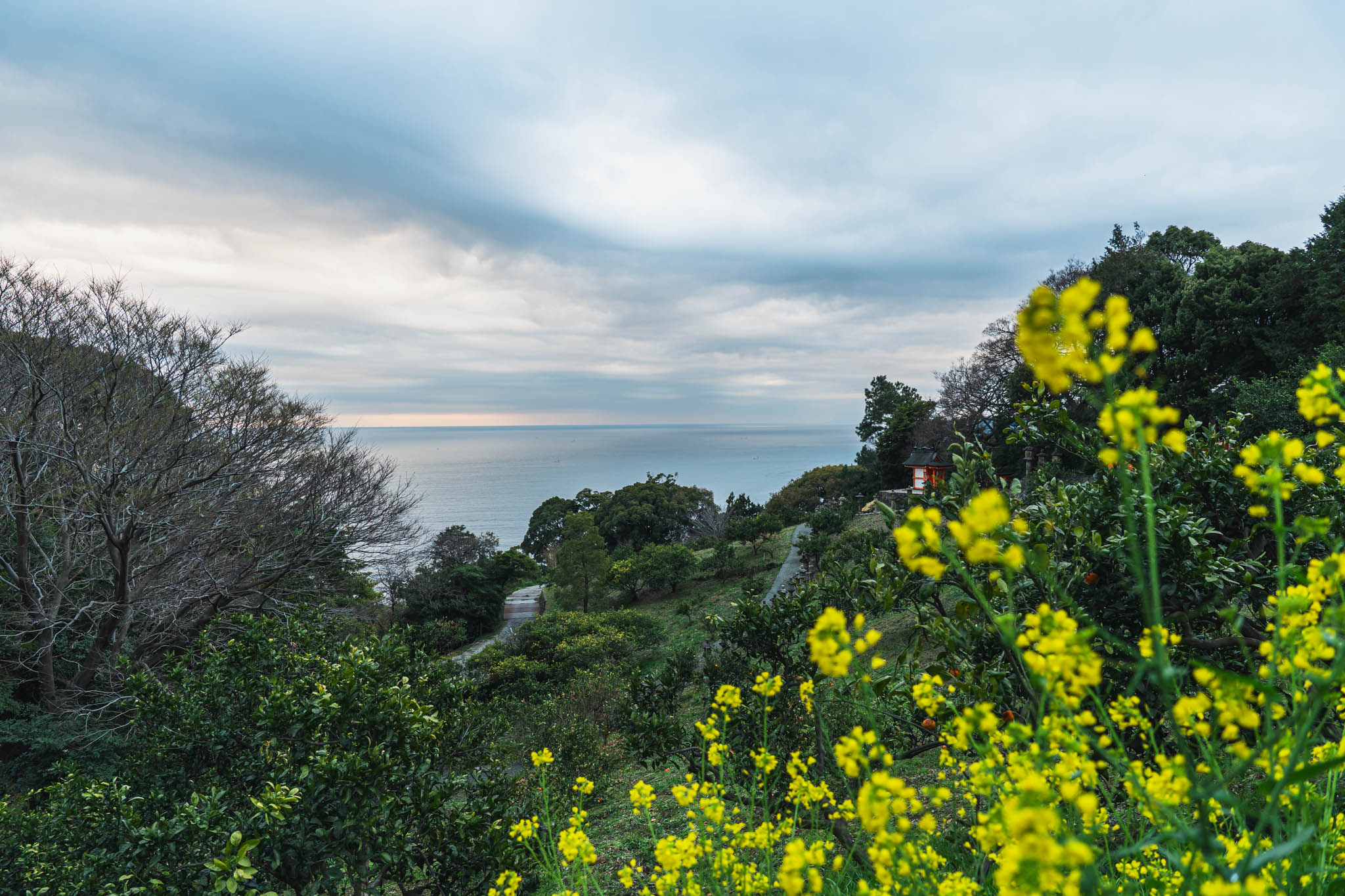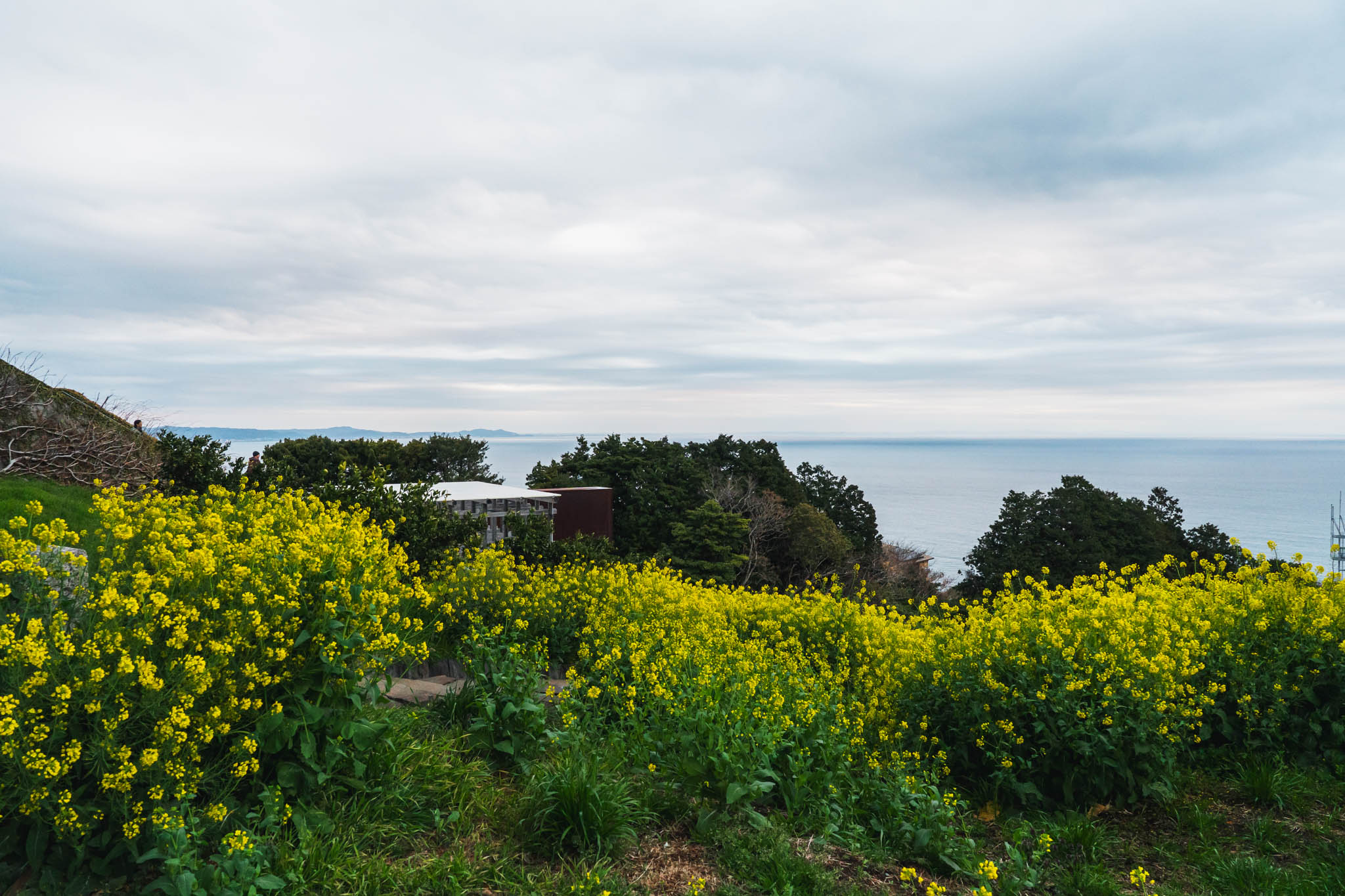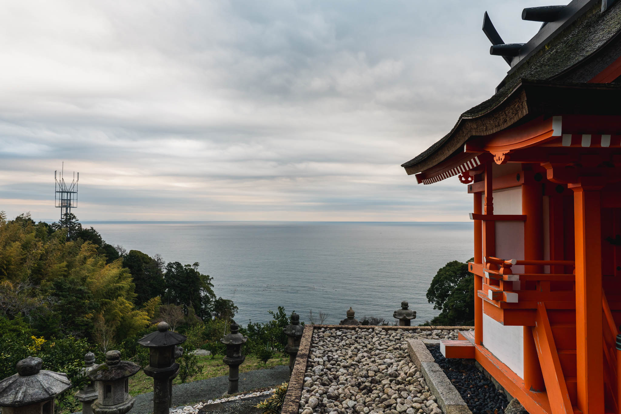 石舞台から眺める相模湾も、早朝ならではの景色だった。昼間は観光客で賑わうこの場所も、朝はひっそりとしていて、海と空の境界が曖昧な曇り空の下で、どこか異世界のような空気を纏っている。