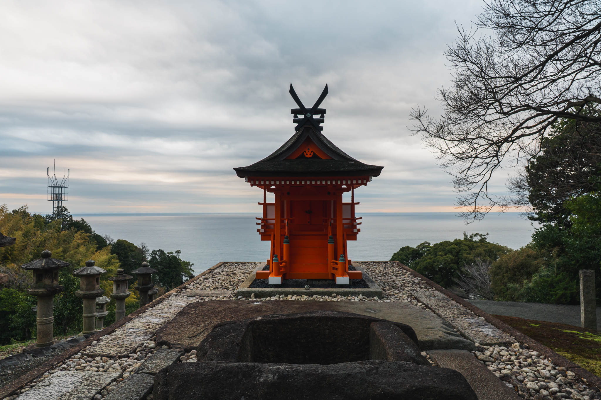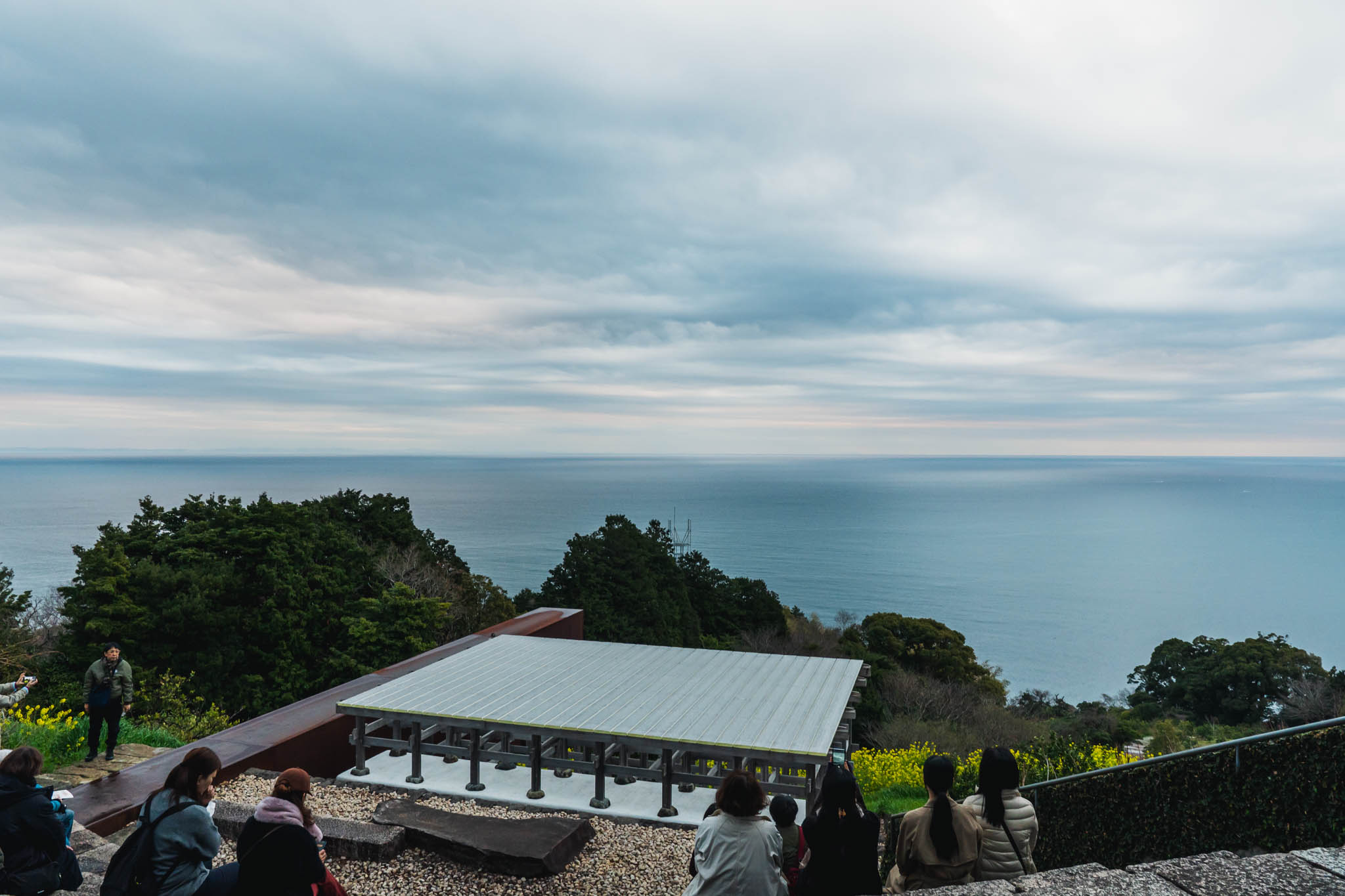 今回特に印象に残ったのは、やはり光学硝子舞台と石舞台だった。日の出は見えなかったけれど、曇り空の下で相模湾を背にした光学硝子舞台は、それだけで十分に美しい。ガラスの表面に空のグレーが映り込んで、晴れた日とはまた違う静謐な雰囲気がある。
