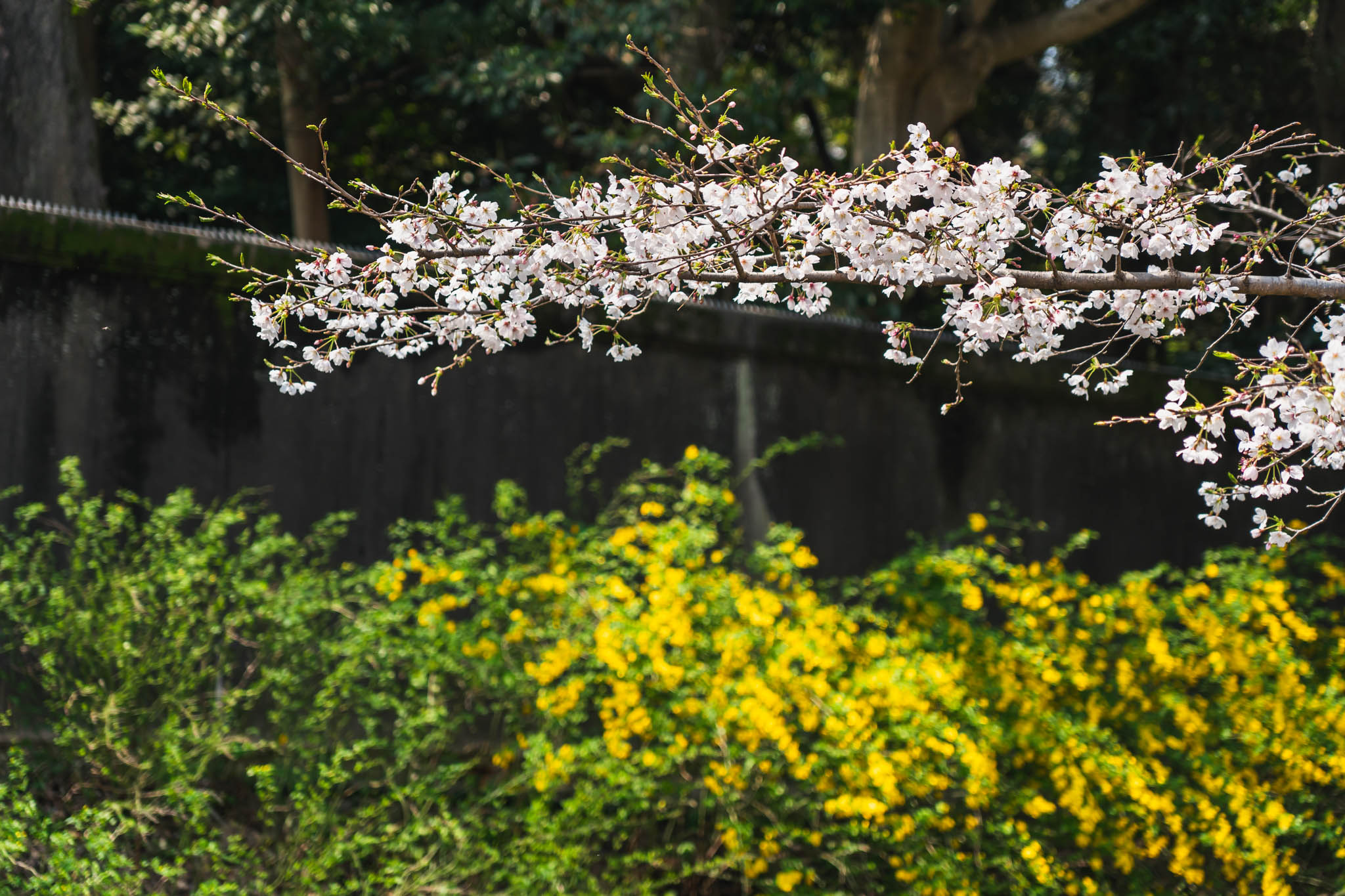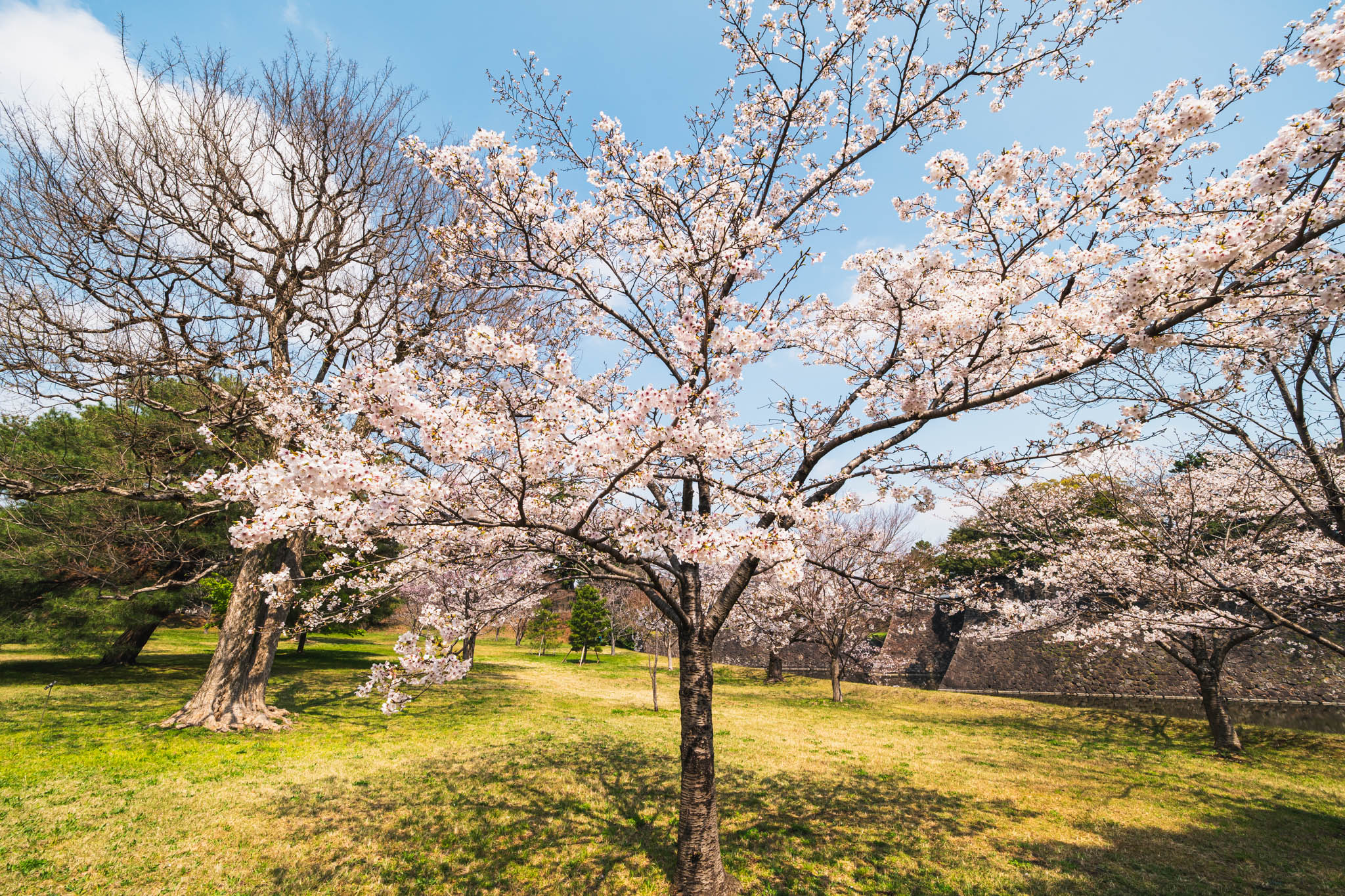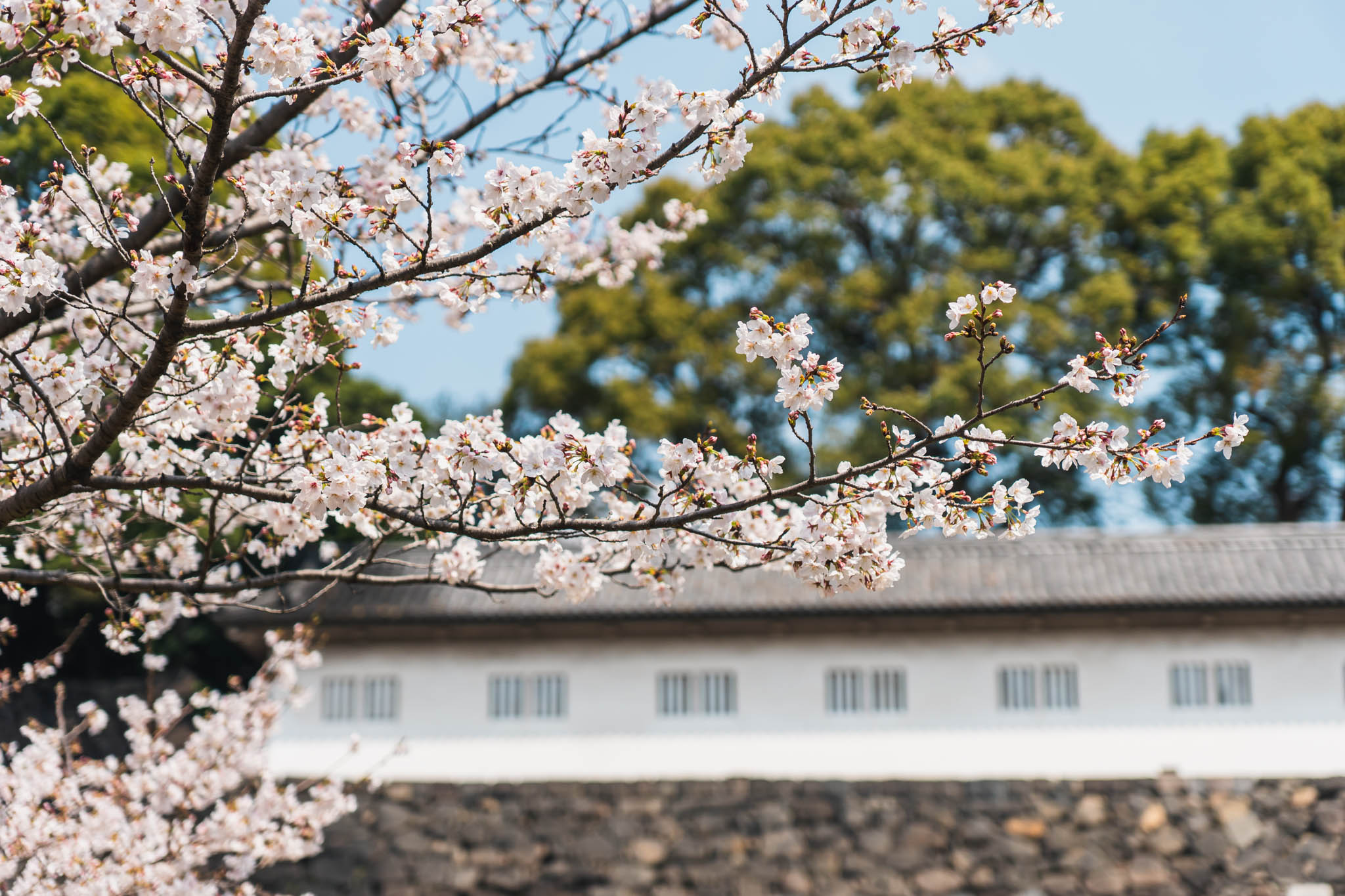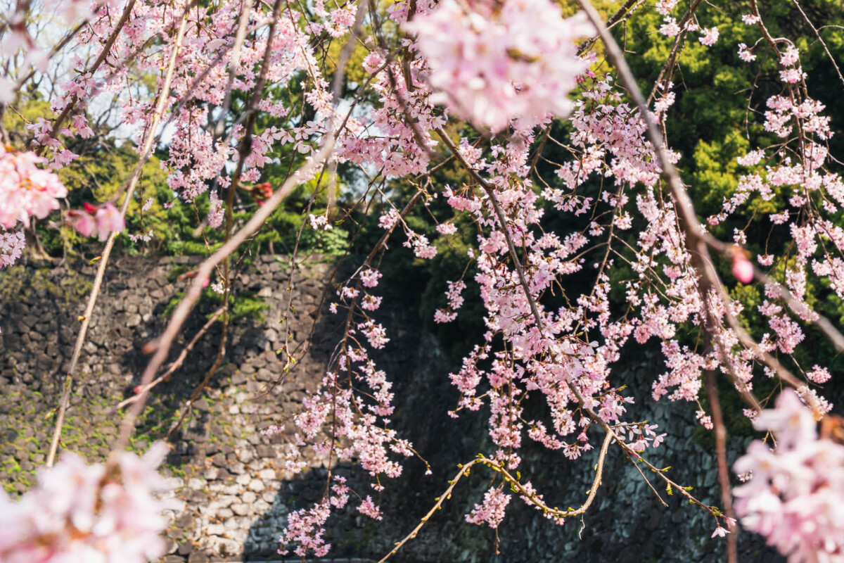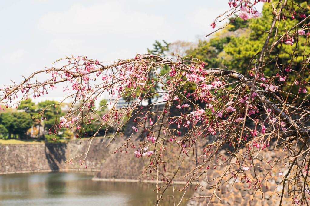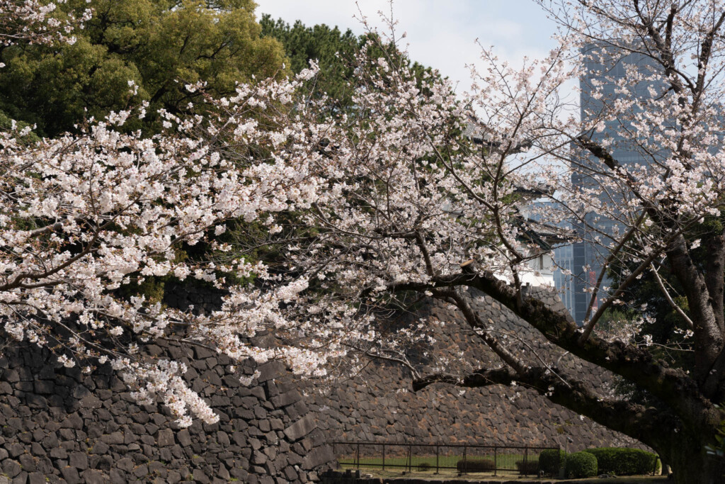 シダレザクラは特に見応えがあり、しなやかに垂れ下がった枝に薄ピンクの花が連なる様子は、何枚写真を撮っても撮り足りないくらいです。宮内庁庁舎の前では、富士見櫓を背景に桜が広がる景色を楽しめます。江戸城から現存する石垣と桜の組み合わせは、ここでしか見られない景観です。