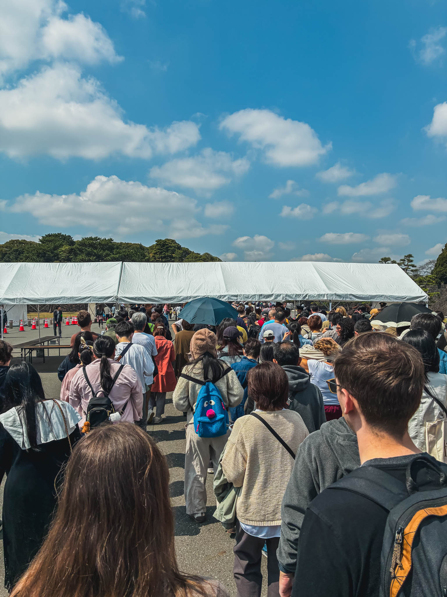 皇居乾通りの一般公開は非常に人気が高く、時間帯によってはセキュリティチェックでかなりの待ち時間が発生することがあります。混雑のピークは昼前後から午後にかけてで、今年も私が入場した後から、来場者はどんどん増えていきました。