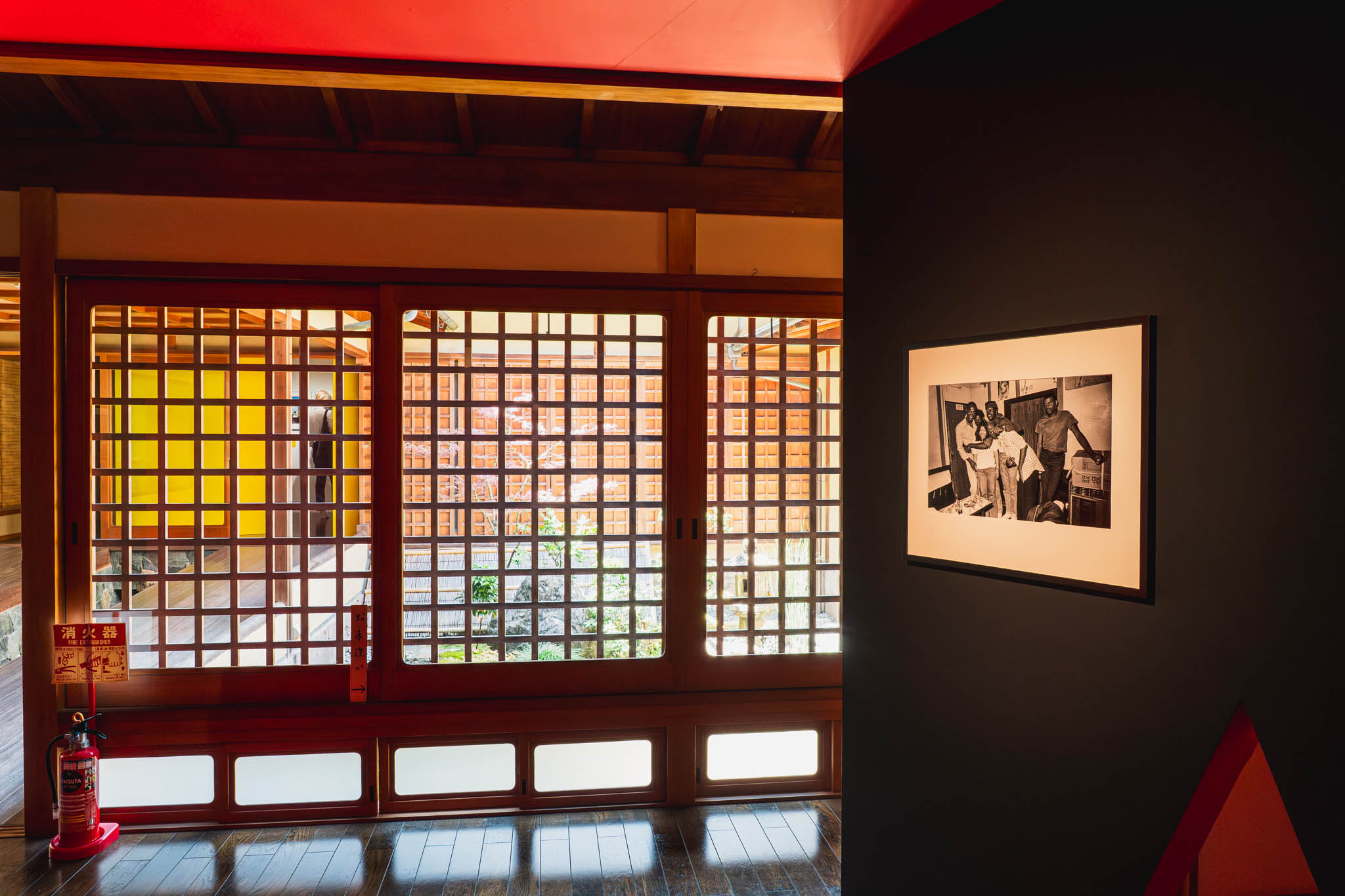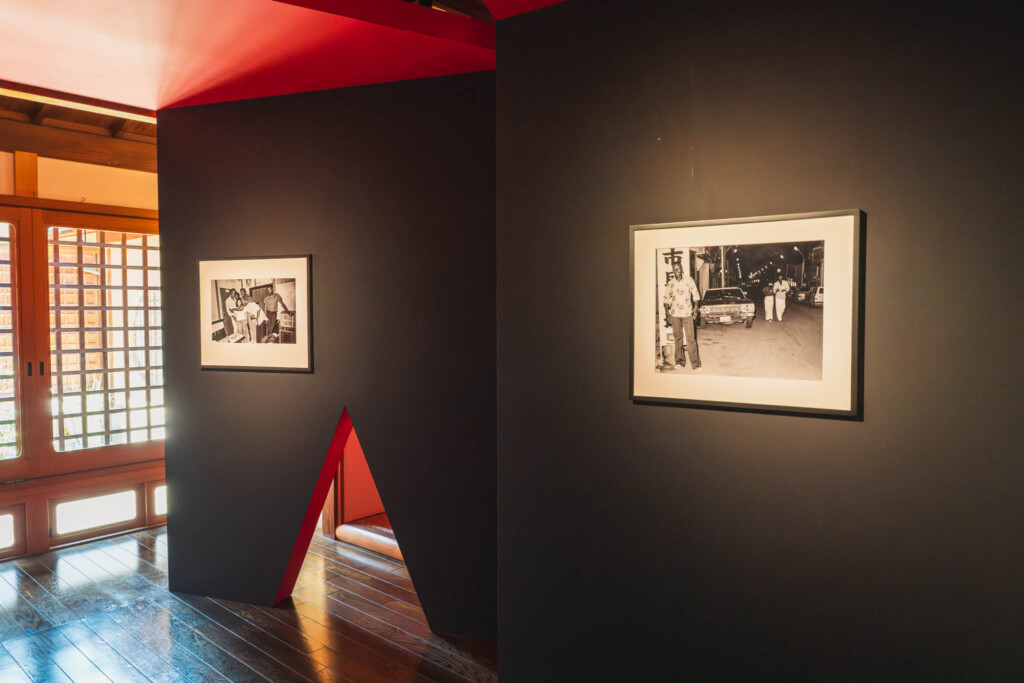 誉田屋源兵衛は、240年以上の歴史を持つ京都の帯の老舗。その「竹院の間」という和の空間に、石川真生の写真が並んでいました。静謐で落ち着いた日本的な空間と、石川の写真が持つ剥き出しのエネルギーとのコントラストが、強烈に印象に残りました。