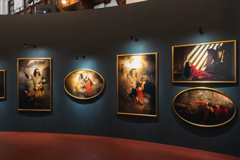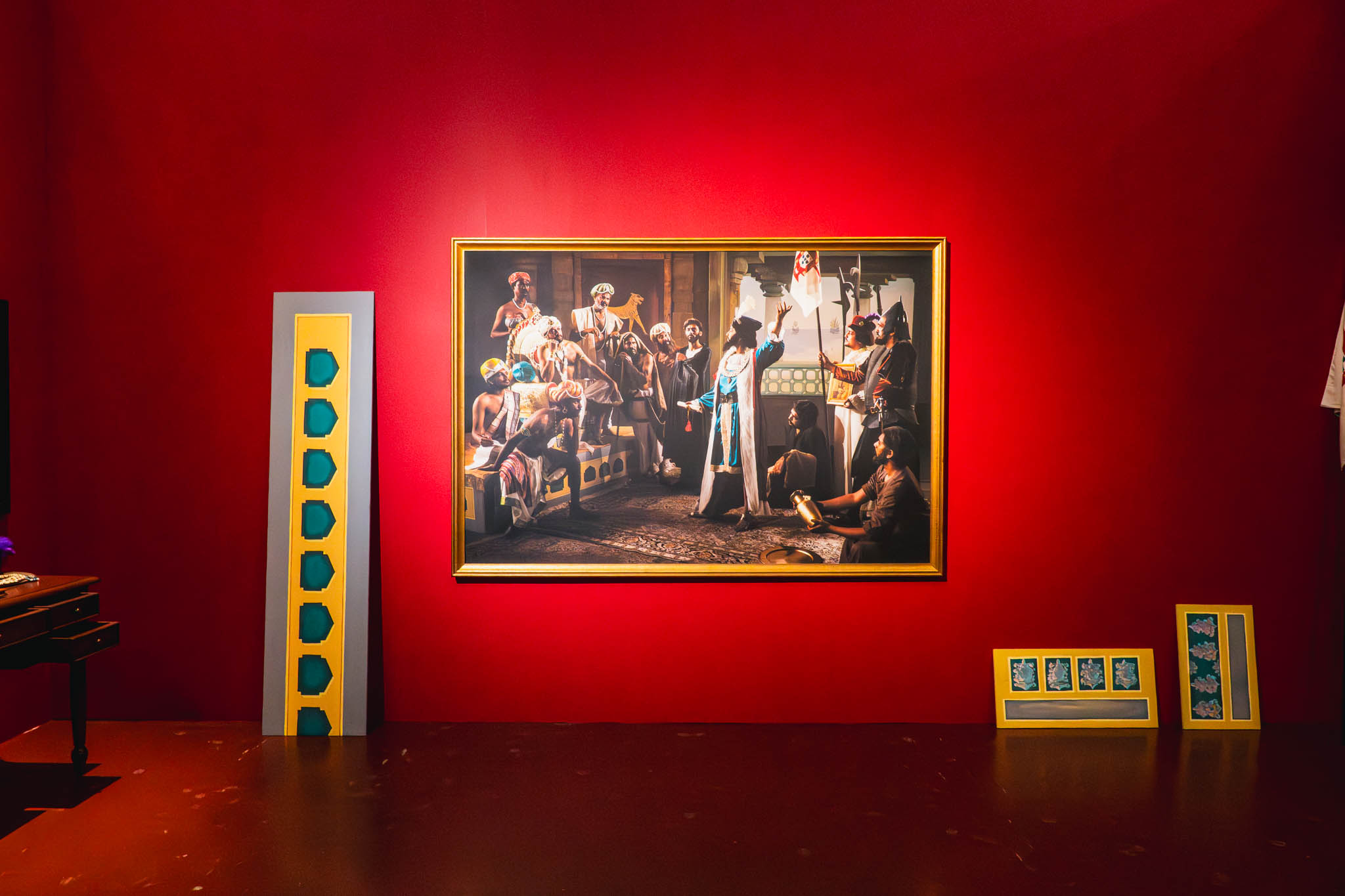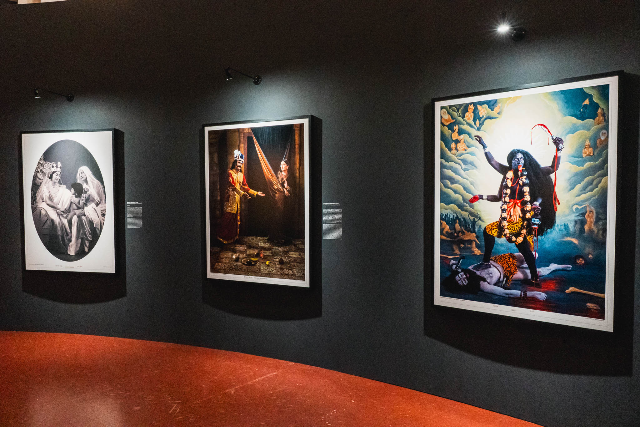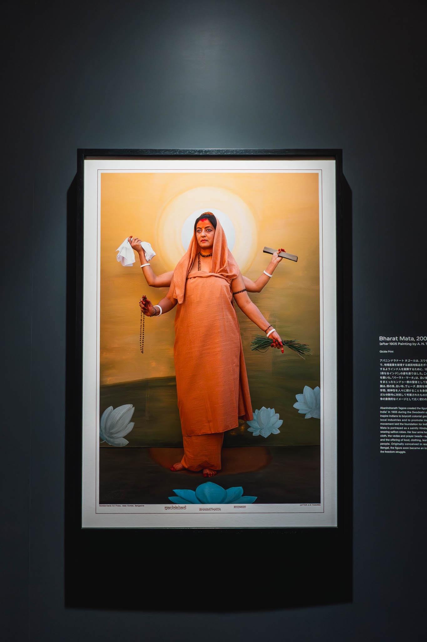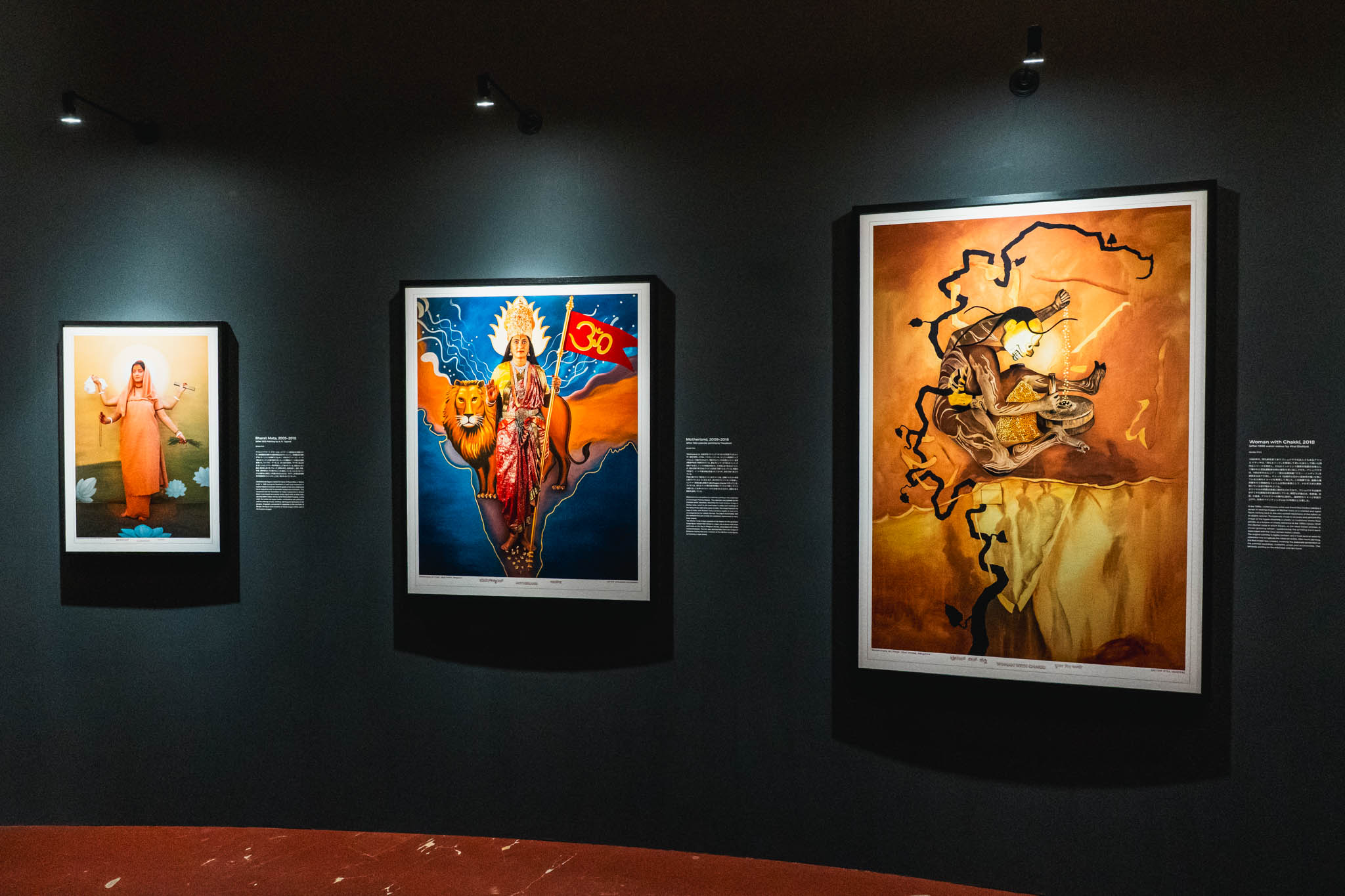 「現代インド美術界で最もエンターテイニングなイコノクラスト」とも評される彼女の手法は、歴史的な絵画や図像の中に自らが「演じて」入り込むというもの。今回の展示では、1898年の絵画をもとにヴァスコ・ダ・ガマとカリカット王の両者を自ら体現した〈The Arrival of Vasco da Gama〉や、インドという国家の変容を探り続ける〈Mother India〉シリーズが並んでいました。