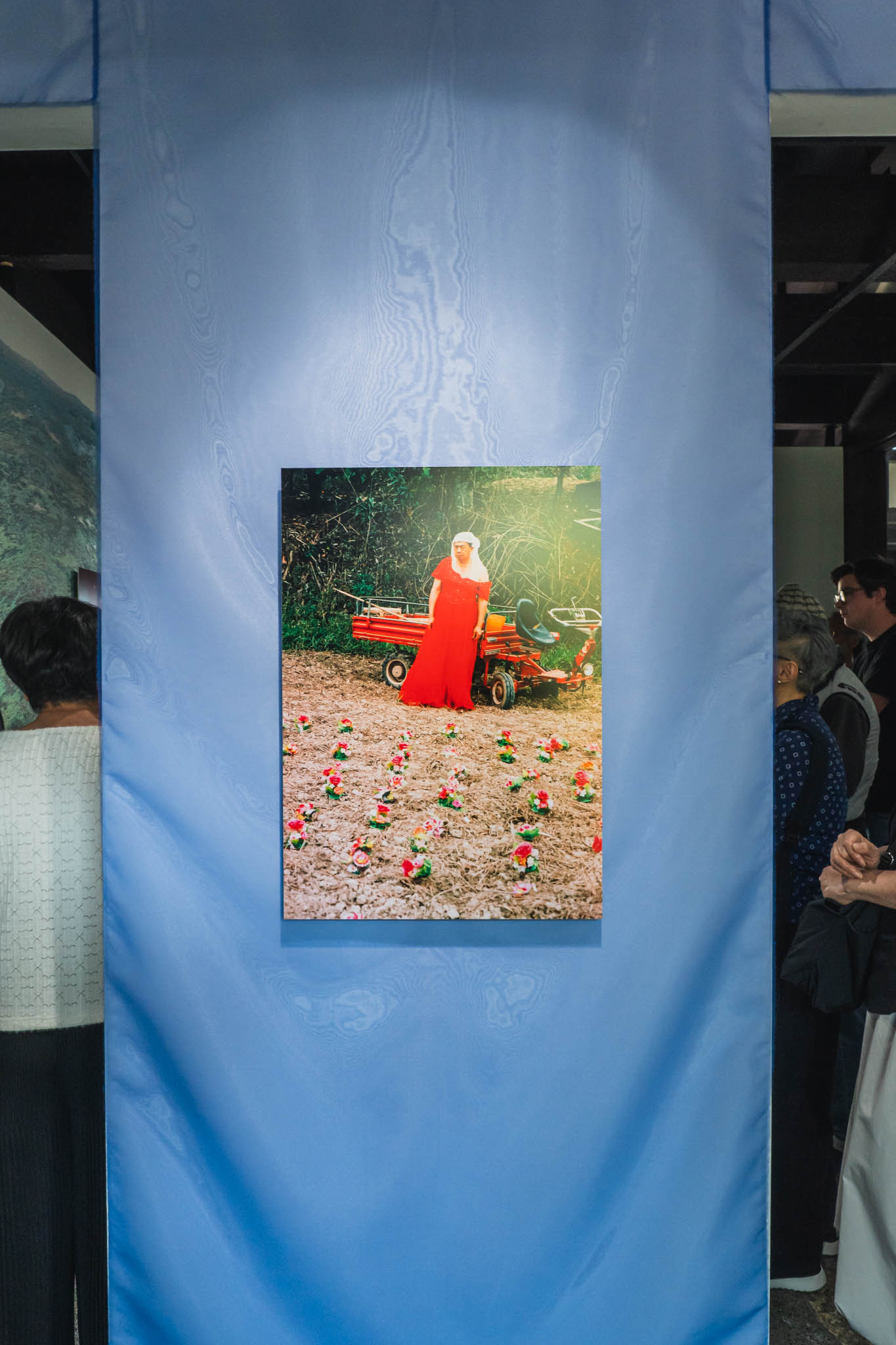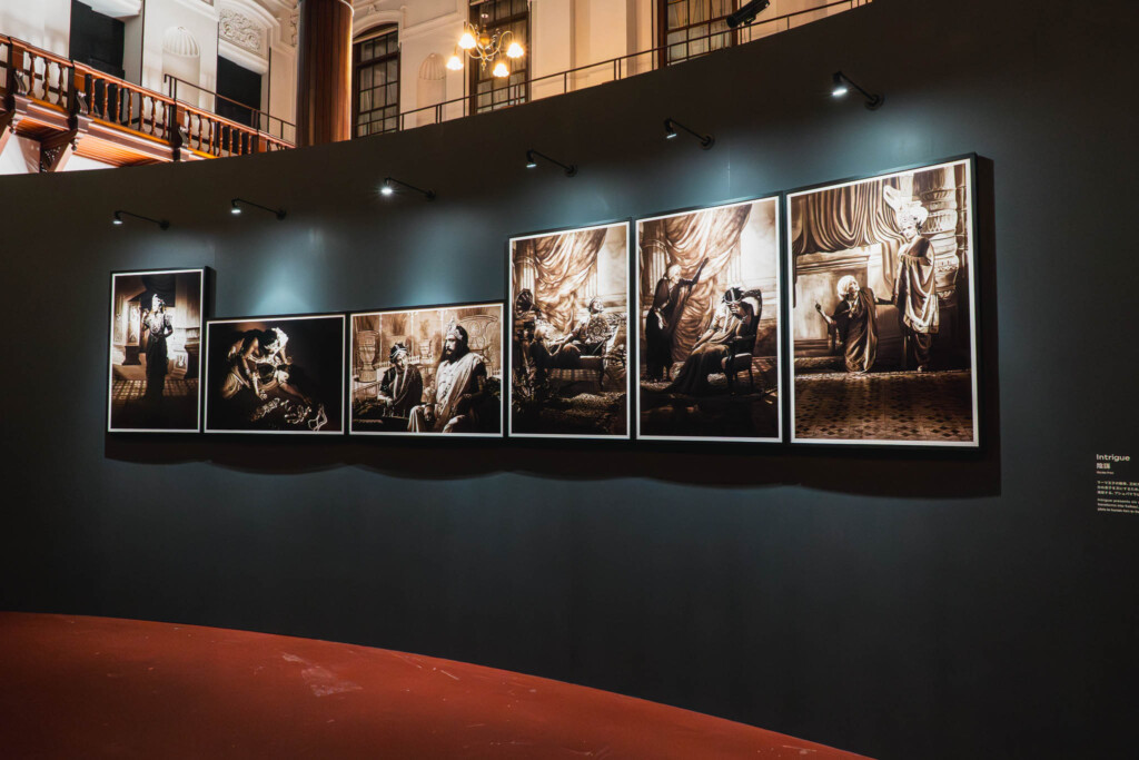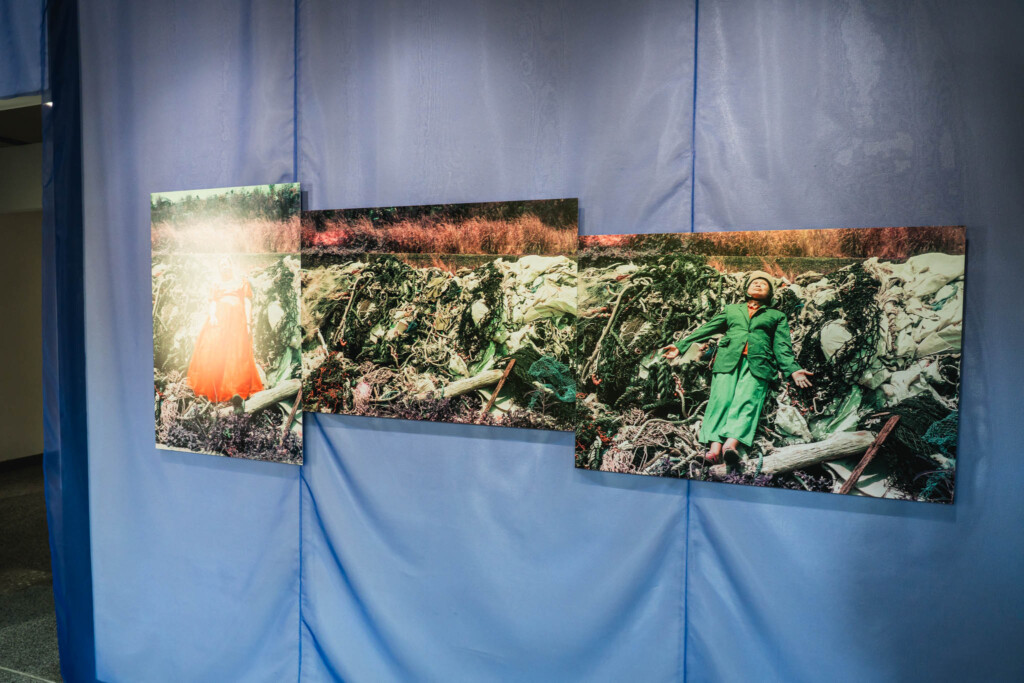 作品に使われた小道具や背景もそのまま展示されていて、写真が生まれた「現場」ごと見せるような演出になっています。デジタルで整えたような完璧さとは真逆の、アナログで演劇的な質感。それがかえって、作品の背後にある概念の重さを際立たせていました。