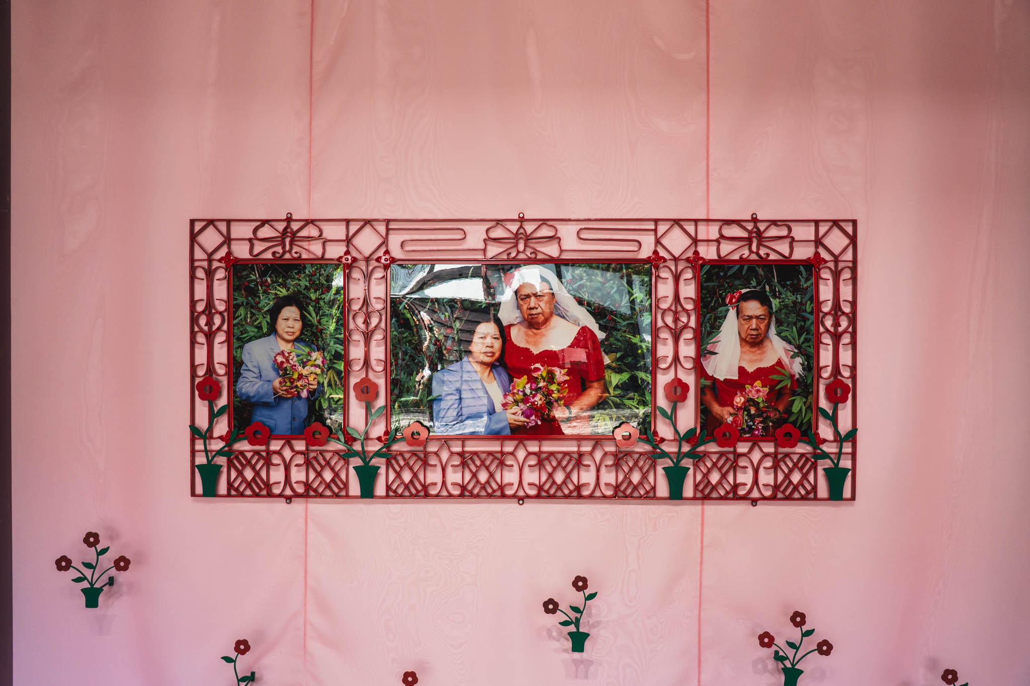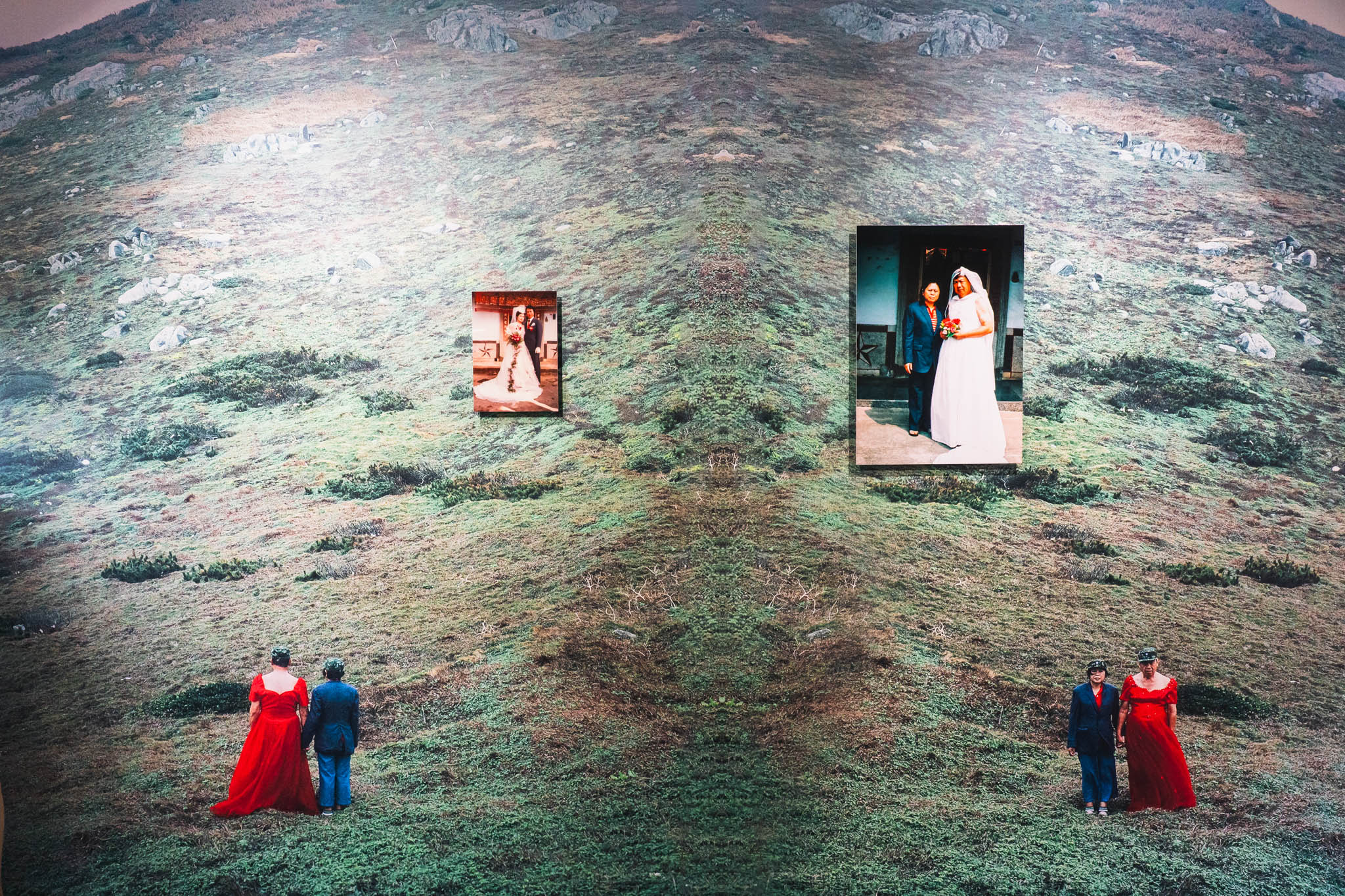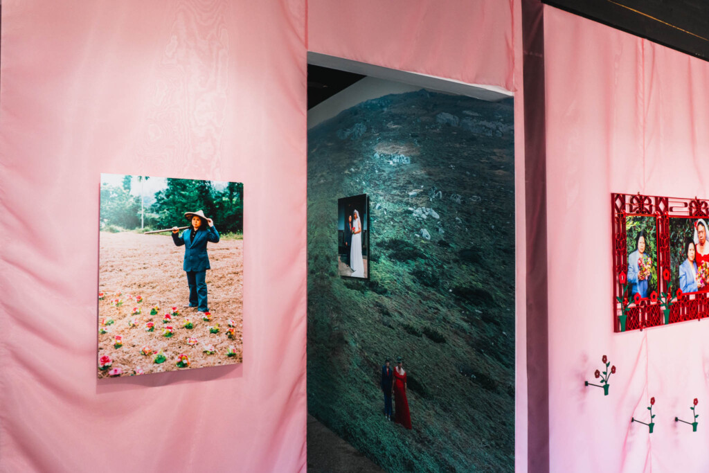代表作は〈My Parents〉シリーズ。2009年に実家で発見した両親の結婚写真をきっかけに制作が始まり、父親にウェディングドレス、母親にスーツを着せ、あらためて「再婚」写真として撮影するという作品です。フィルムカメラが生み出す幻想的なトーンが、ジェンダーの固定観念と社会規範へのまなざしをやわらかく、しかし確かに届けてきます。
