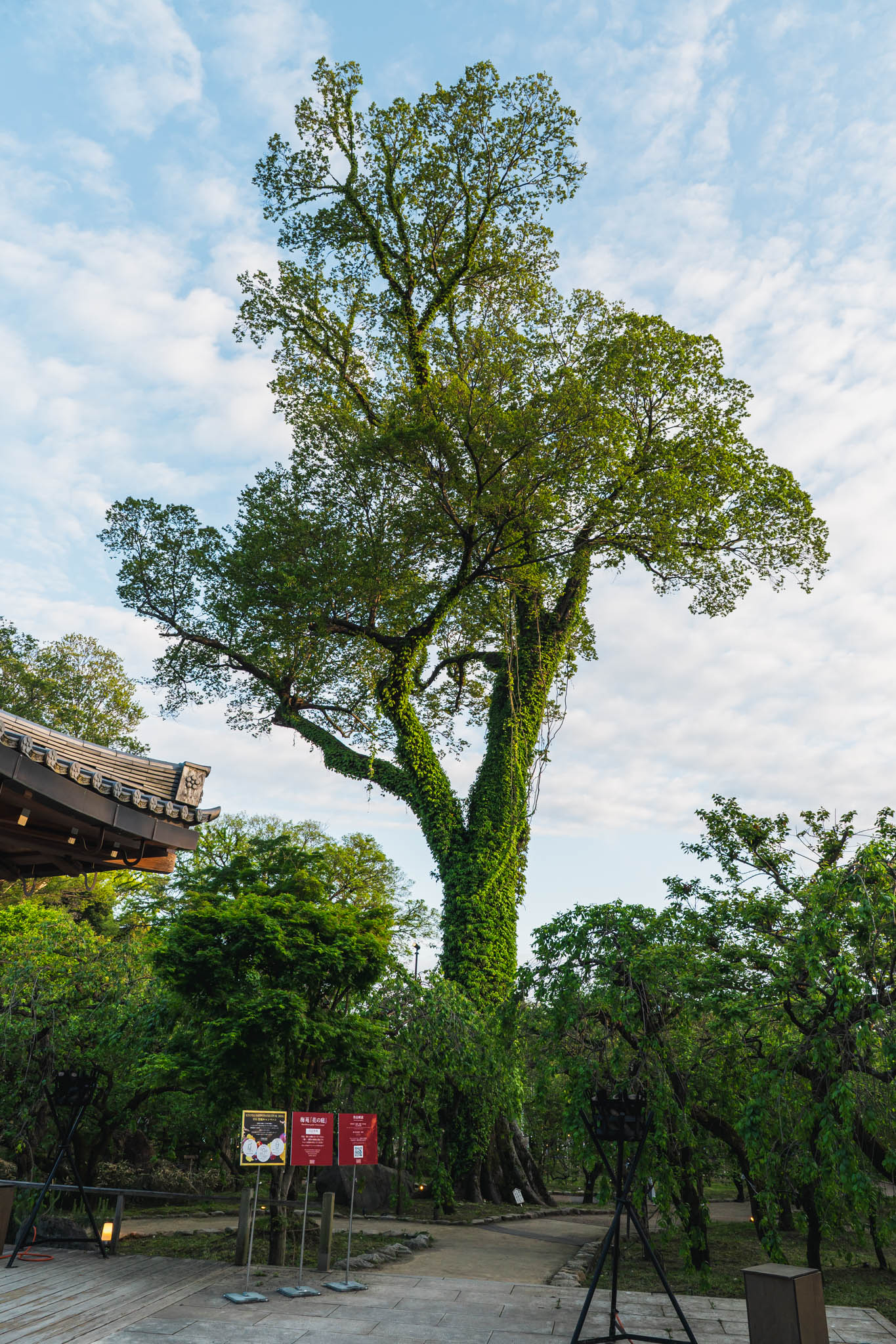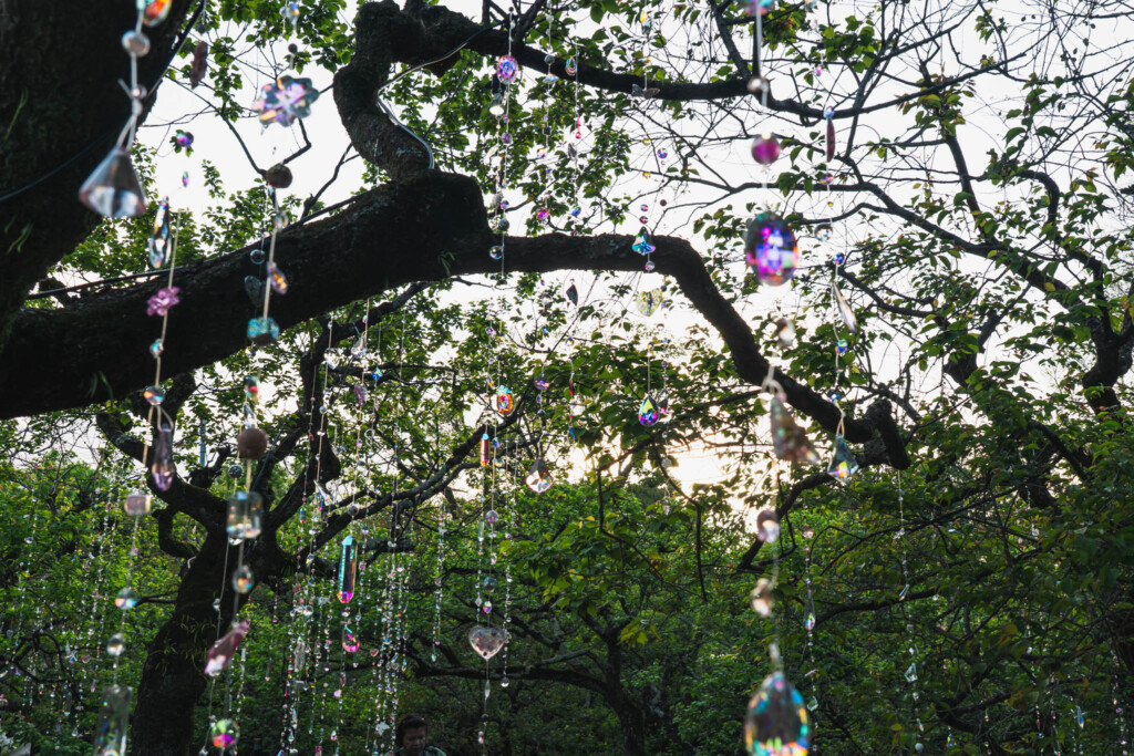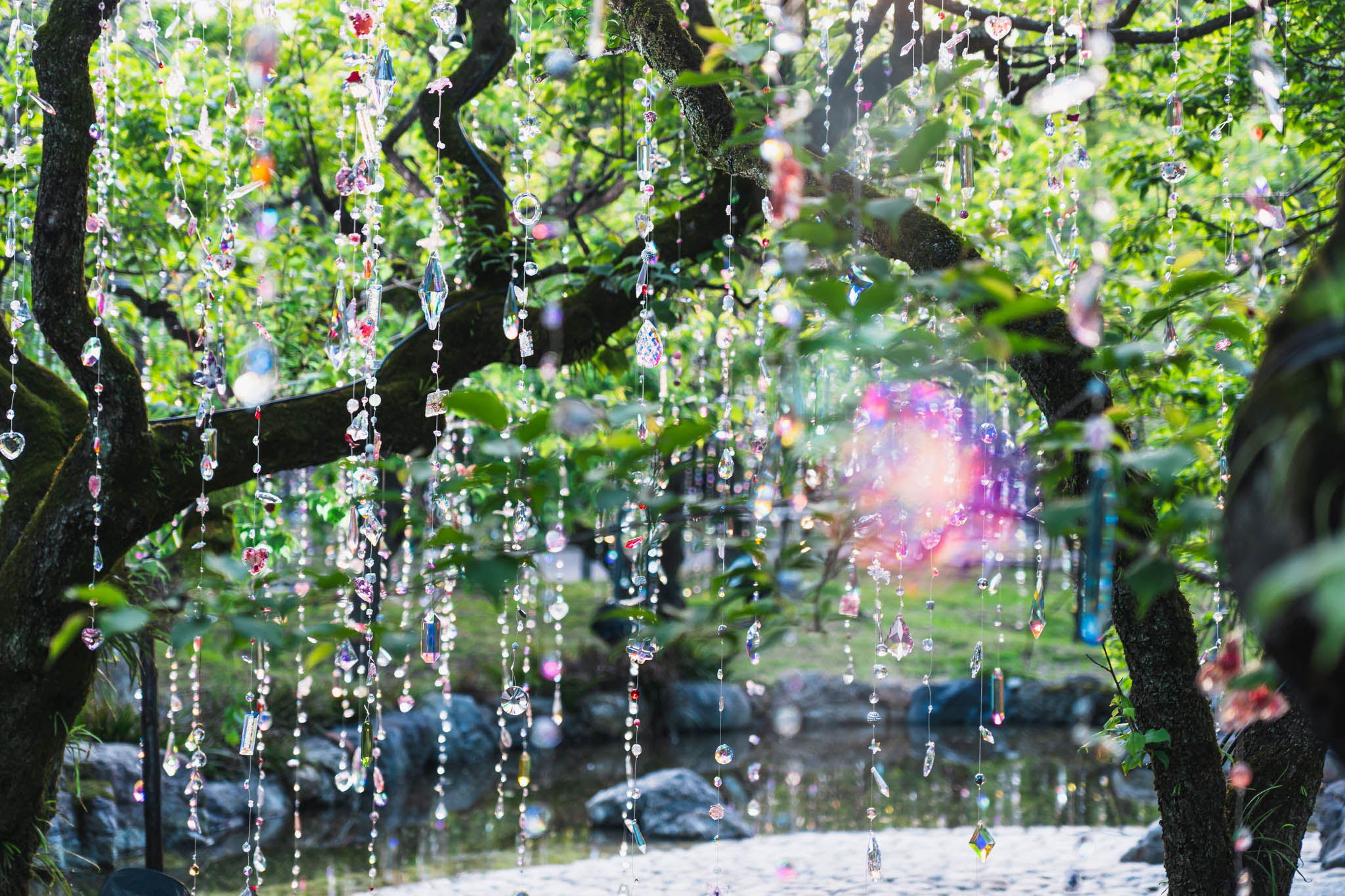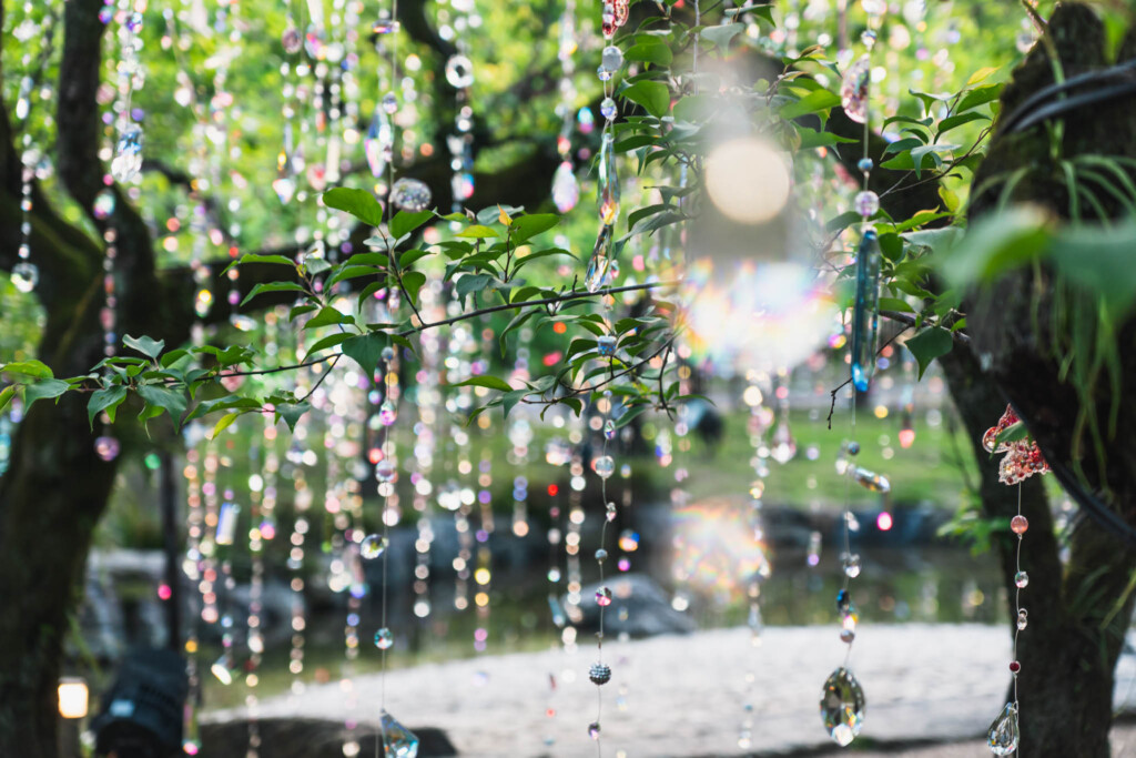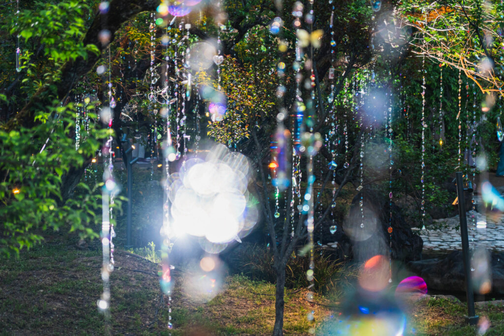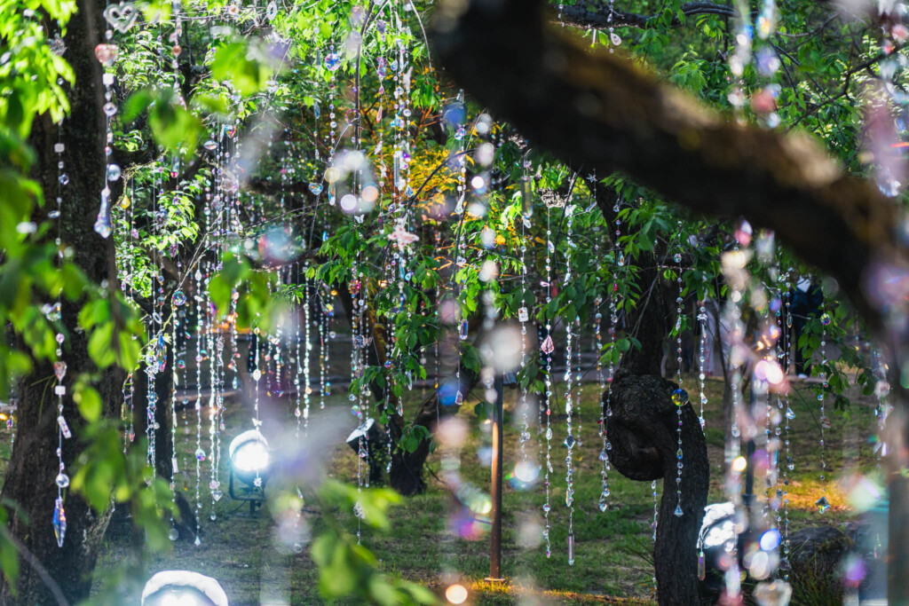 梅苑「花の庭」に展開される「光と花の庭」は、木々の間に1200本ものクリスタルを吊るしたインスタレーション。菅原道真が詠んだ「梅花似照星(梅の花は輝く星に似ている)」という詩から着想を得た作品です。