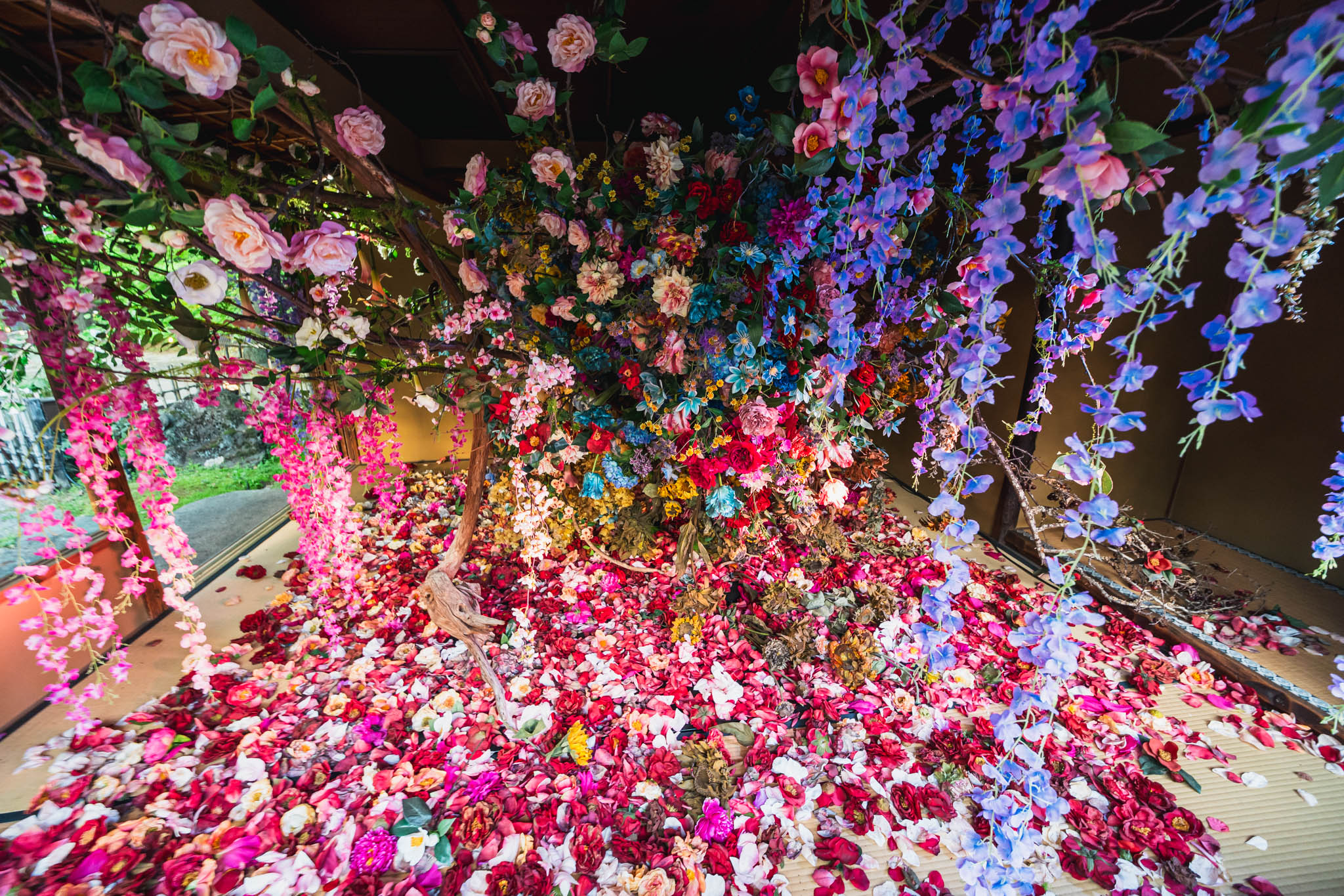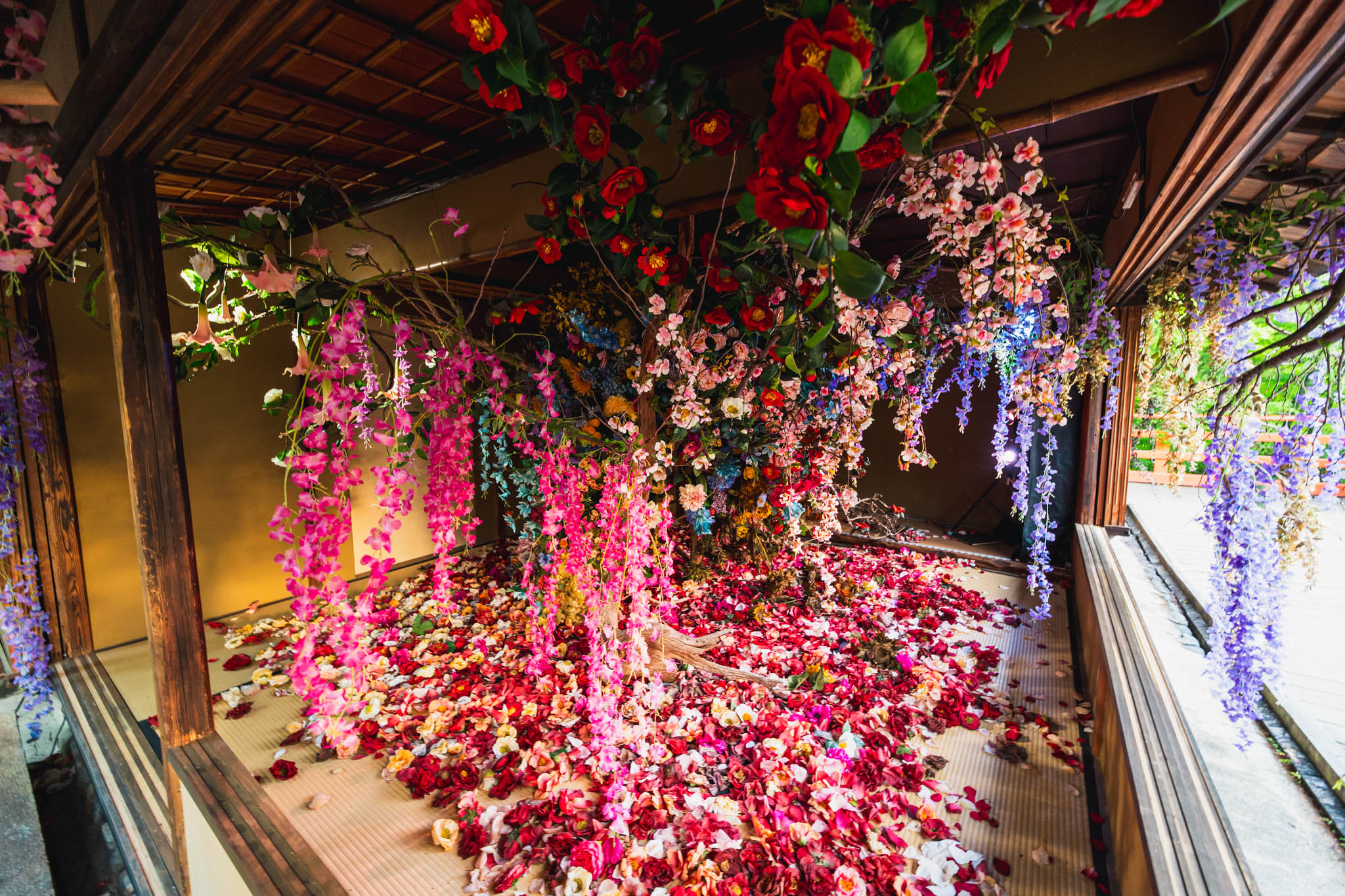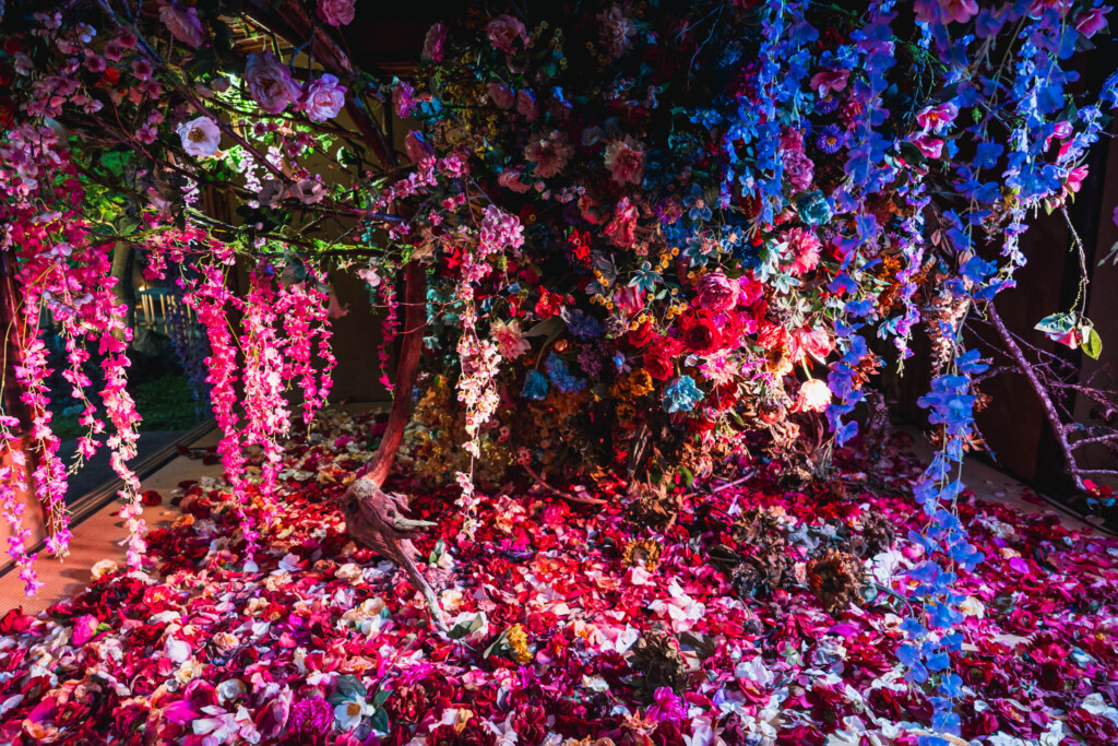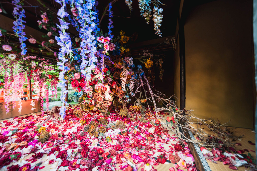 茶室で展開される「残照」は、咲き誇る花と枯れゆく花を同時に映し出す空間インスタレーション。命の循環のなかに潜む、静かな輝きを発見するための場所として設えられています。