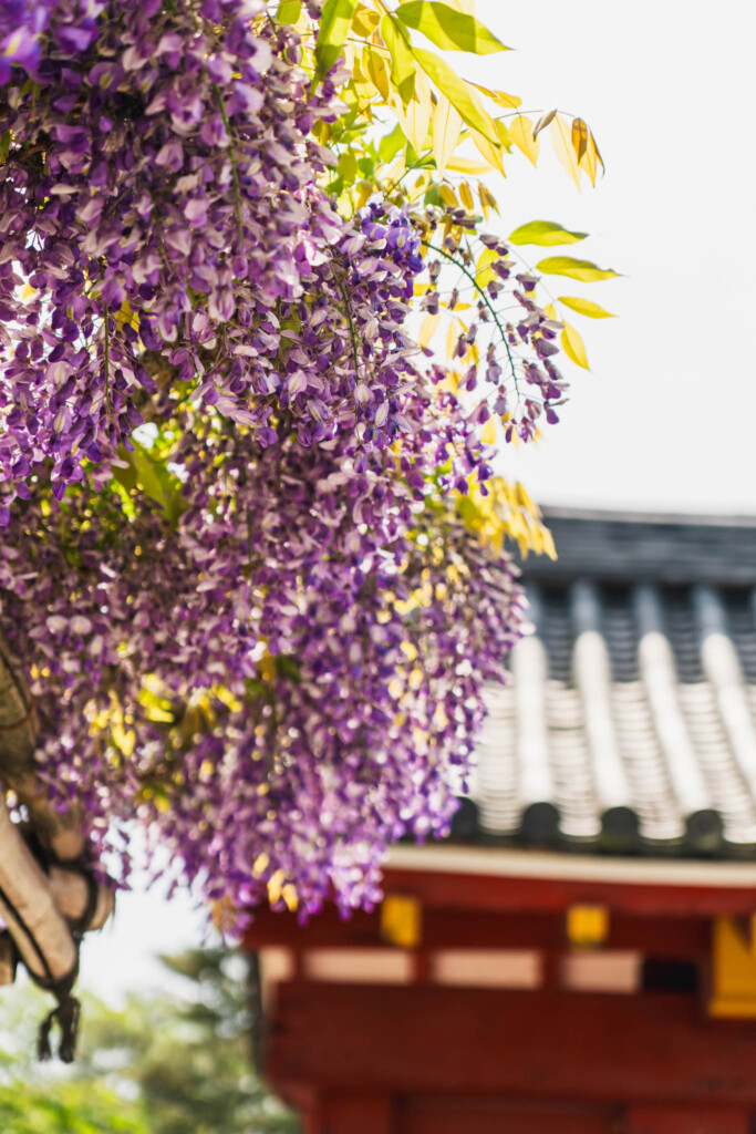 訪れた日は、ちょうど藤の花が見頃を迎えはじめたころ。表門をくぐった瞬間、紫色の花の滝のようなノダフジが目に飛び込んできて、思わず足が止まってしまいました。花の周りには蜂がたくさん飛び交っていて、あの独特の羽音が境内に響いている。「ああ、もう春なんだ」と、五感でしっかり感じられる朝でした。