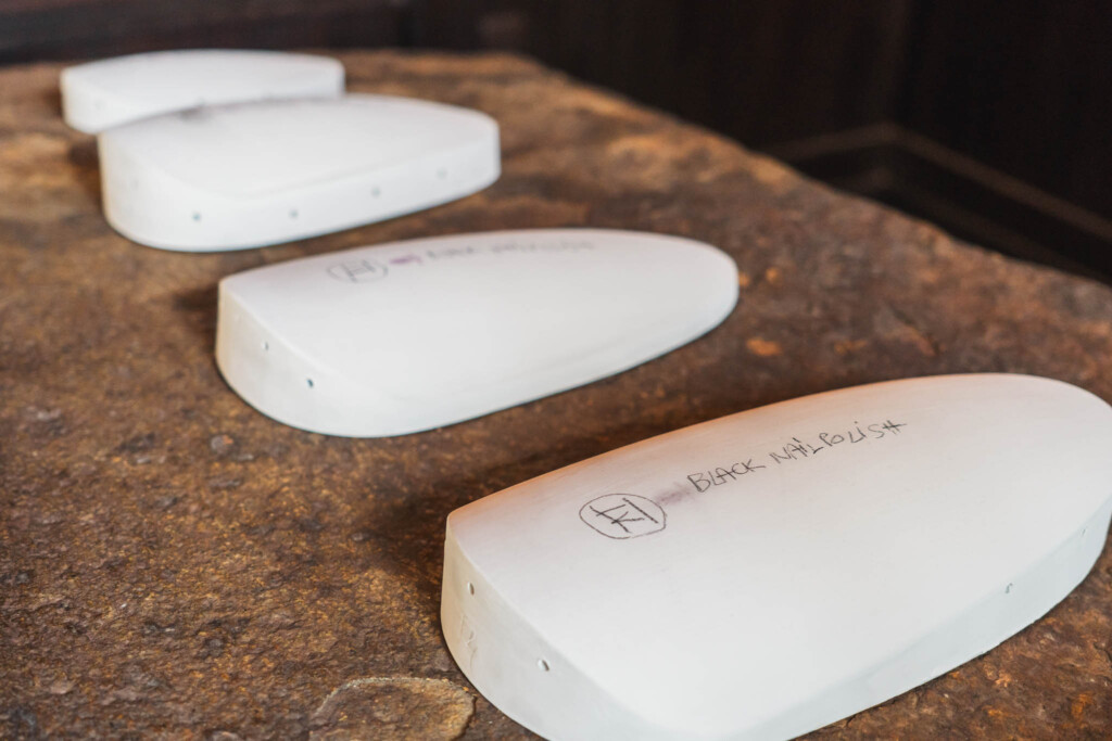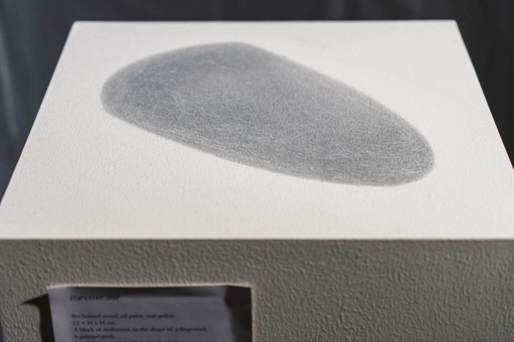 入口近くの石のテーブルには、《Black Nail Polish》という小さな作品が置かれていました。爪のような形をした、ニンフェンブルク磁器製の焼成用具5点で構成された作品です。