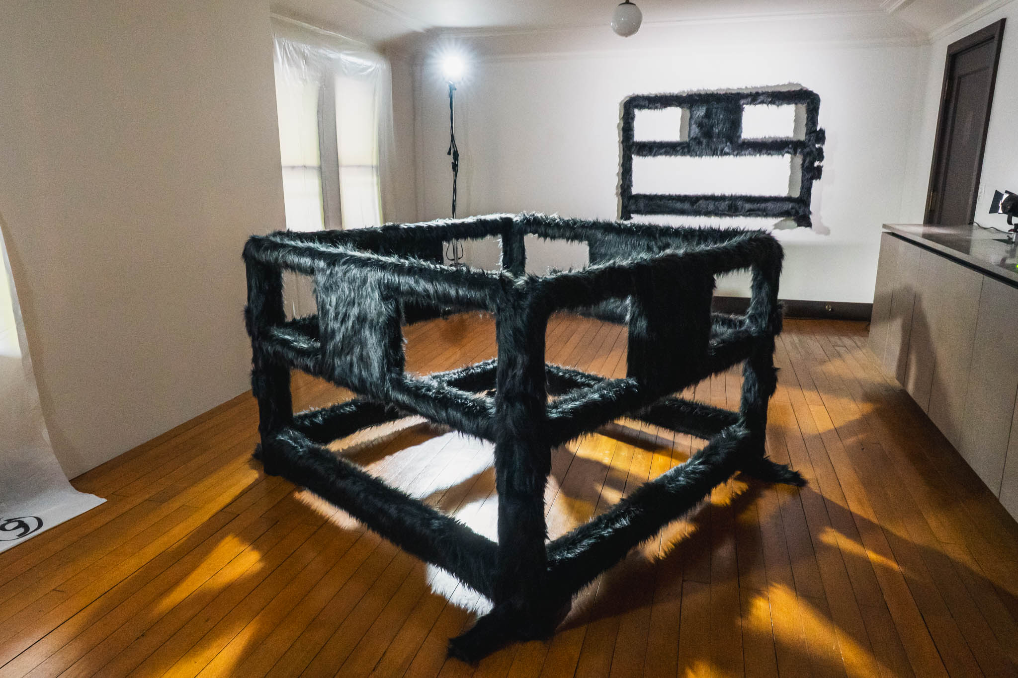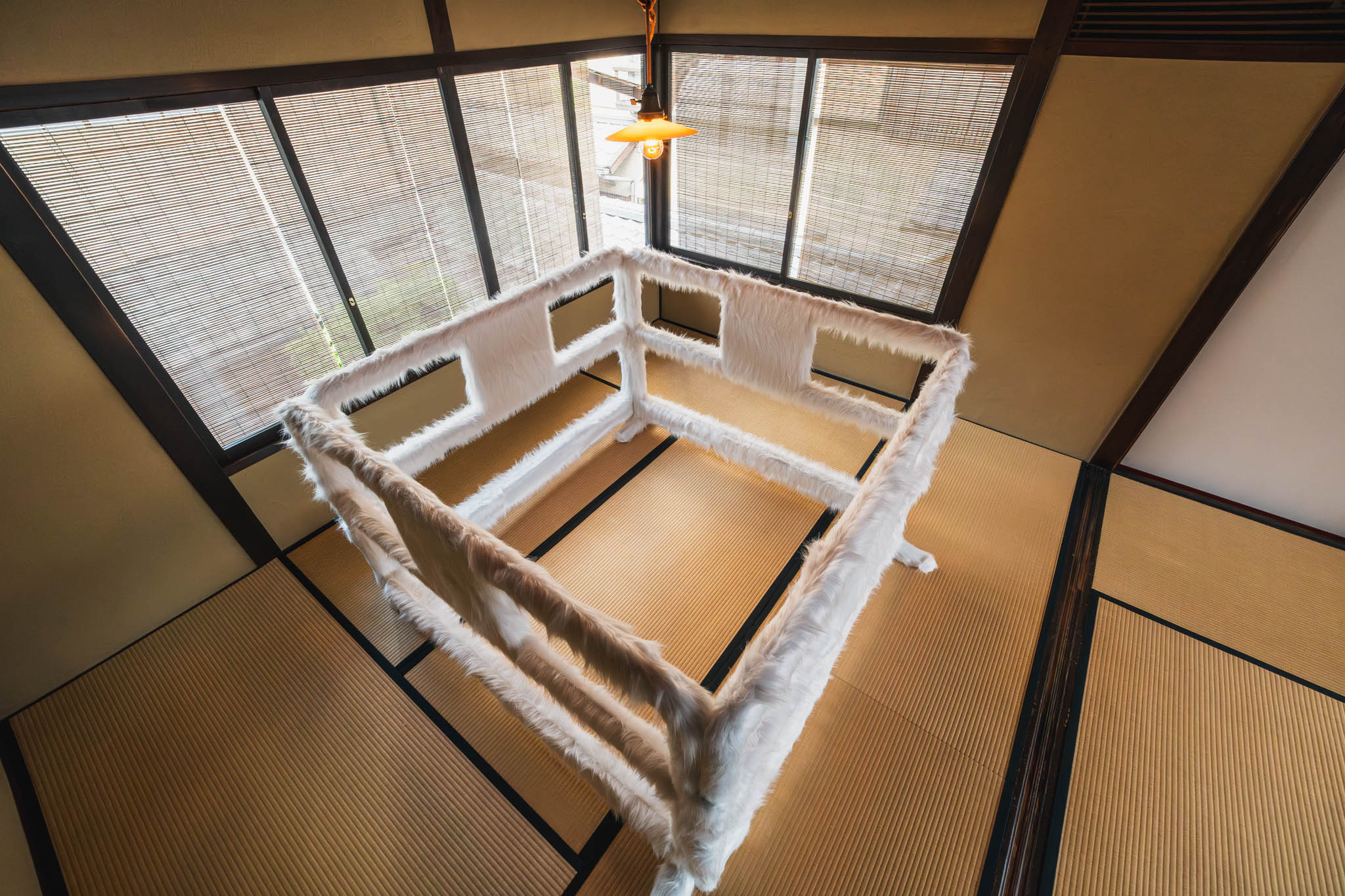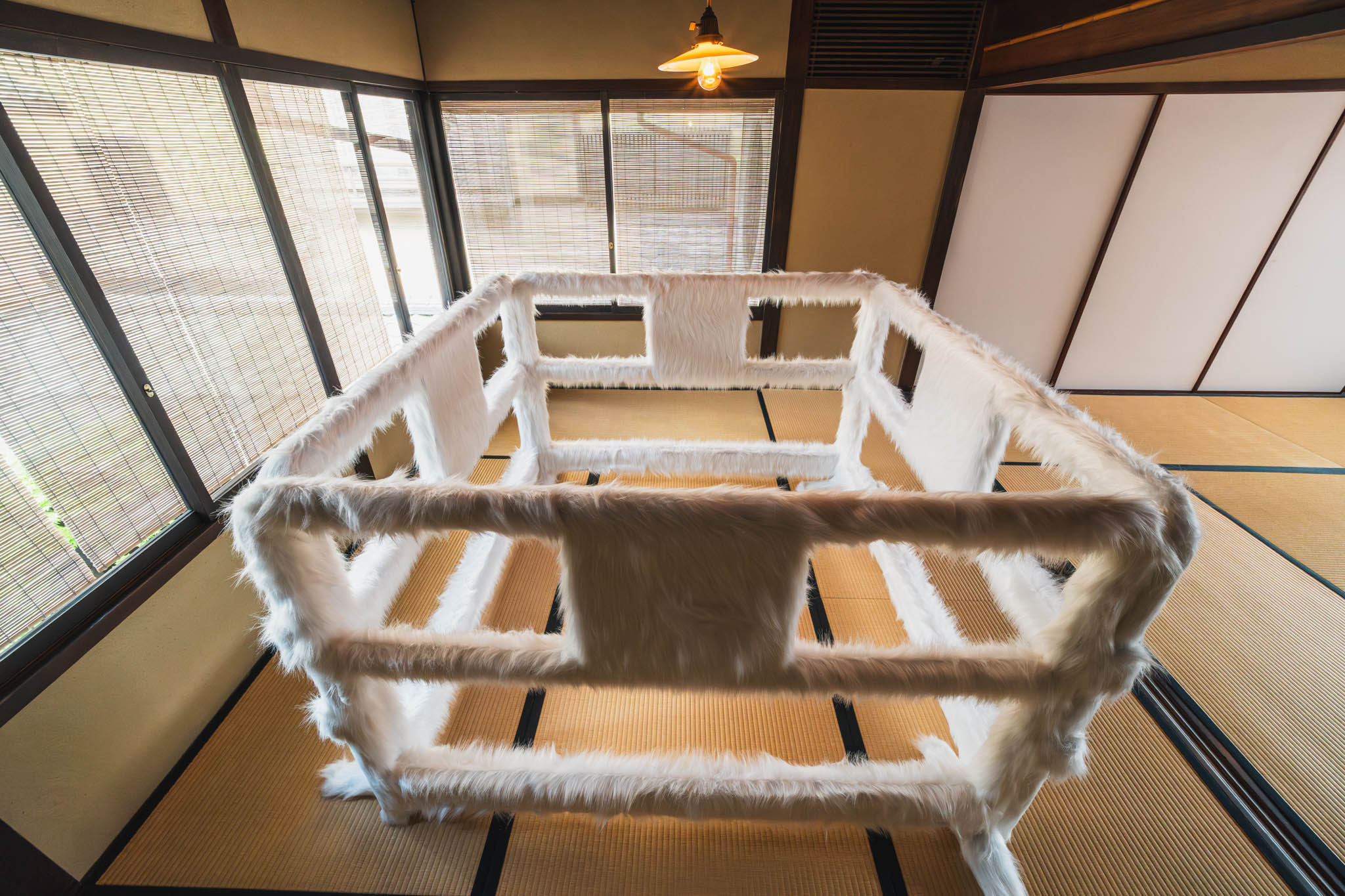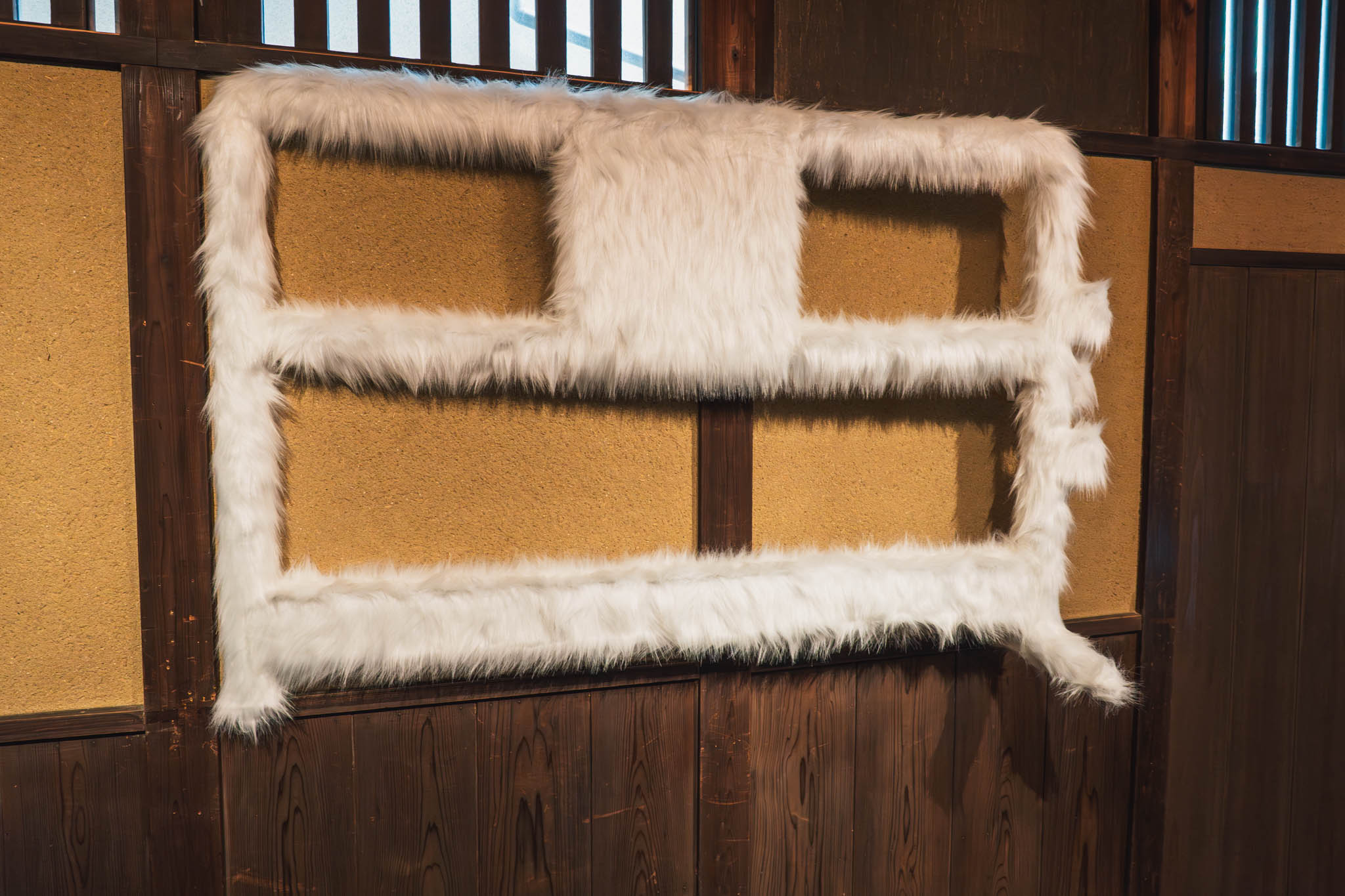 街中で見かける工事現場の保護バリケードや、人の動線を制限する柵。あの形状そのままに、ただし表面が真っ白なフェイクファーで覆われている、というオブジェです。