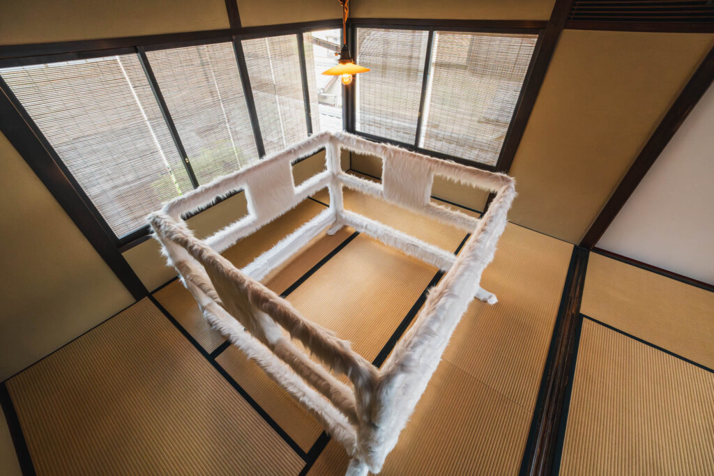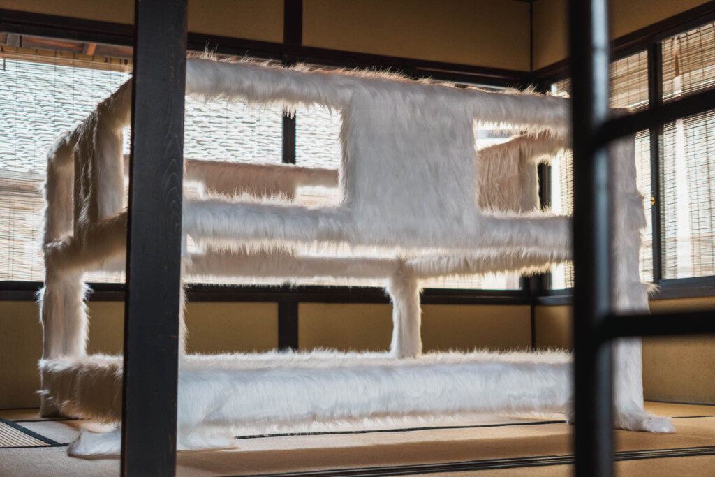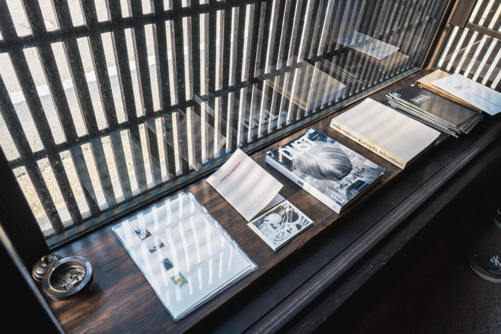 壁も天井も床も、ほとんどが白で構成されています。京都の町家らしい木の梁や柱、窓から差し込む自然光、そういった既存の空間要素は、ほぼそのままの状態で残されている。マルジェラは、京都ではギャラリー空間に手を加えていません。むしろ「空間に作品を置く」という、ある意味で正攻法の展示形式を選んでいます。