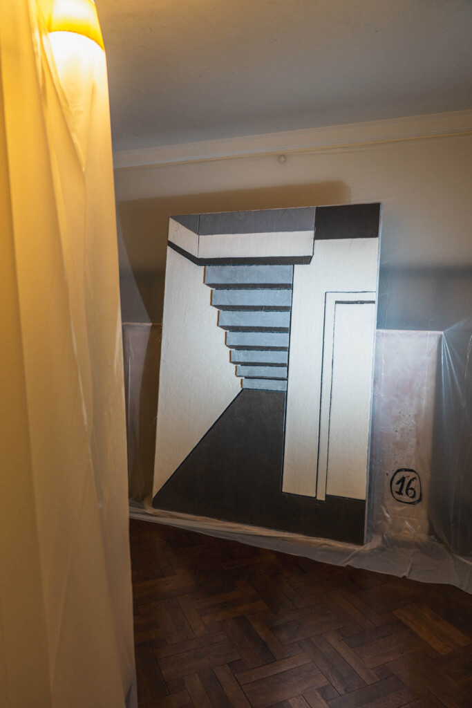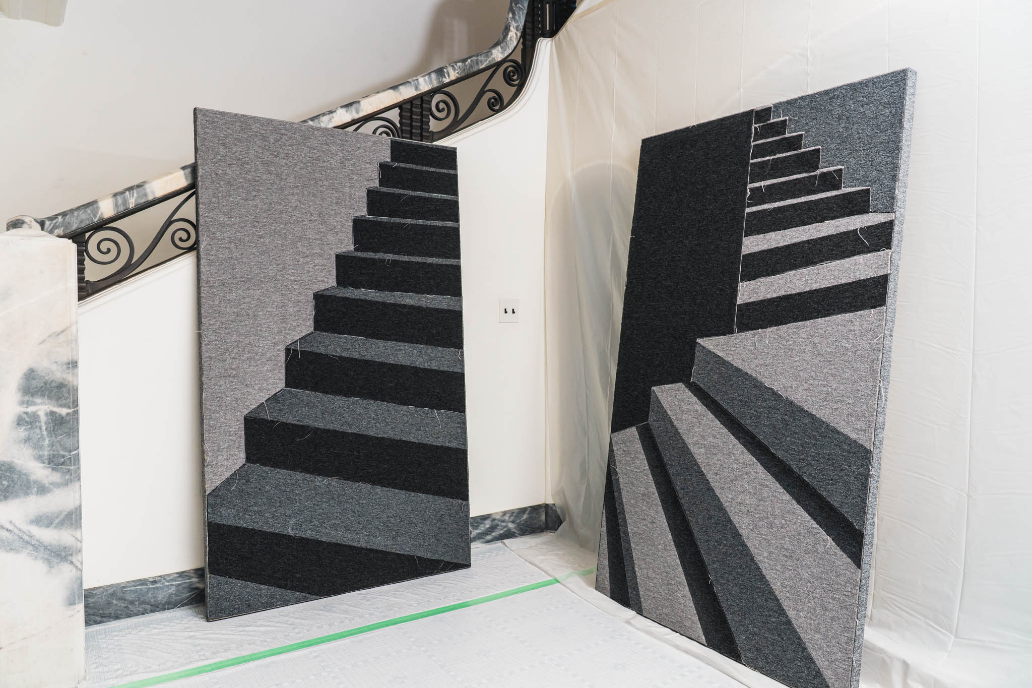 廊下の床、階段、壁、そして窓。九段ハウスの「主役級」とも言える美しい木製建具や格子窓まで、薄いビニールシートで覆われていたのです。まるで、内装工事の養生がそのまま展示物になっているような状態。